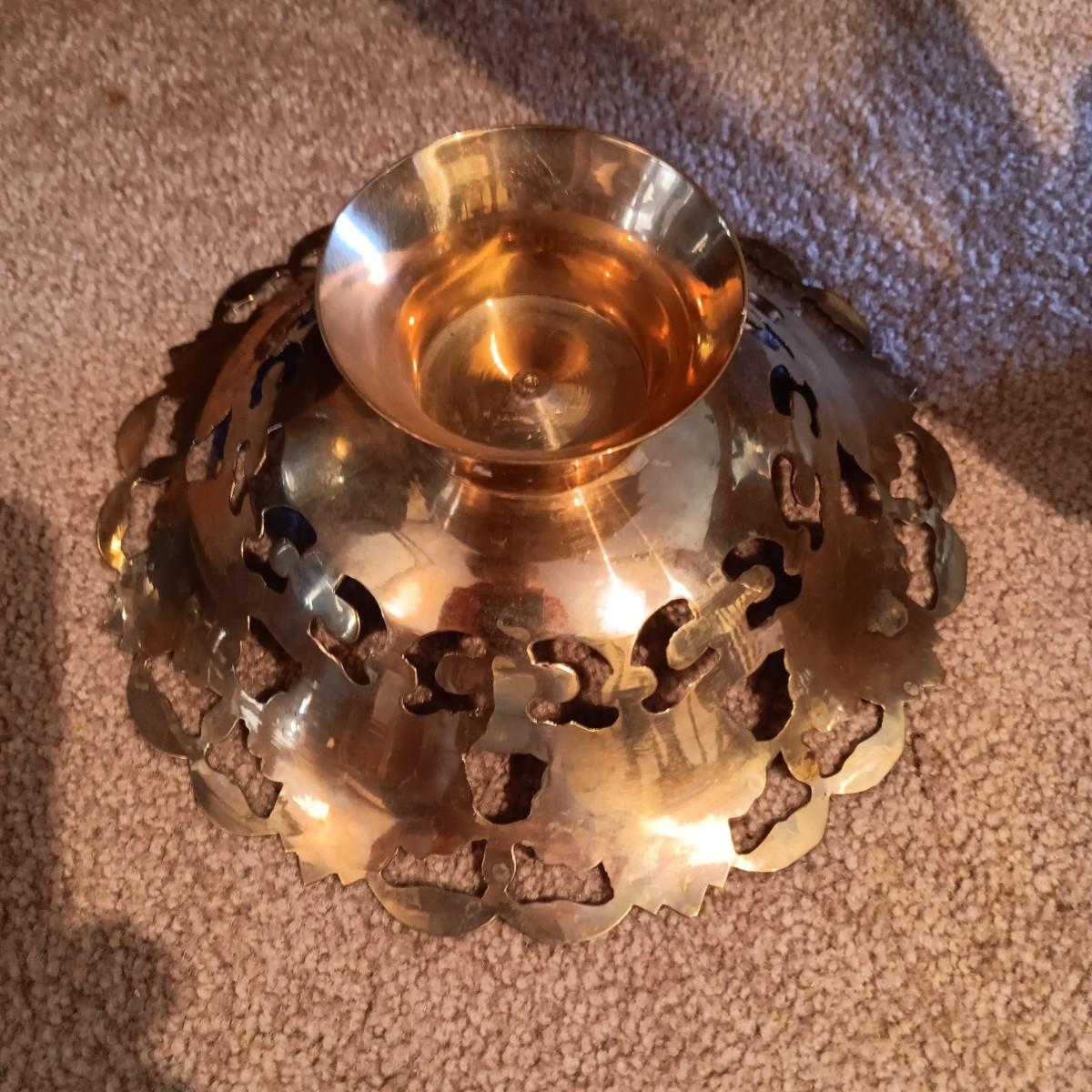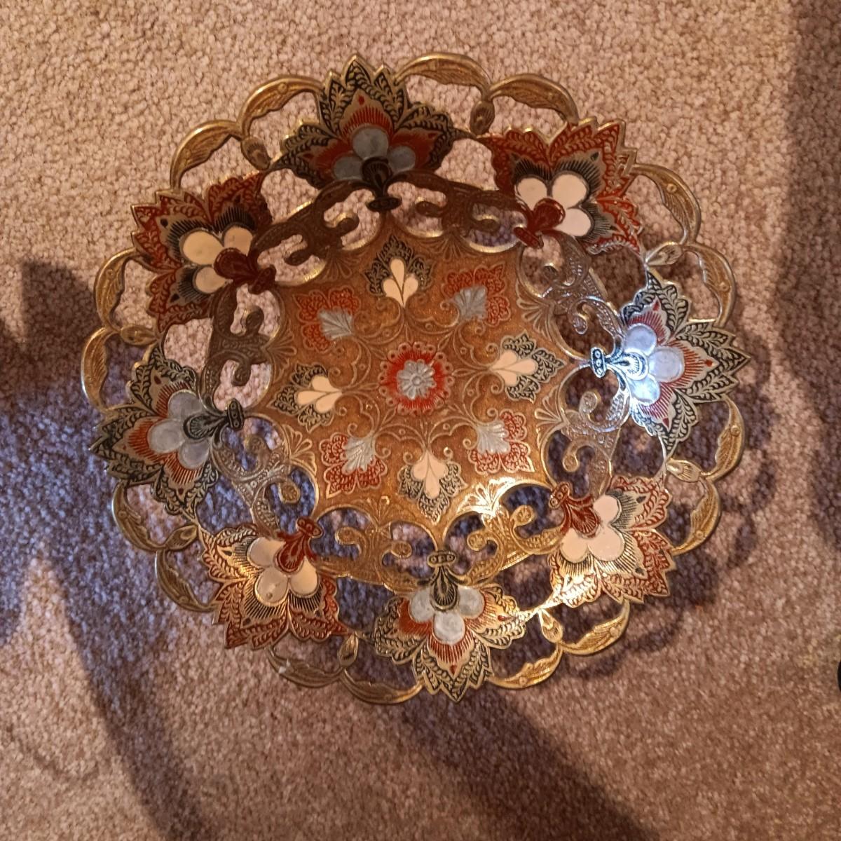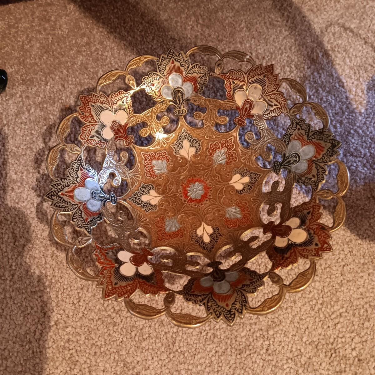 SMALLER BRASS DECANTER AND STEMMED CUPS ON A BRASS TRAY PLUS A COLORIZED BRASS BOWL