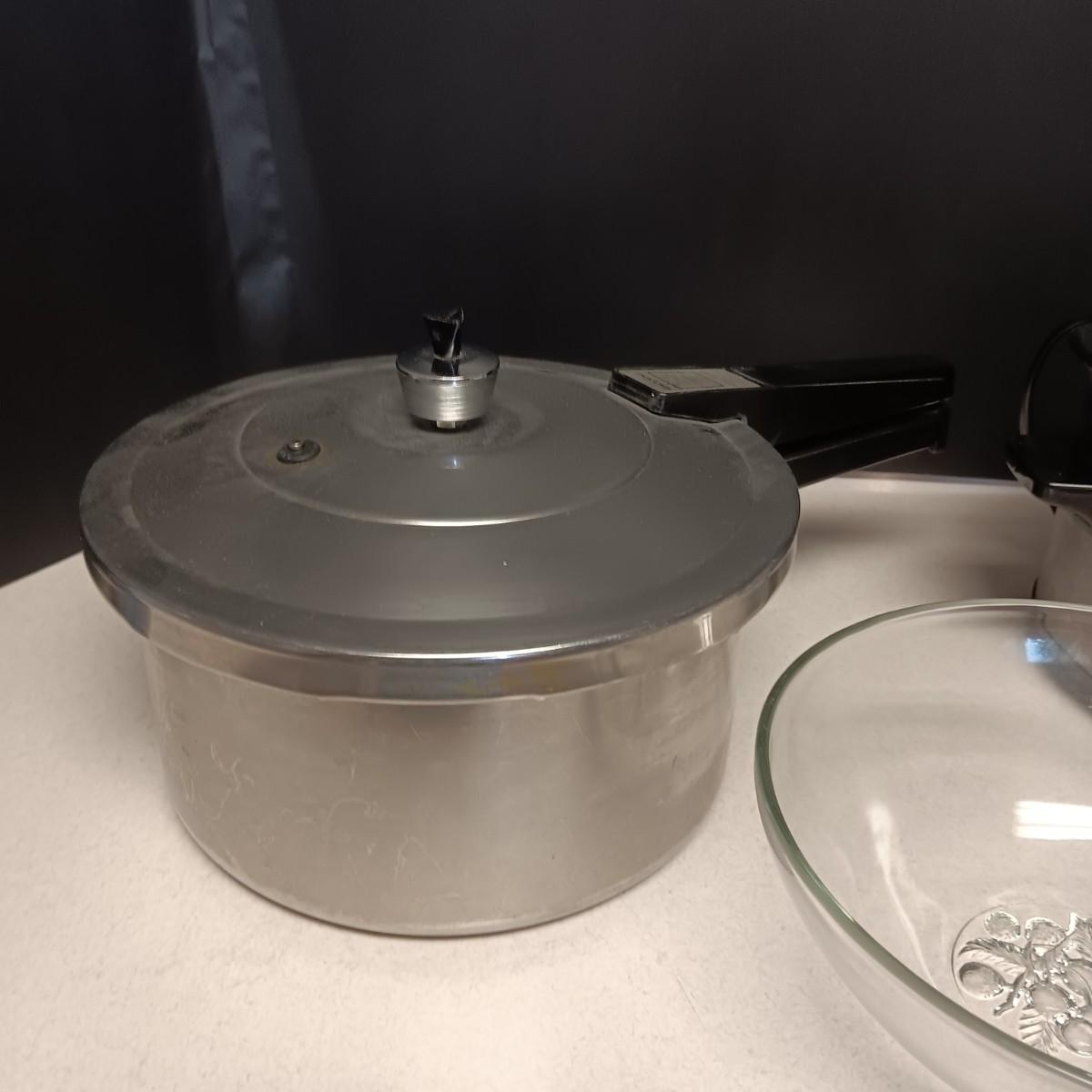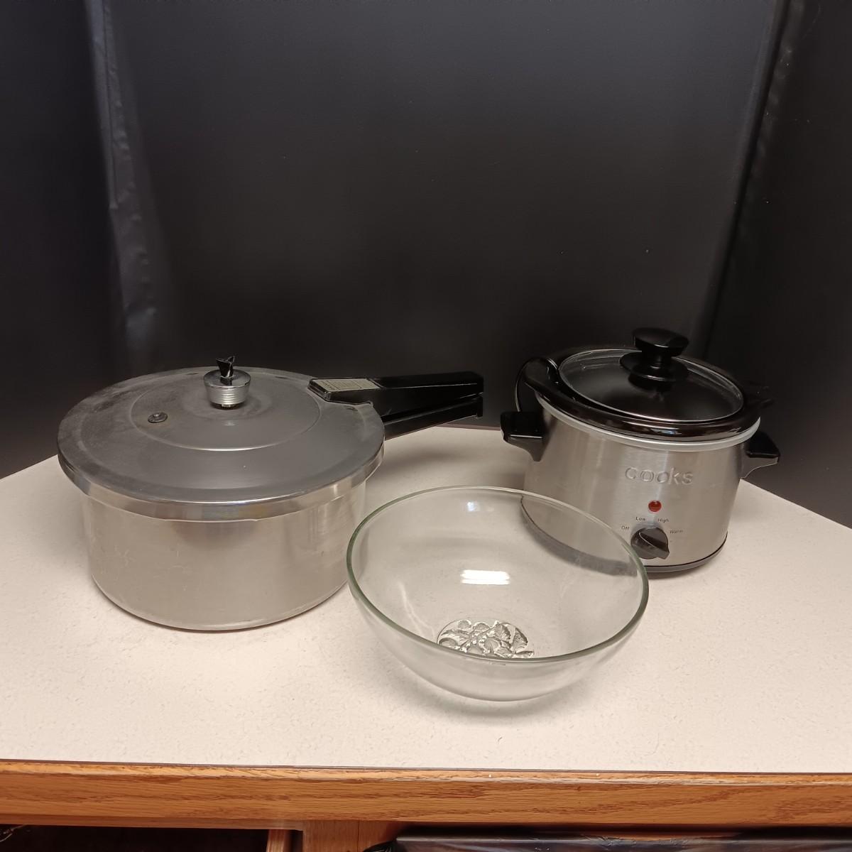 SMALLER CROCK POT, PRESSURE COOKER AND A SERVING BOWL