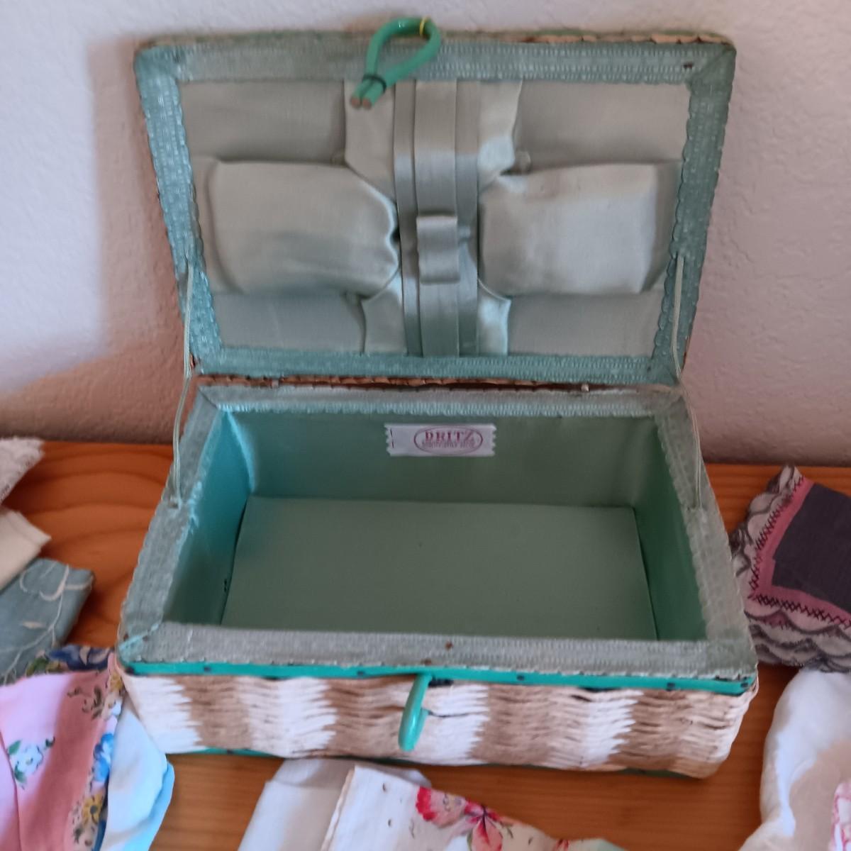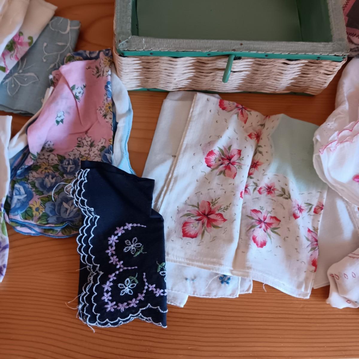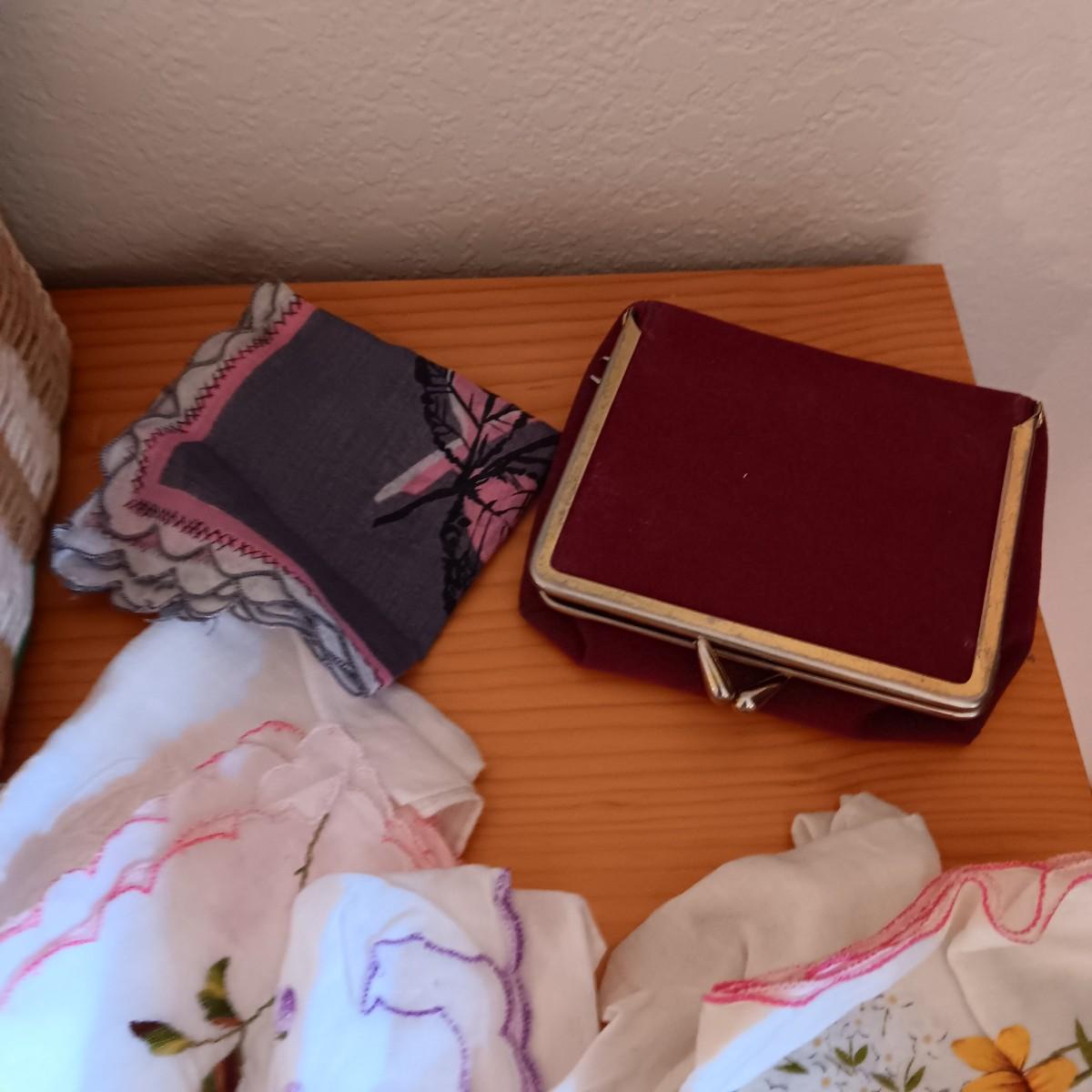 SMALLER SEWING BOX FILLED WITH HANKIES AND A VINTAGE COIN PURSE
