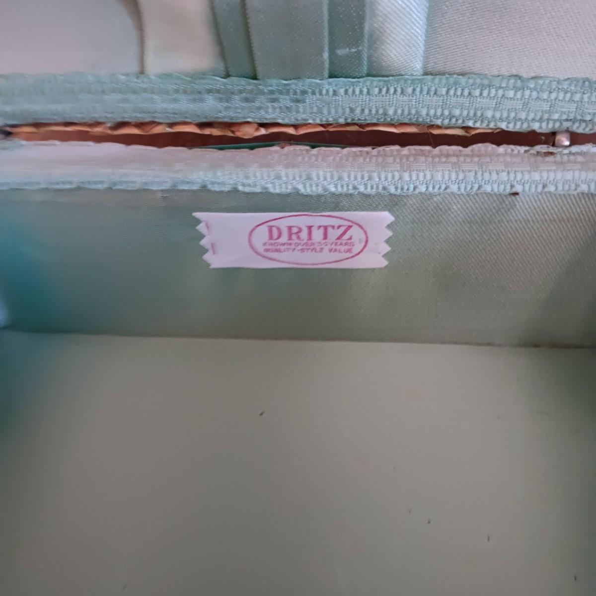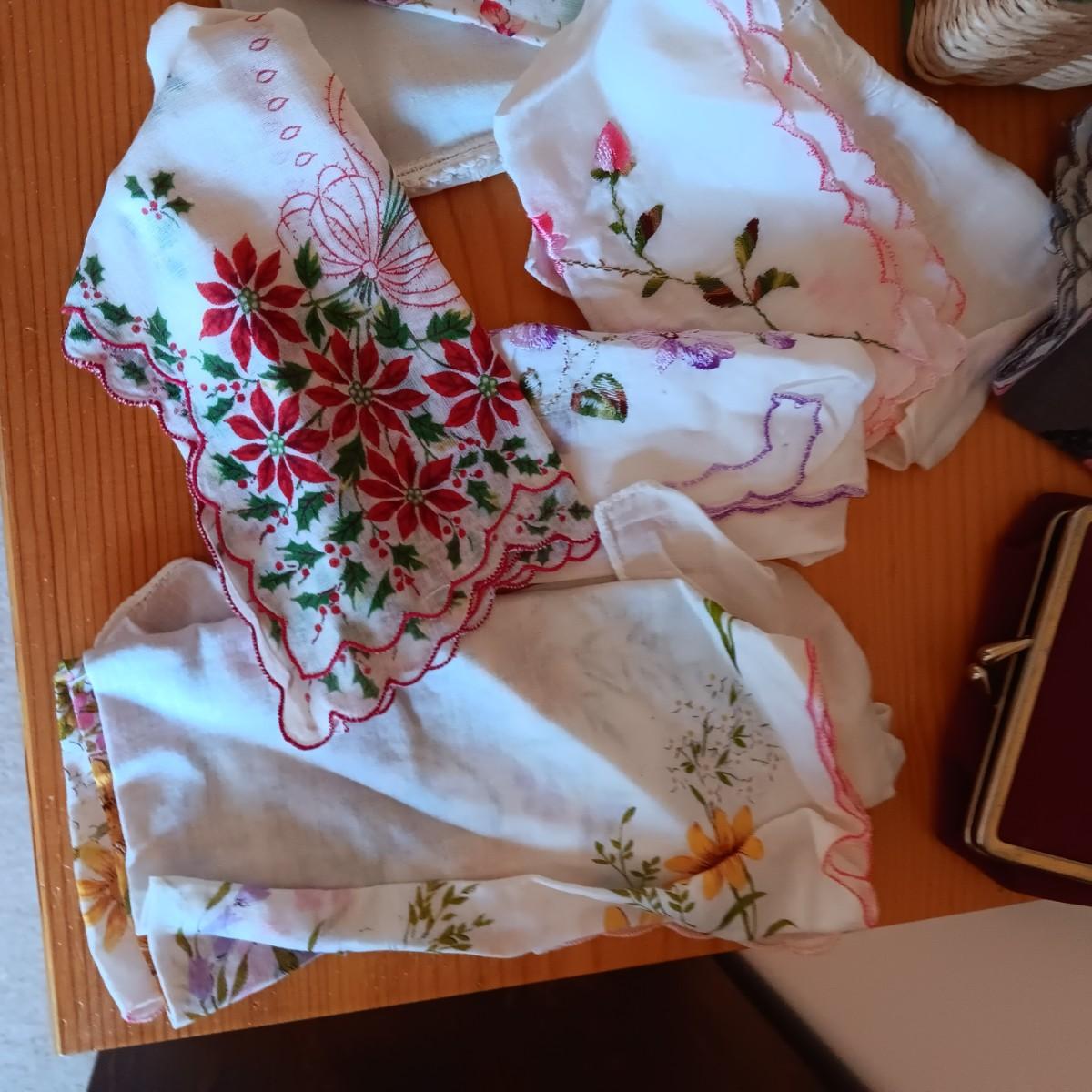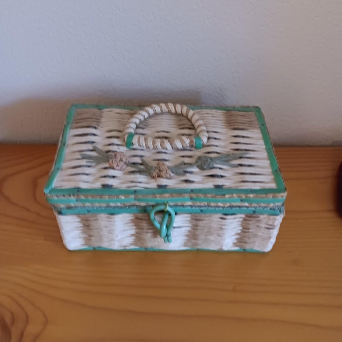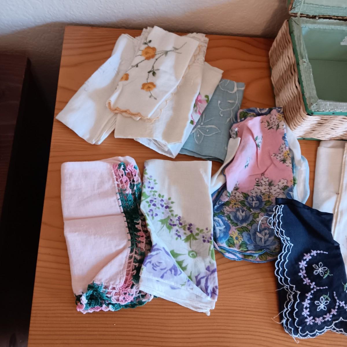 SMALLER SEWING BOX FILLED WITH HANKIES AND A VINTAGE COIN PURSE