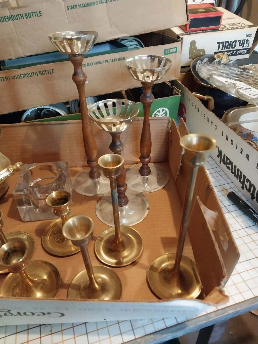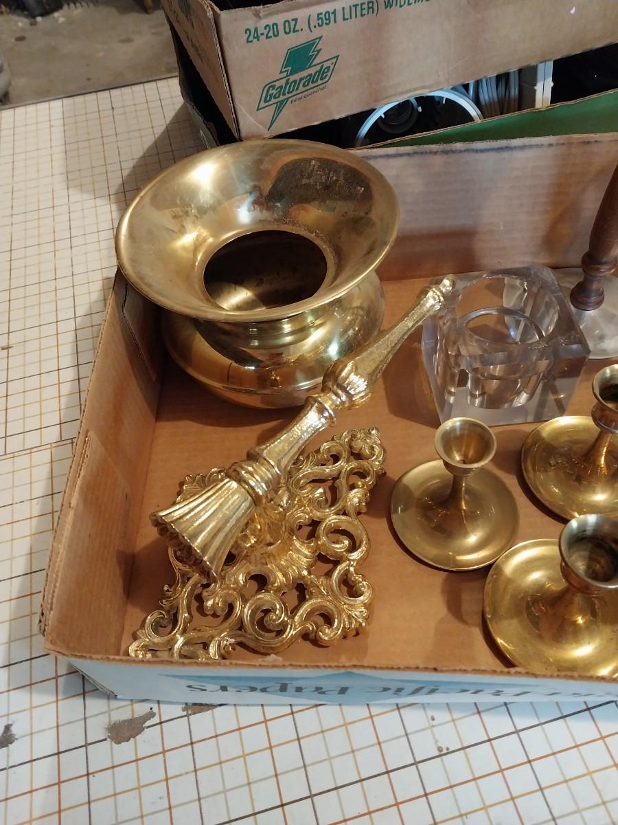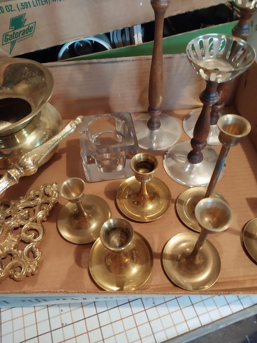 SMALLER SPITOON, BRASS AND OTHER CANDLE HOLDERS