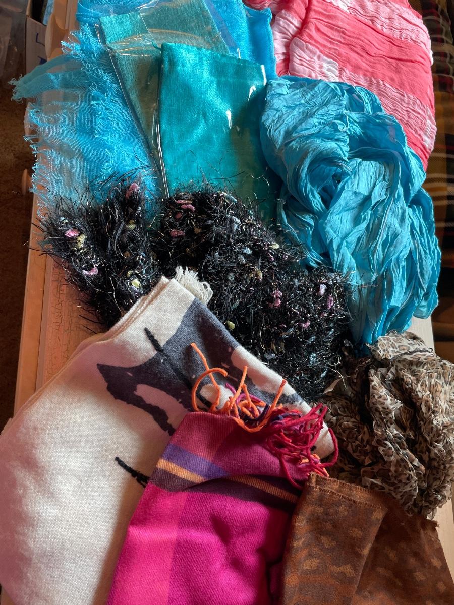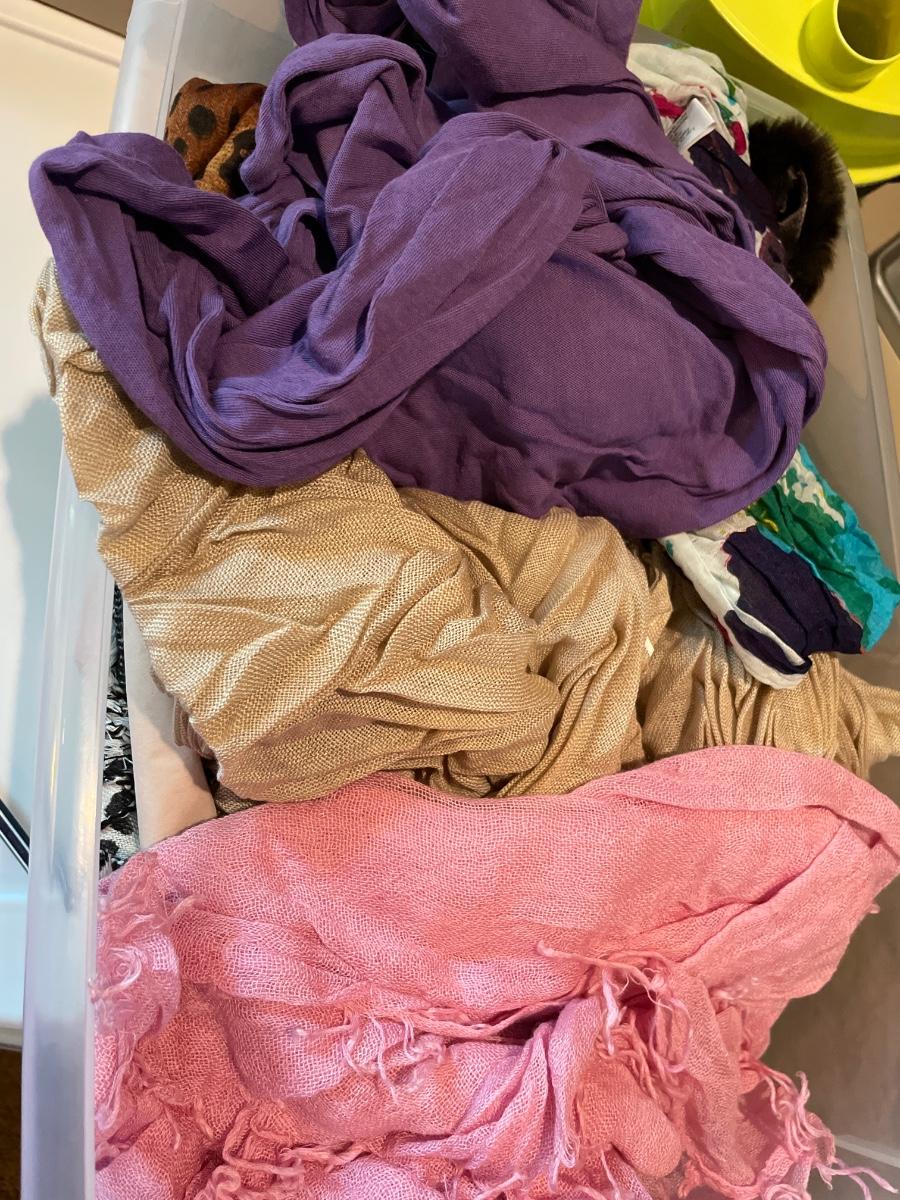 Many scarves in a tote