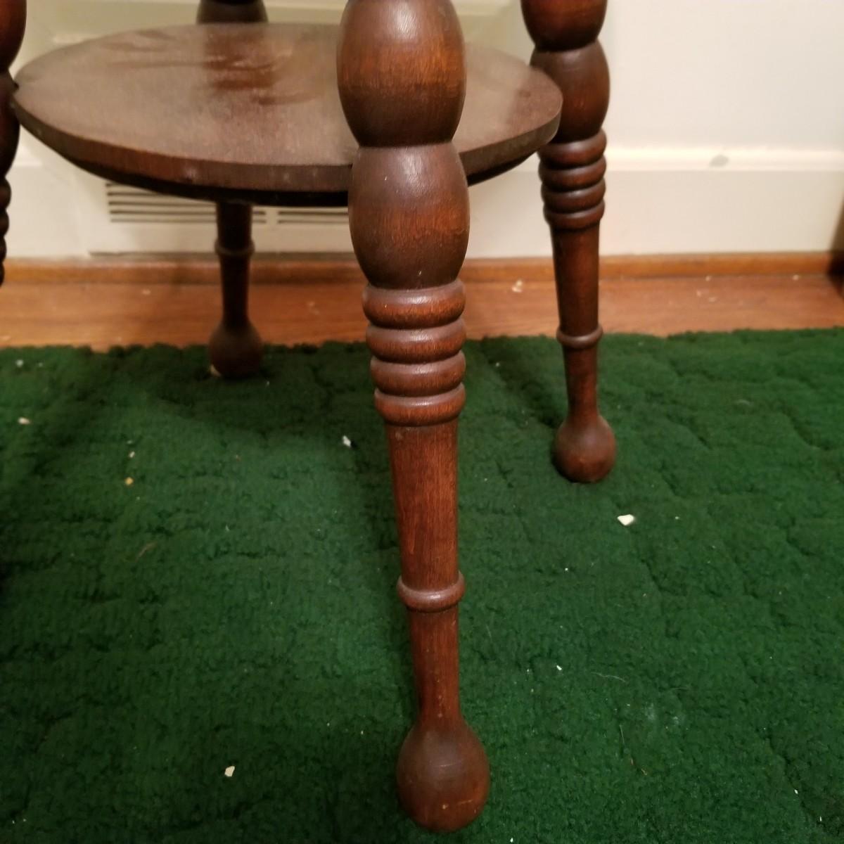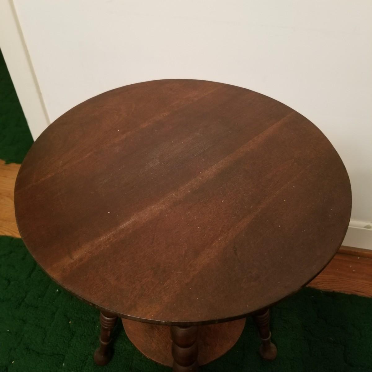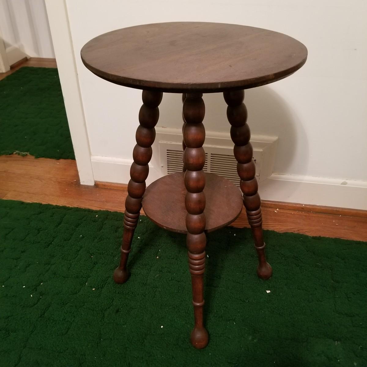 Solid wood side table with round top. Decorative turned legs and small lower shelf. 24"h x 16"d top. Good condition. Local pickup only.