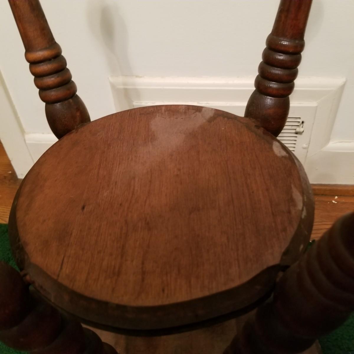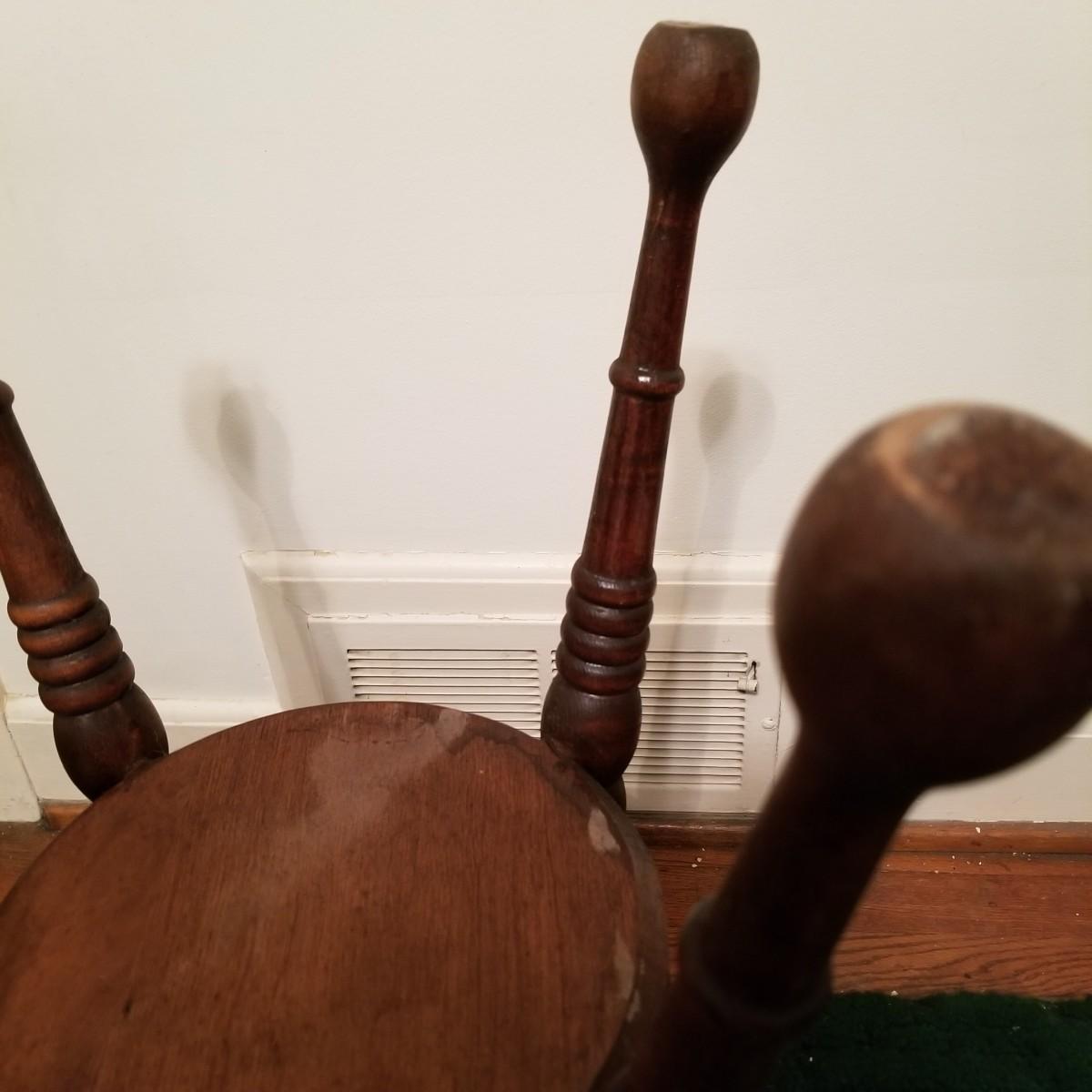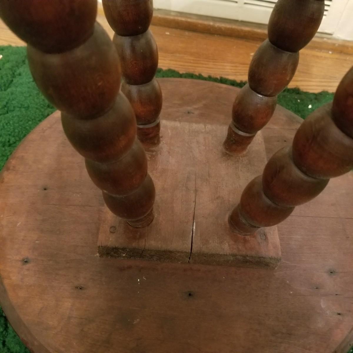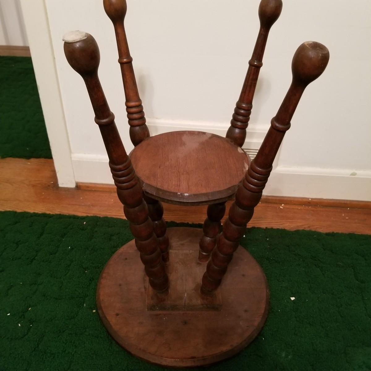 Solid wood side table with round top. Decorative turned legs and small lower shelf. 24"h x 16"d top. Good condition. Local pickup only.