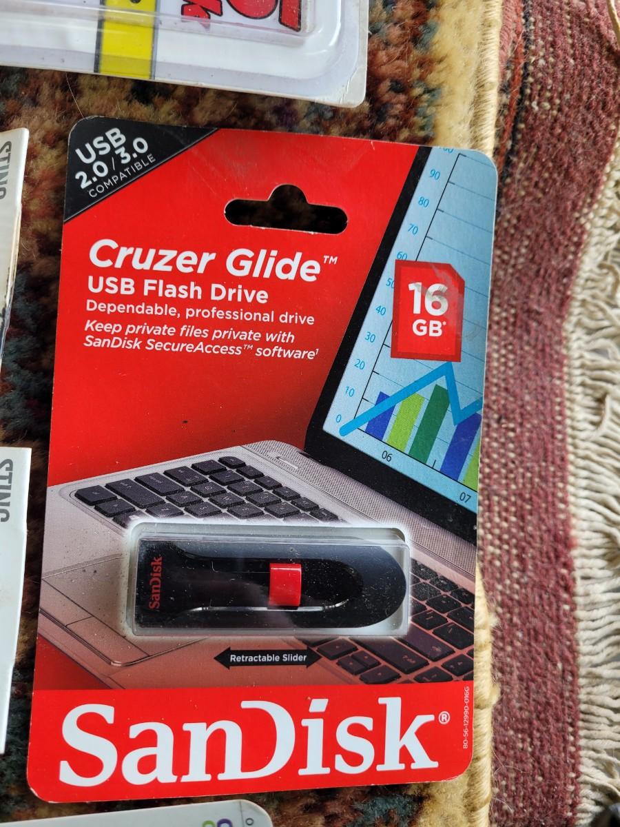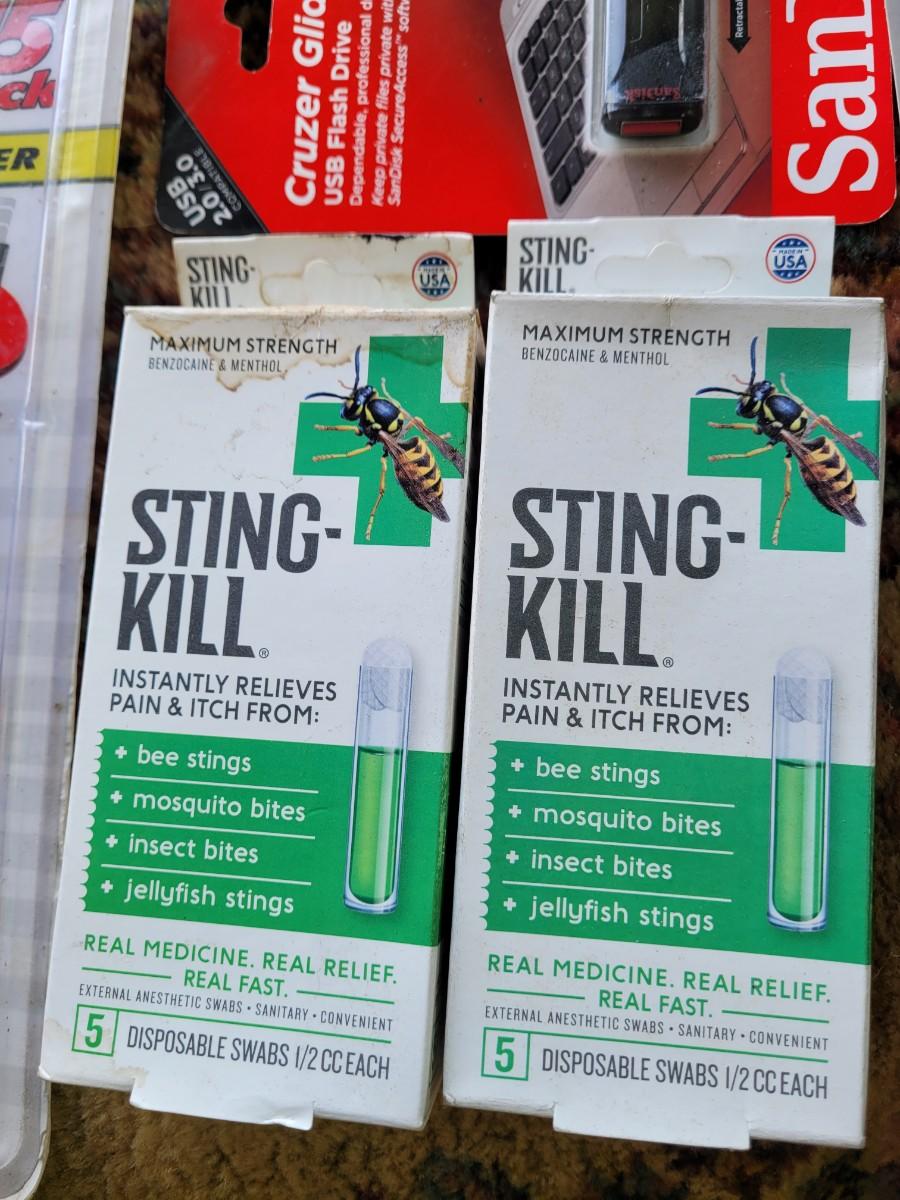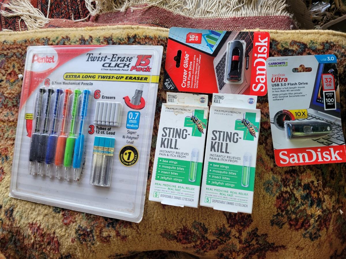 None are opened or used all have storage Ware flash drives are 32 GB and 16 GB 10 total bee sting swabs and mechanical pencil set as pictured