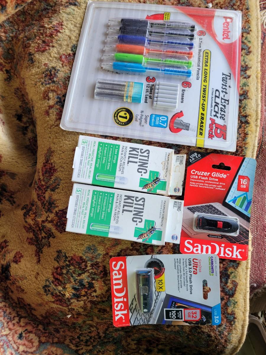 Smalls New mechanical pencils, wasp/bee sting swabs, flash drives