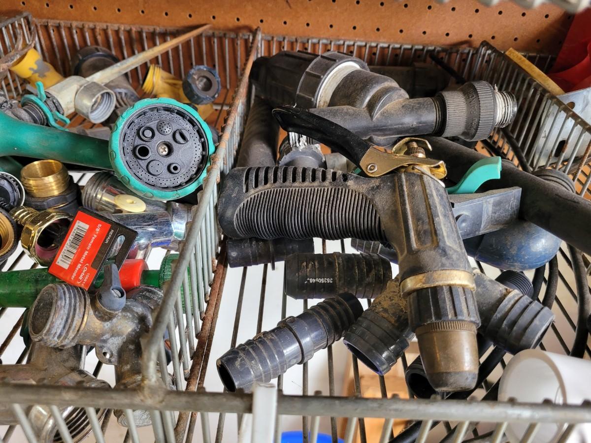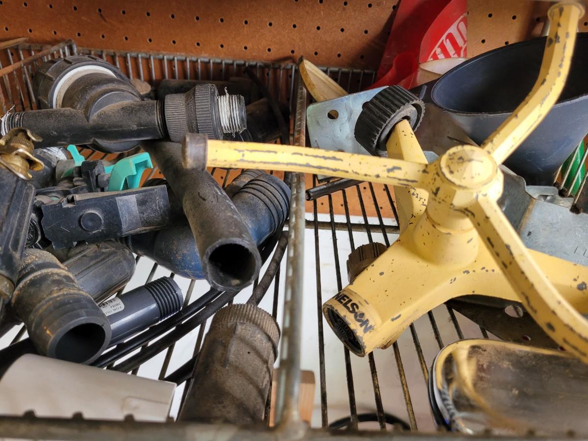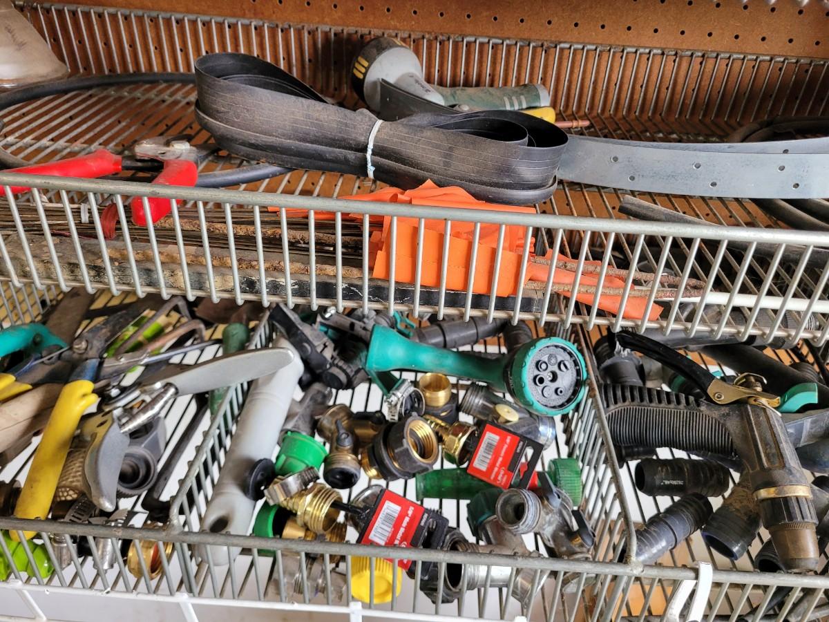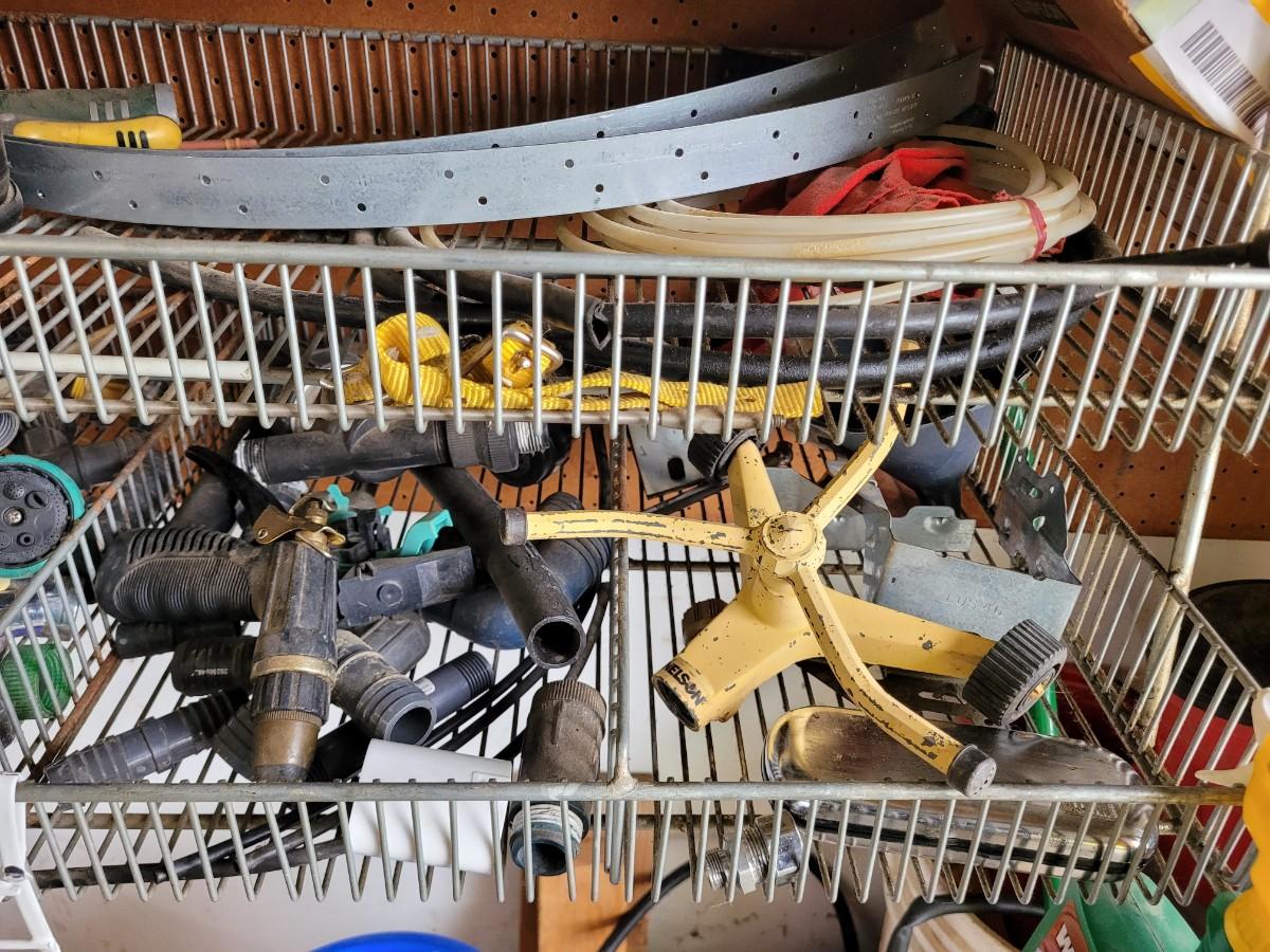 Straps, hose mender, sprayers, tubing, nippers, plugs, flags, seeds, everything on those two shelves. Not the shelves themselves though. In garage