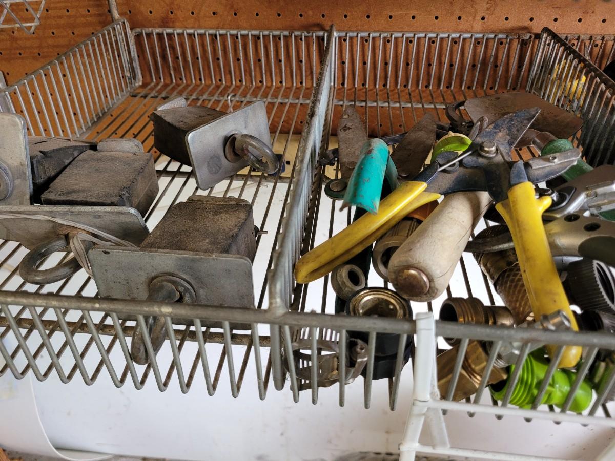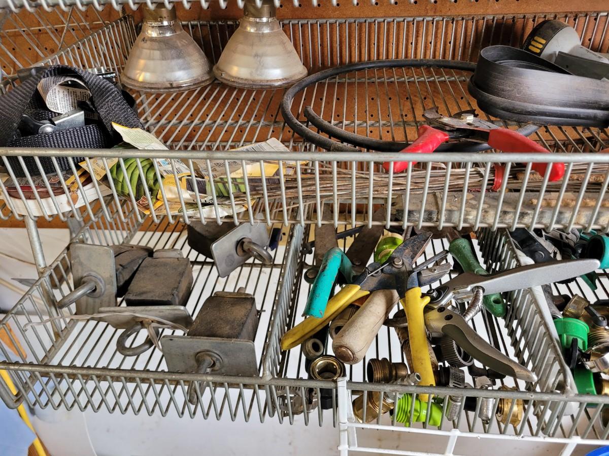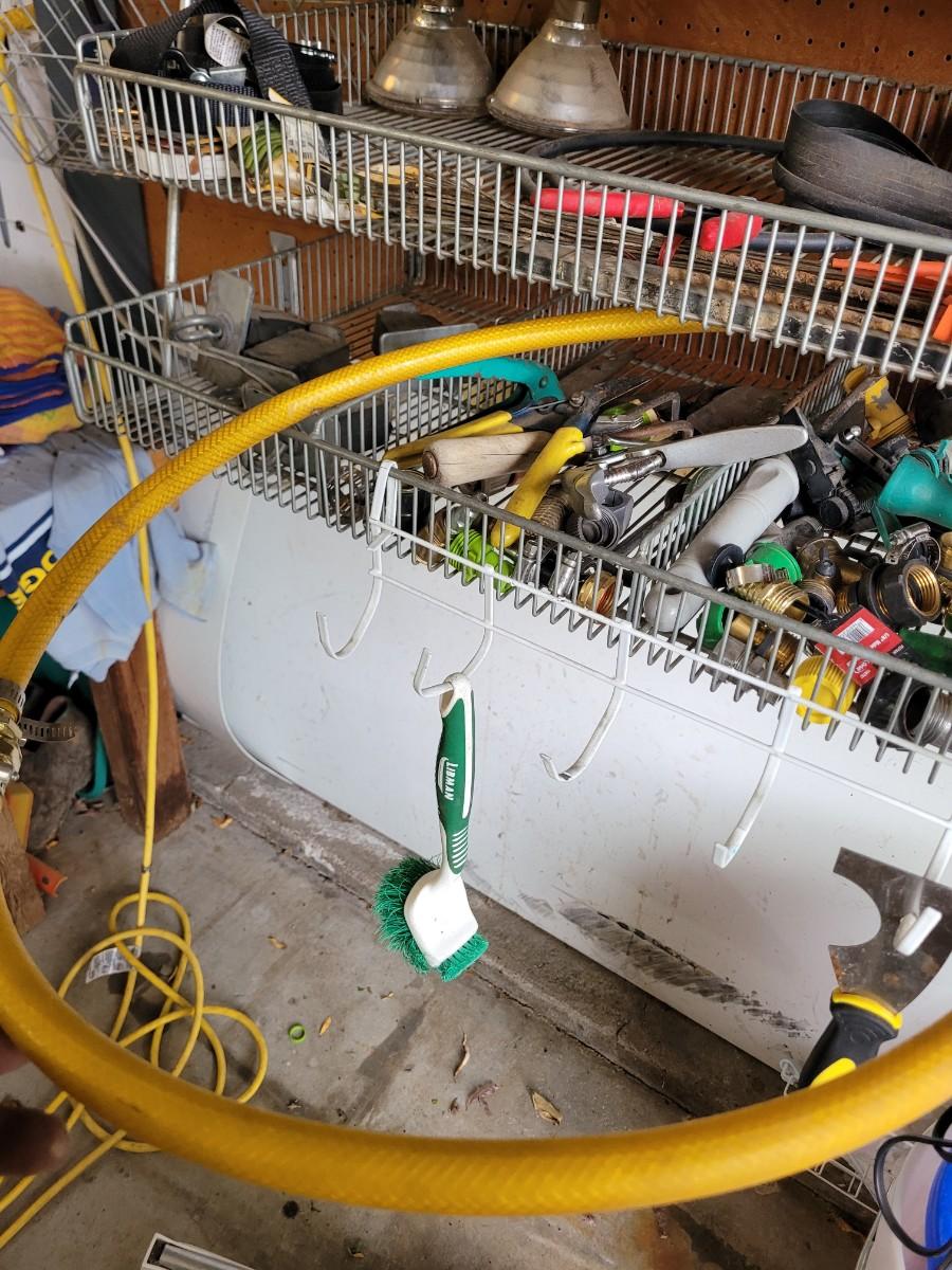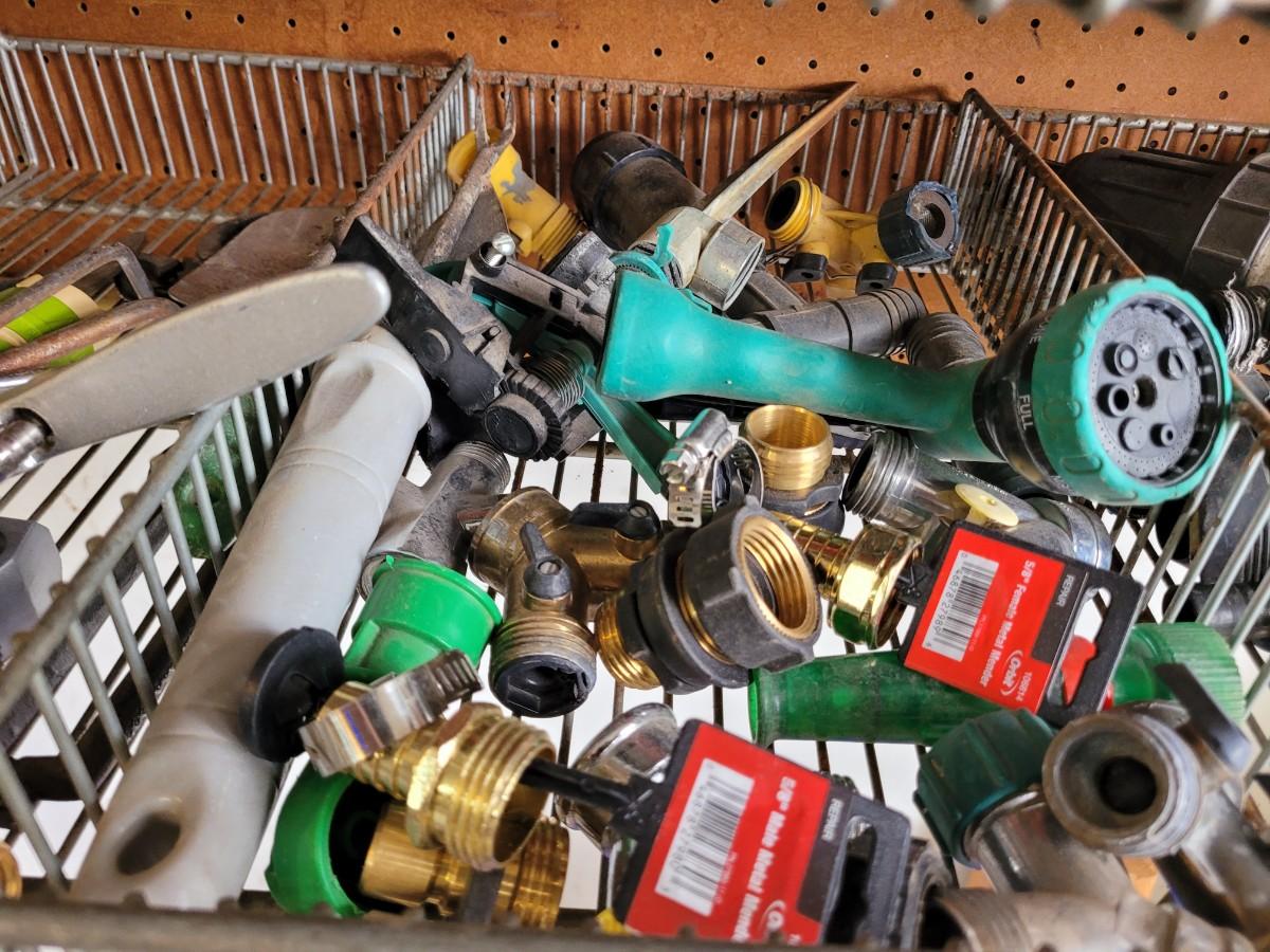 Straps, hose mender, sprayers, tubing, nippers, plugs, flags, seeds, everything on those two shelves. Not the shelves themselves though. In garage