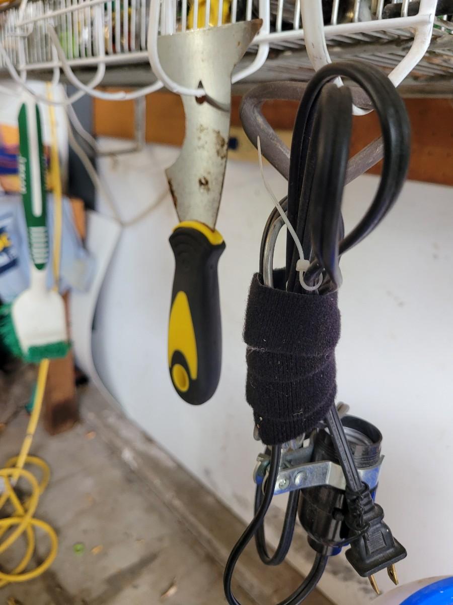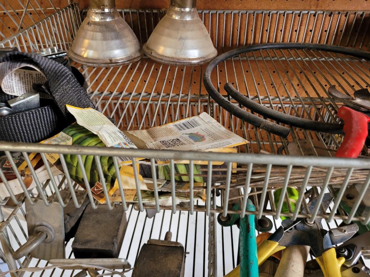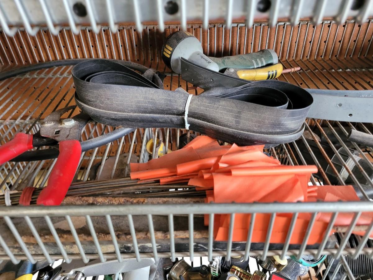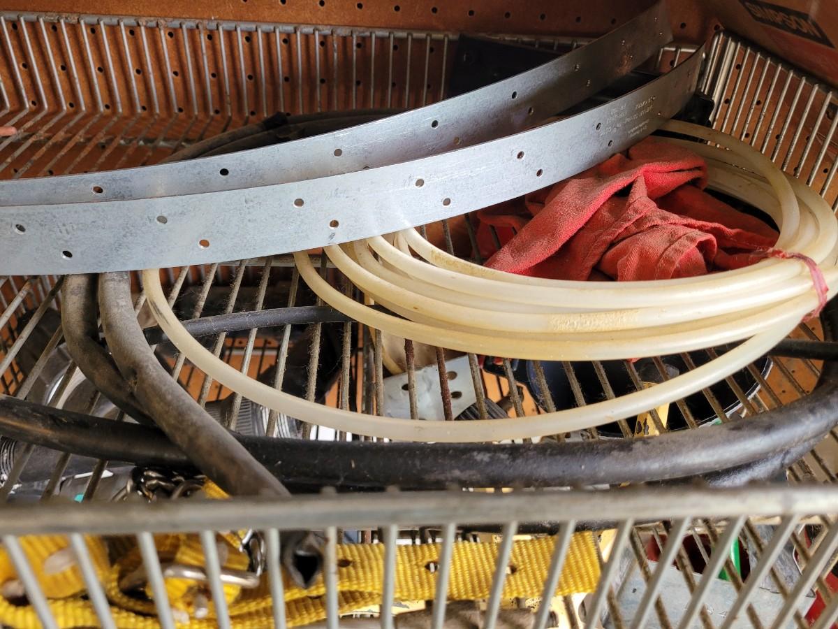 Straps, hose mender, sprayers, tubing, nippers, plugs, flags, seeds, everything on those two shelves. Not the shelves themselves though. In garage