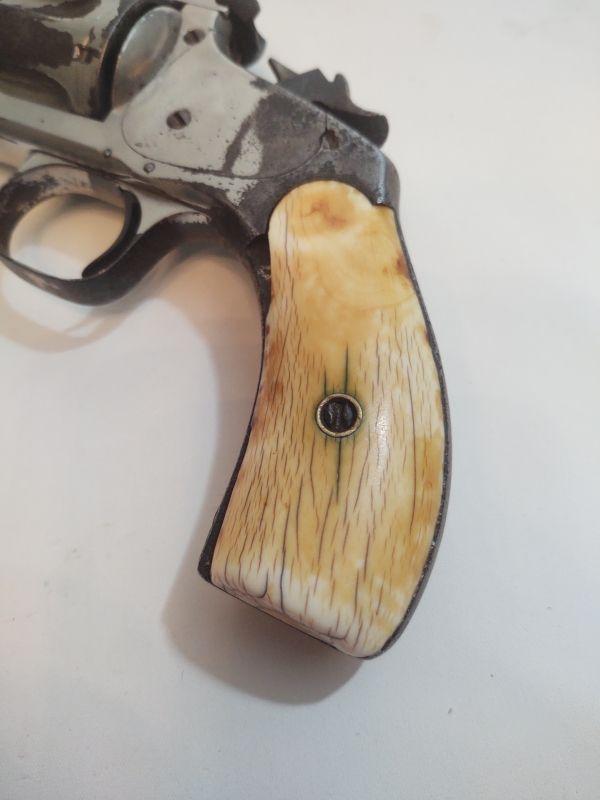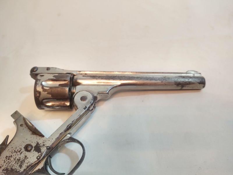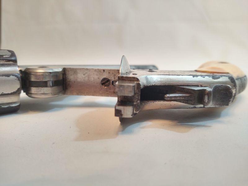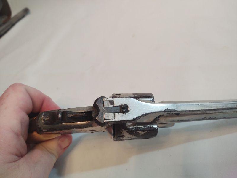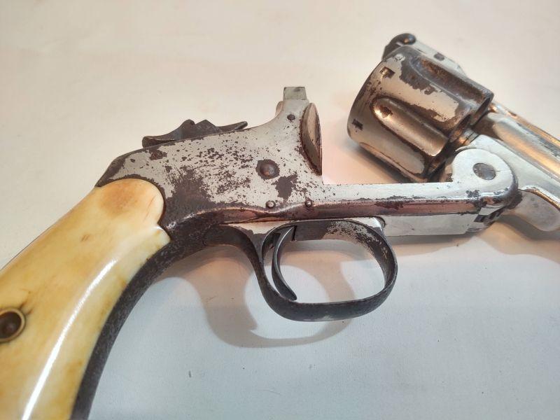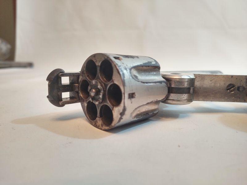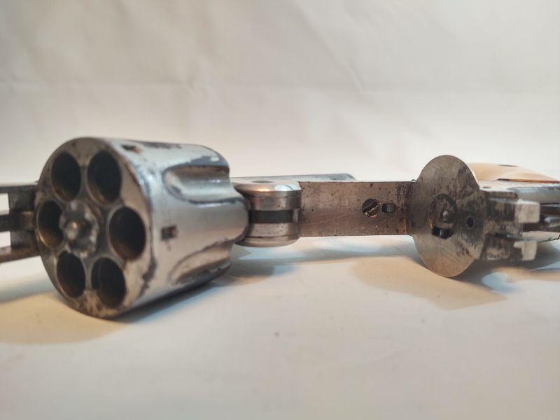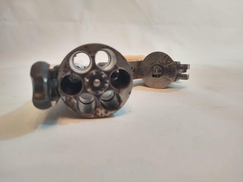 Front opening revolver has a serial number on the butt, but it's worn to the point of being non-readable. Trademark on top of frame is worn as well. Caliber cannot be read, but these were acquired with the other .38 revolvers and could possibly be .38 caliber as well. If someone has more information than we do, I would appreciate an email with any info available. Special terms & conditions for firearms will apply to this lot. Shipping is being offered. Here are the terms & conditions for firearms: TO PURCHASE ANY OF THE FIREARMS IN THIS AUCTION, YOU MUST BE LEGALLY QUALIFIED TO PURCHASE A FIREARM IN YOUR STATE. IF YOU CANNOT LEGALLY PURCHASE A FIREARM, DO NOT BID!!
