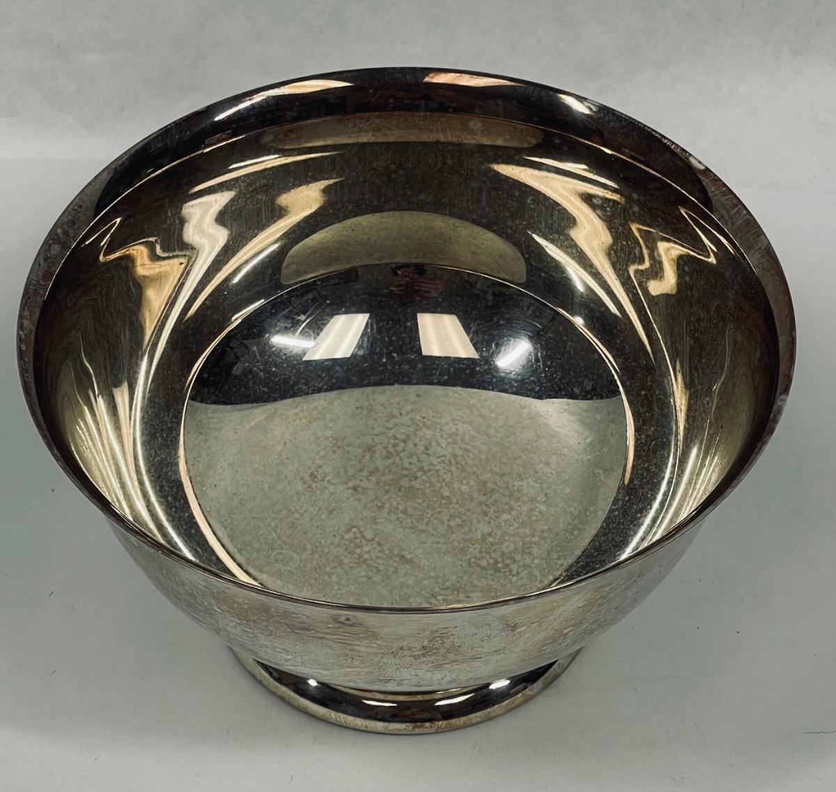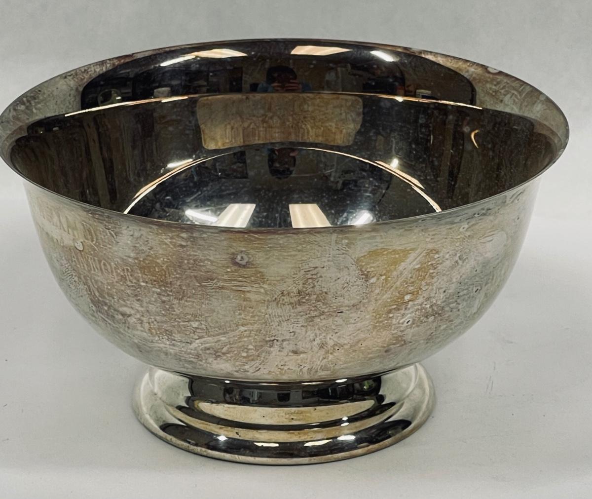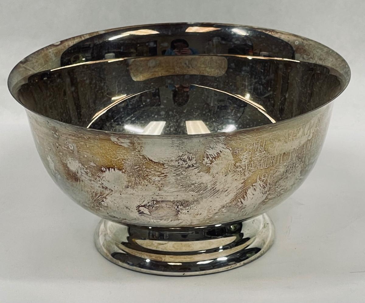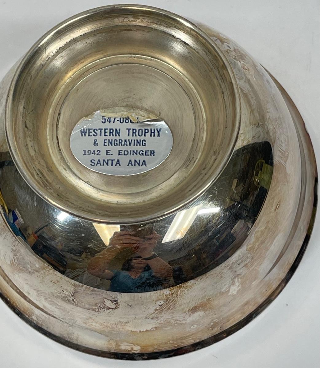 Small silver-plated trophy bowl from 1976. Sticker on bottom indicates it was sold through the Western Trophy & Engraving company in Santa Ana, California. Engraved inscription is for winning an award for a 1912 Indian Motorcycle.