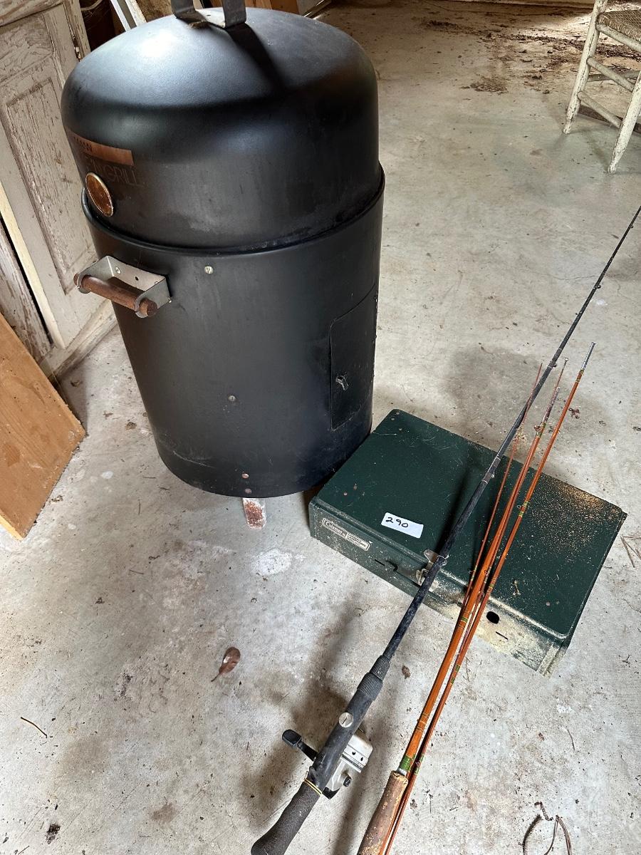 SMOKER, STOVE, FISHING GEAR AS PICTURED