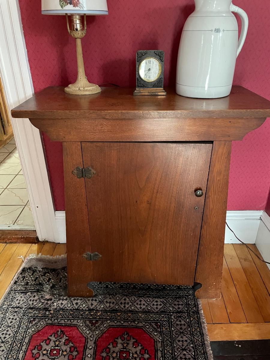 This beautiful cabinet looks as if it may have been a smoking cabinet as the holes on the inside of the door may have held pipes? It is in very nice condition, measures 28.5” wide x 14” deep x 30” high.