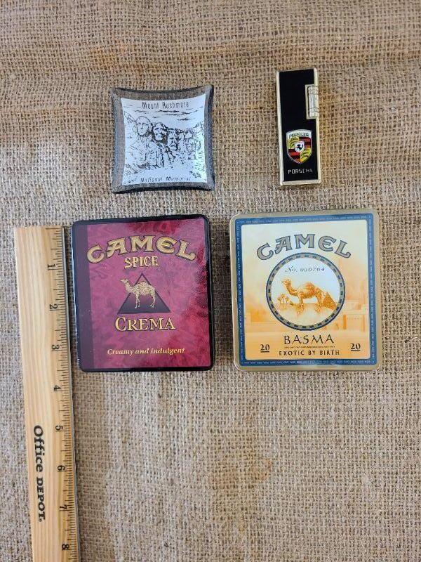 2 Camel cigarette tins, 1 Porsche BBC Korea lighter, & and Mt. Rushmore ashtray