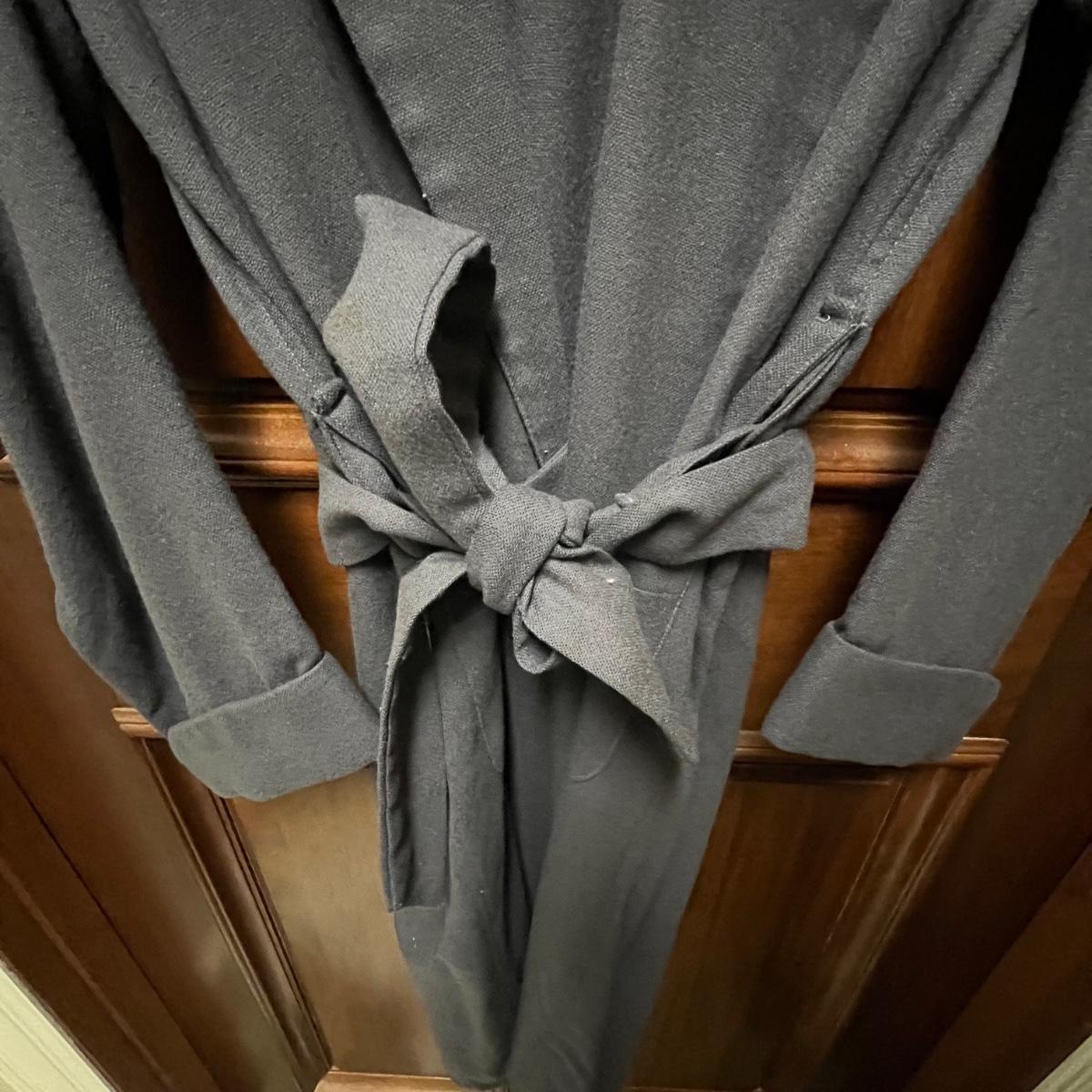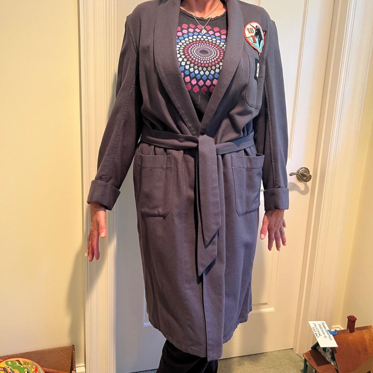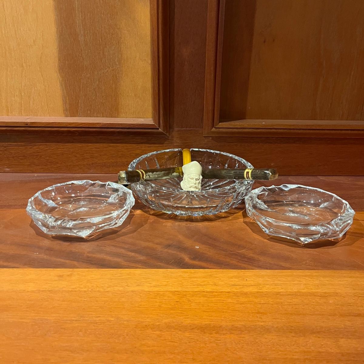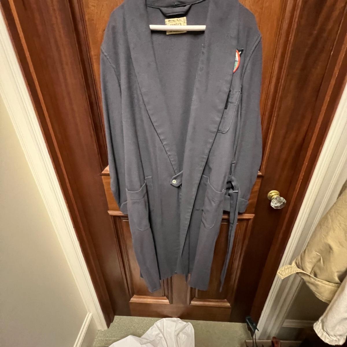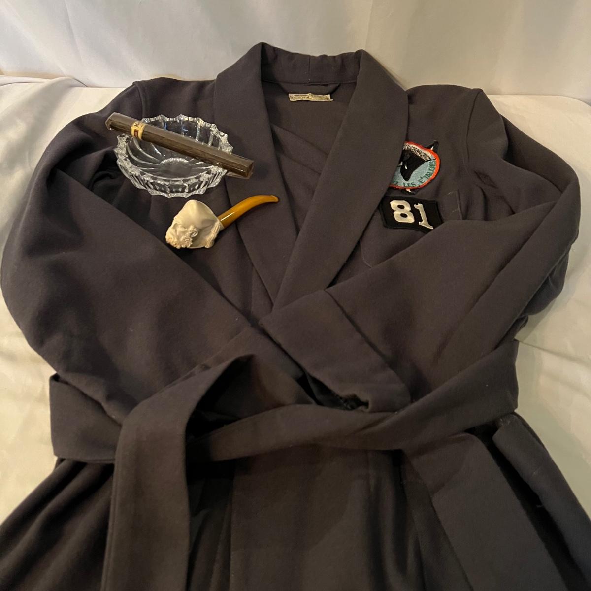 This vintage smoking jacket has no material tag but has a wool feel to its grey fabric. Also no size label but appears to be a medium or large. Sew on patches have been added, see images. Also included is a collection of five glass ashtrays two hand made cigars from Nicaragua and a pipe that appears to be resin. Largest ashtray measures 8”D x 2”H. Jacket measures 20” chest x 43” long.