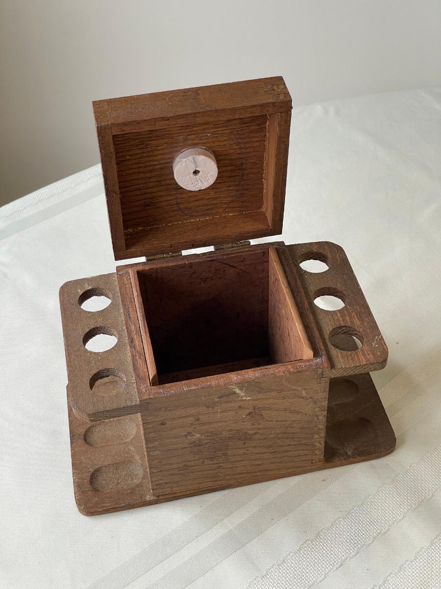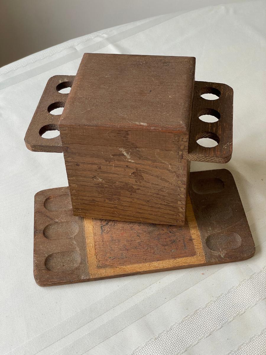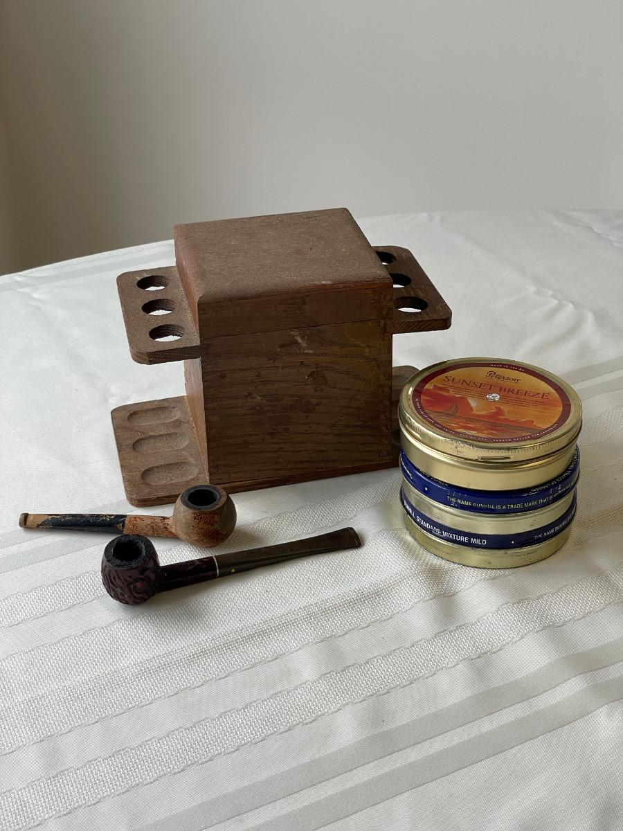 Pipe stand measures approximately 5.5” tall (base needs re-glued). 2 Pipes. 3 tobacco tins (empty).