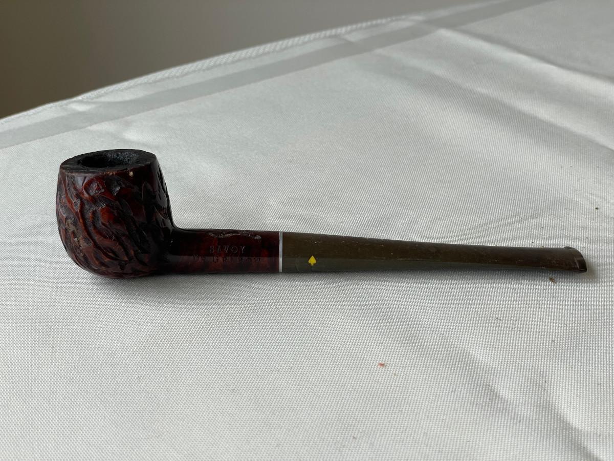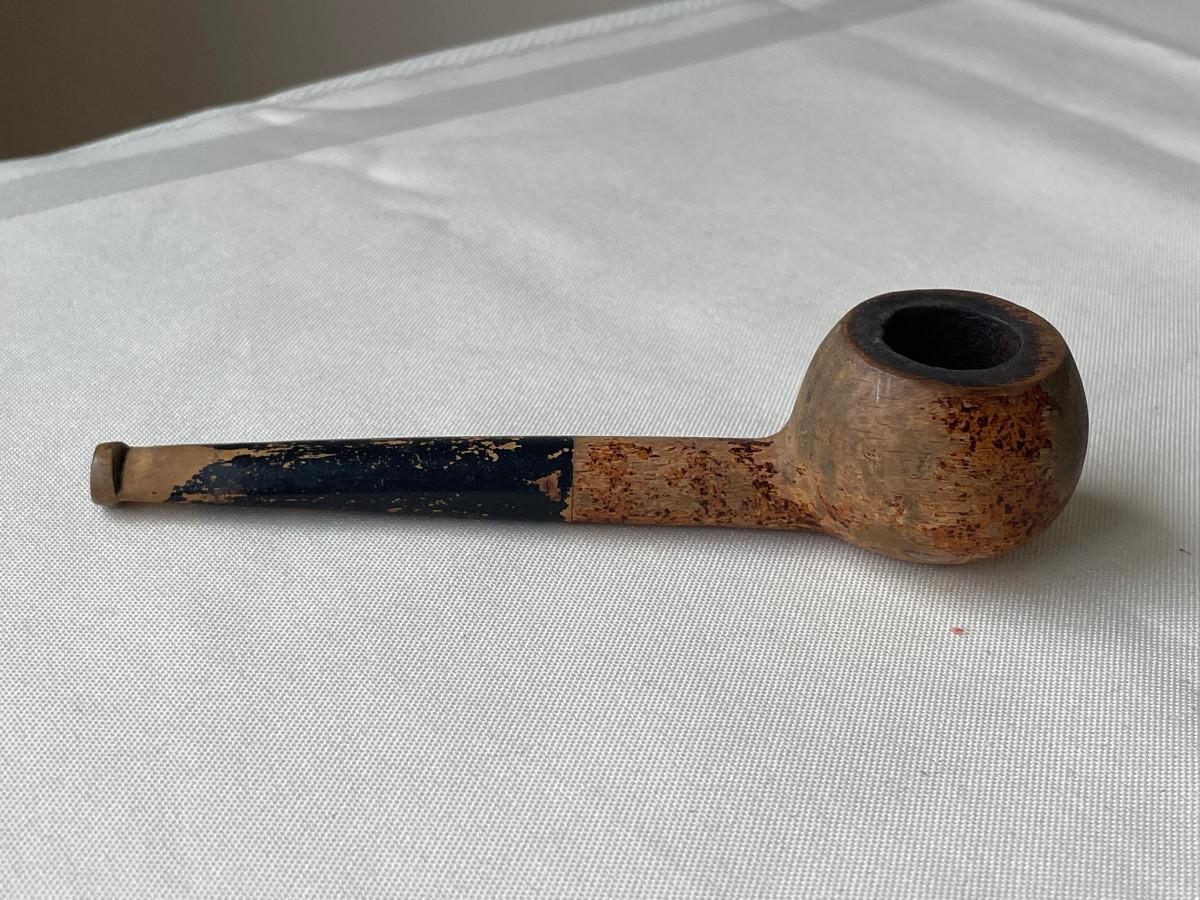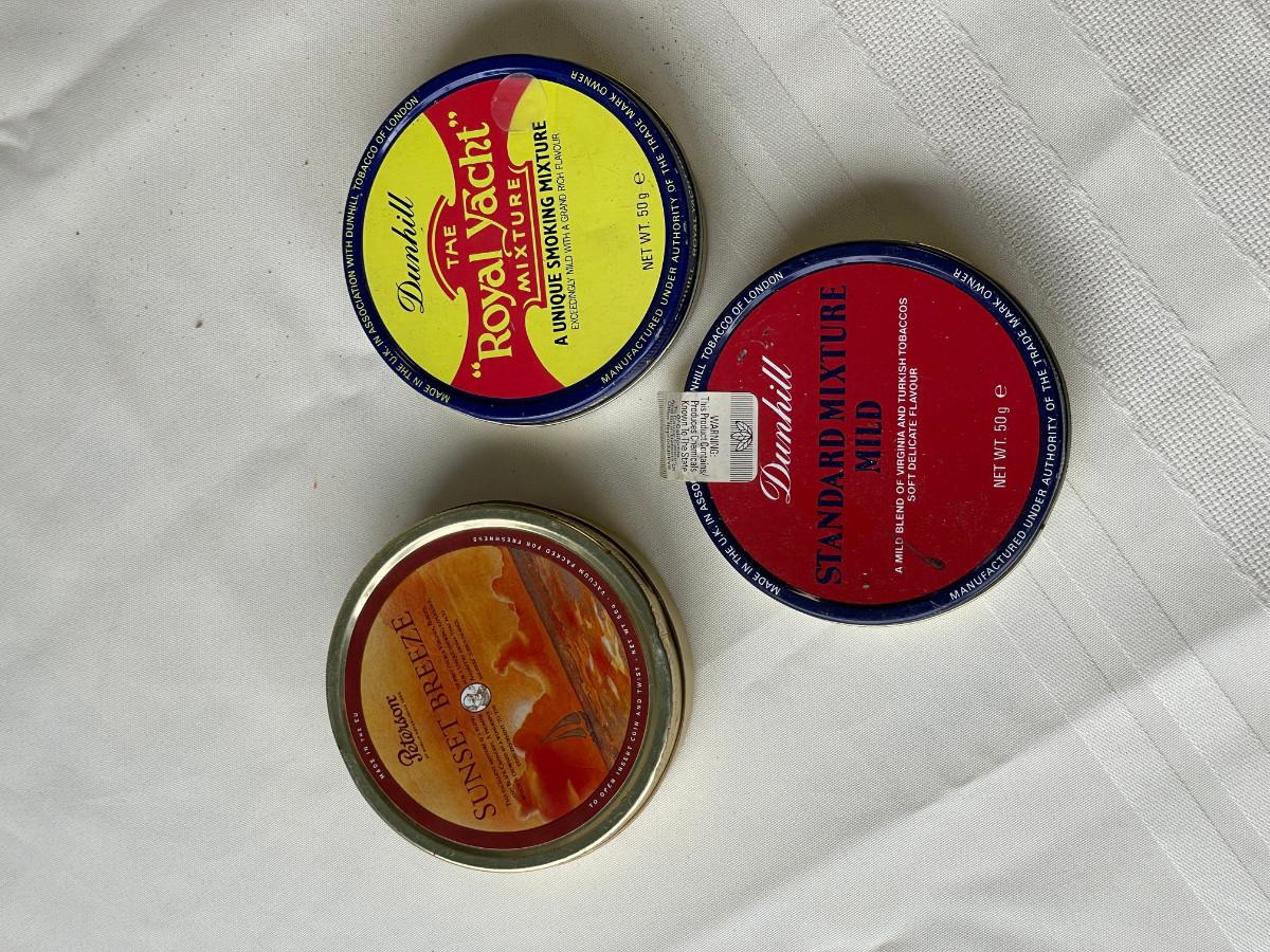 Pipe stand measures approximately 5.5” tall (base needs re-glued). 2 Pipes. 3 tobacco tins (empty).