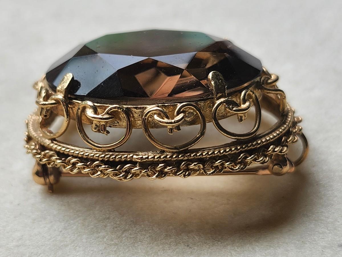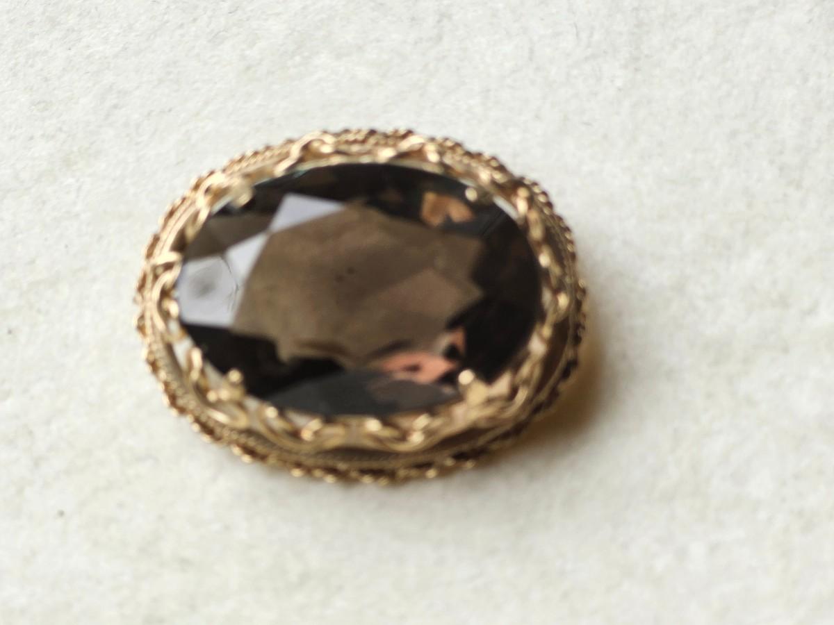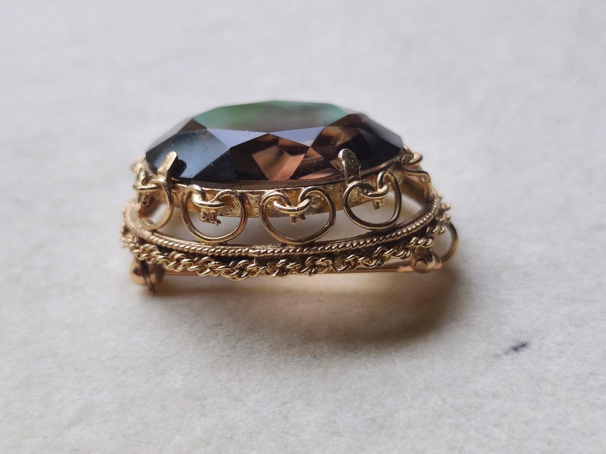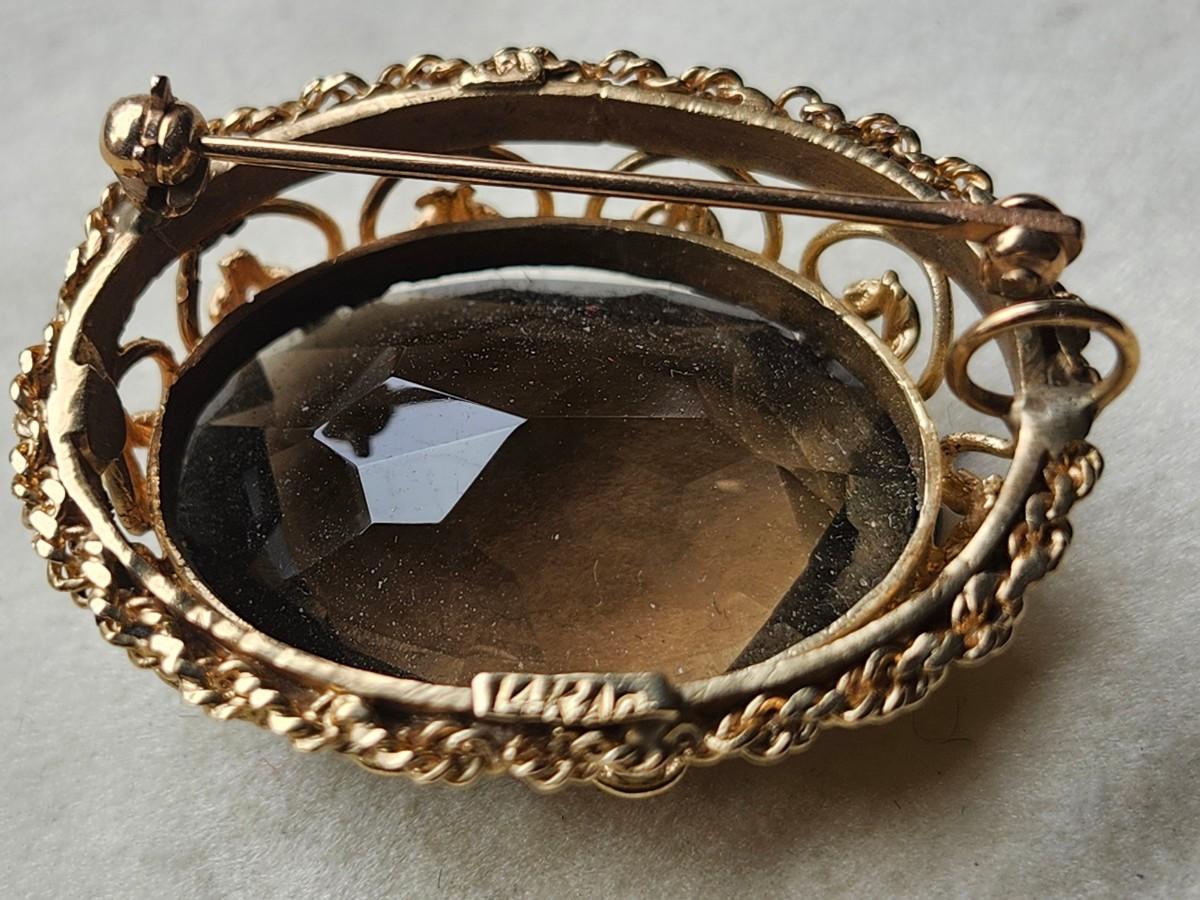 Set in 14K gold, Stamp4ed 14k A O AO is the maker's mark. Beautiful intricate gold setting. The topaz measures