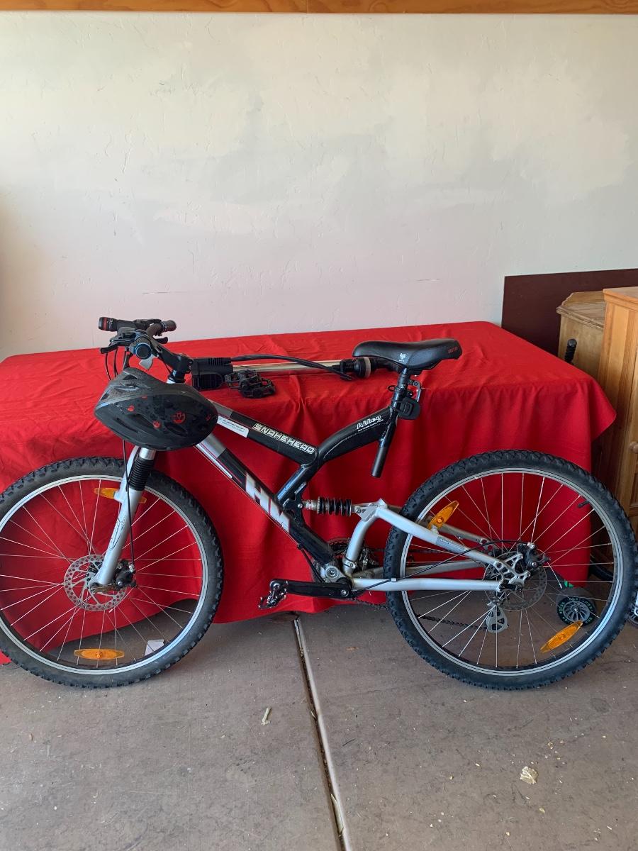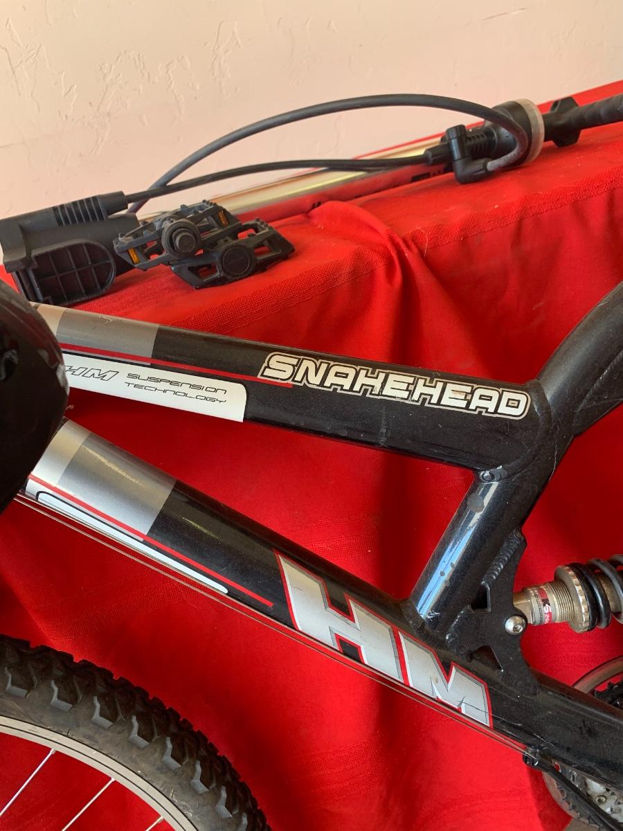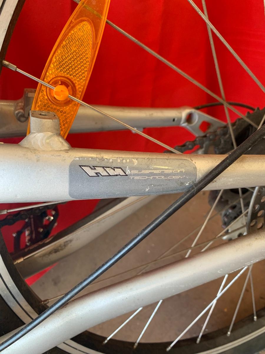 HM Suspension technology. Comes with a helmet and a pump. 28” bike. Schmiano hand brakes. Flashlight mounted on the front.