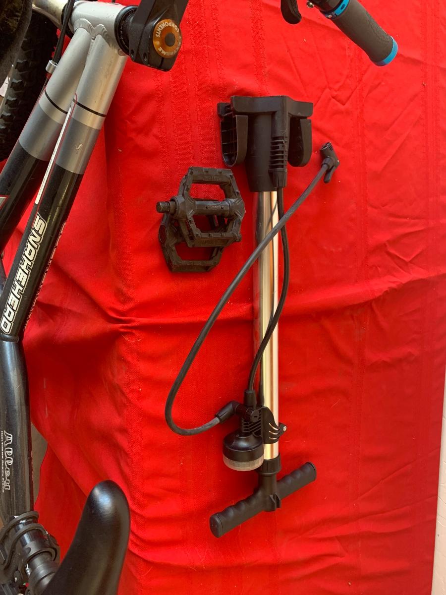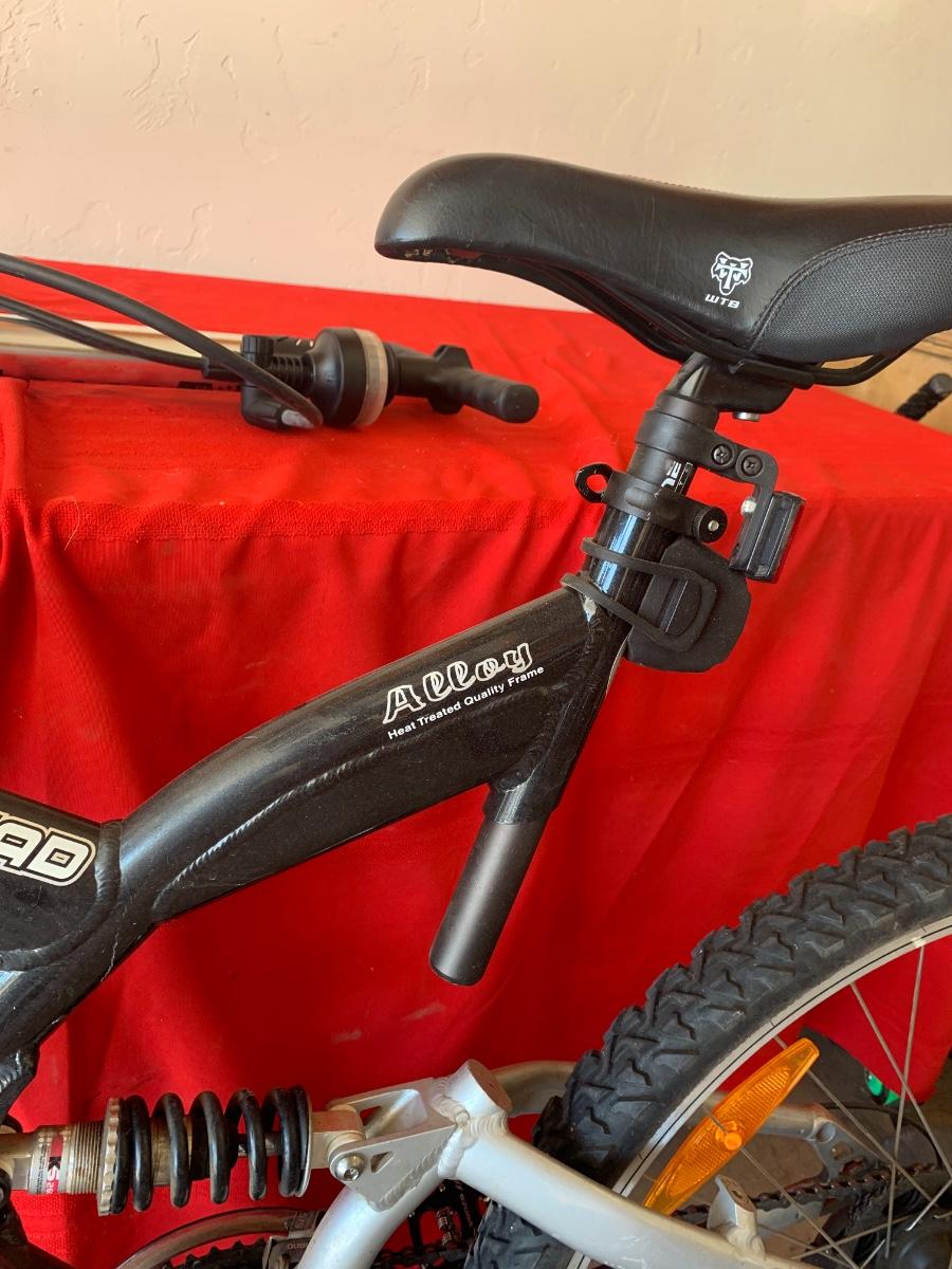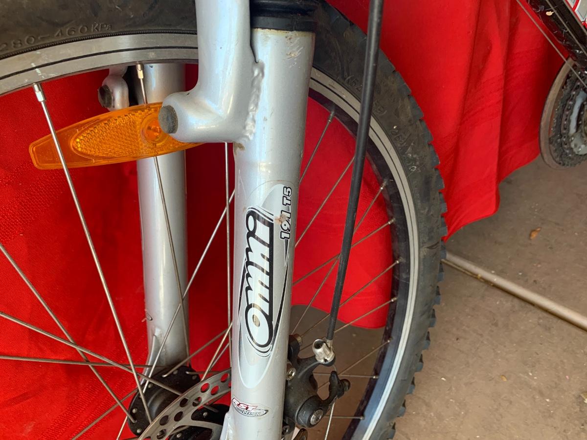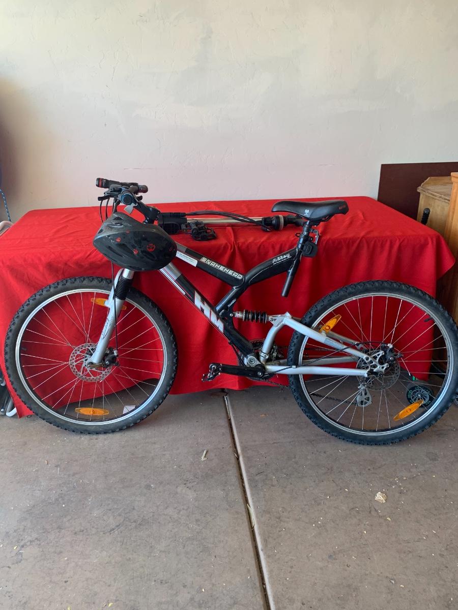 HM Suspension technology. Comes with a helmet and a pump. 28” bike. Schmiano hand brakes. Flashlight mounted on the front.