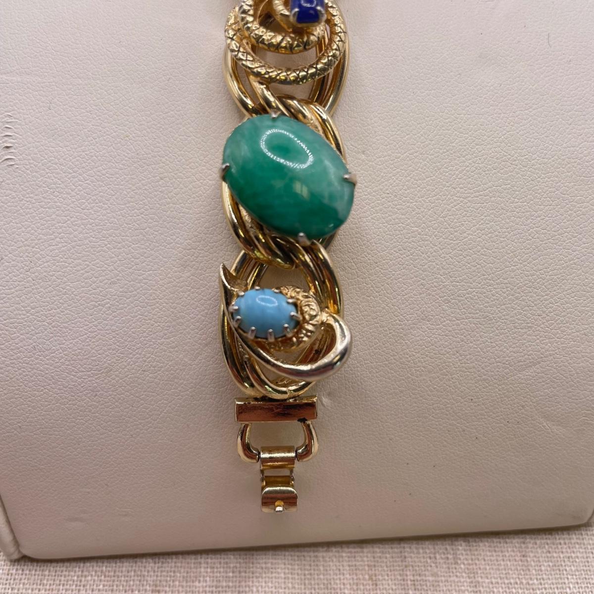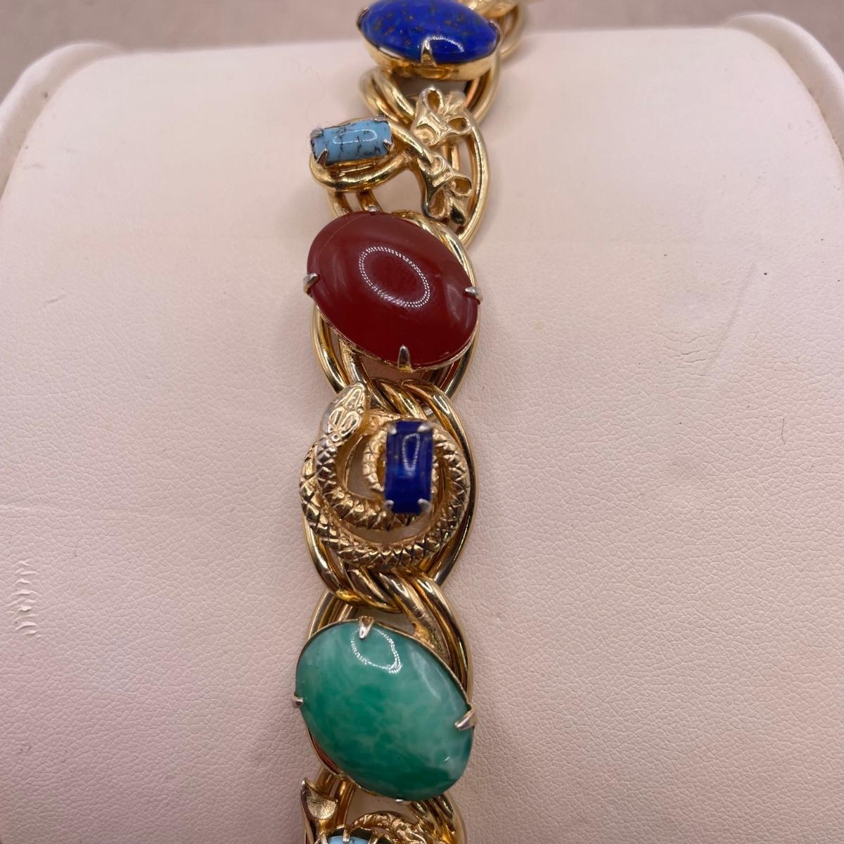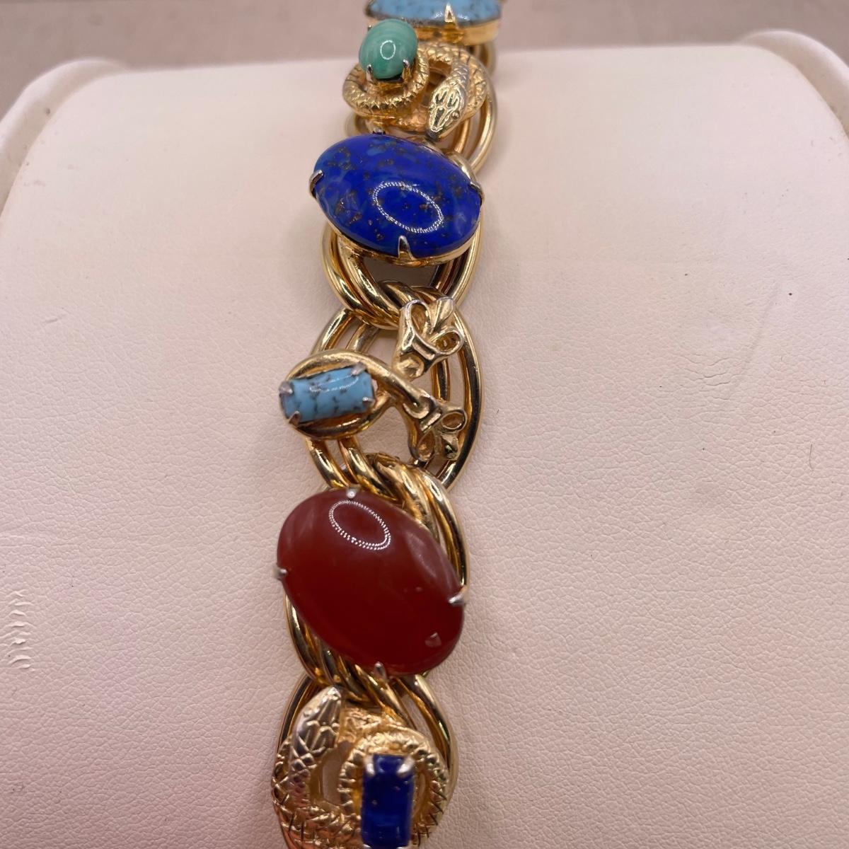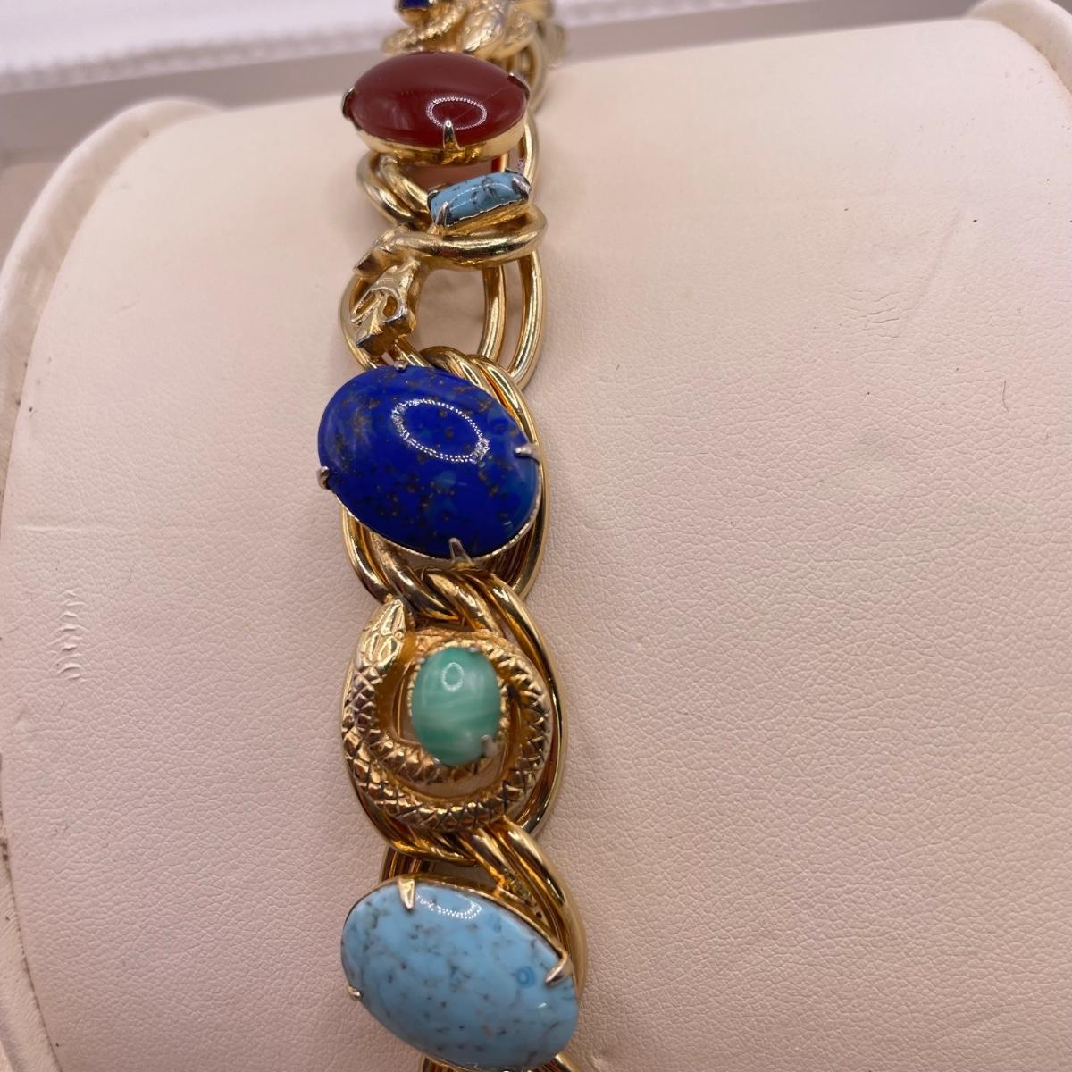 Heavy gold colored bracelet with a variety of nine stones, two have coiled snake settings. Stones appear to be natural and not man-made. Make an appoint to preview in person! See images. We cannot guarantee the authenticity of any gemstone. All sales are final. No returns or refunds. Please bid accordingly.