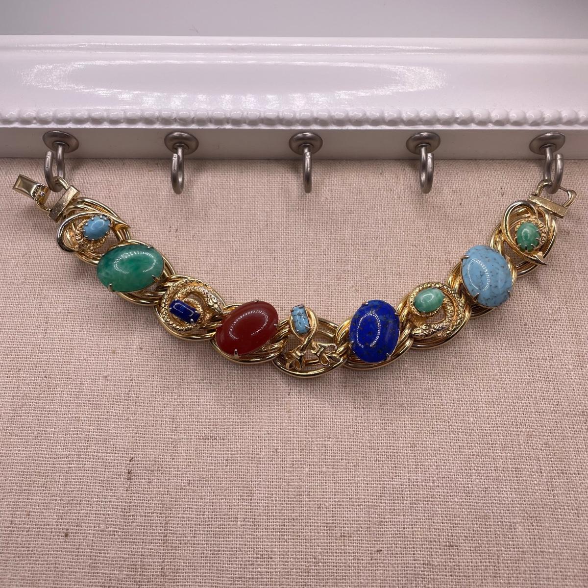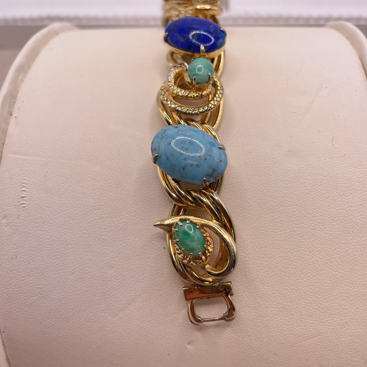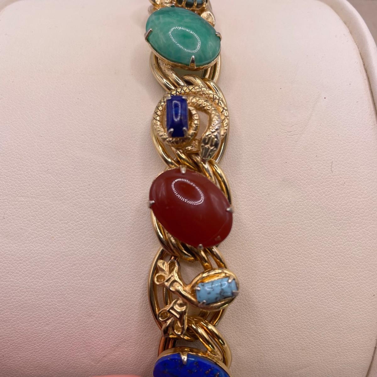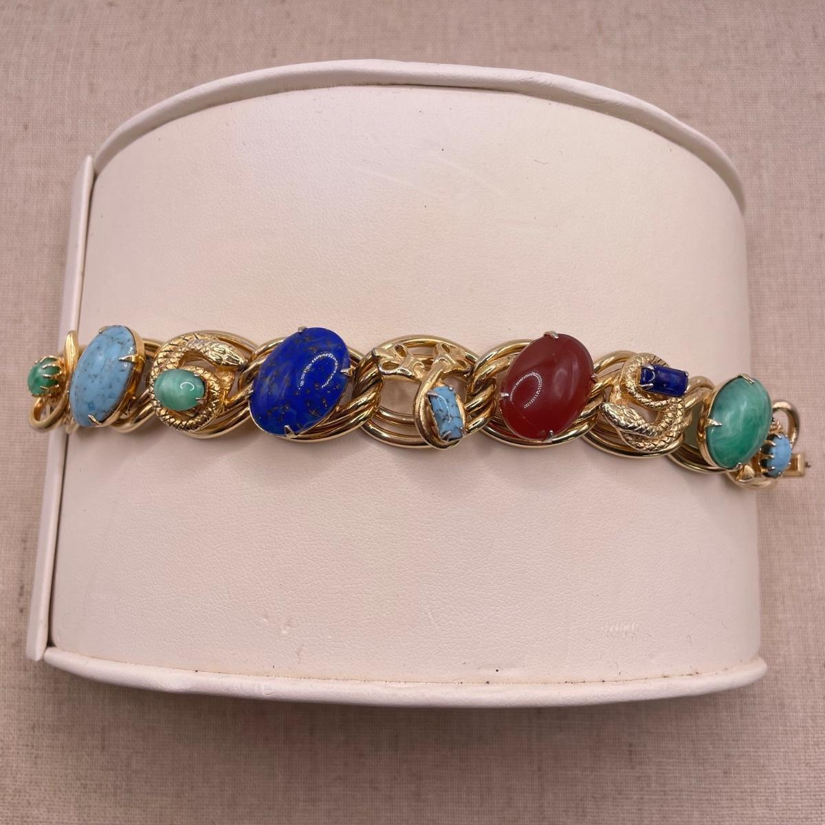 Heavy gold colored bracelet with a variety of nine stones, two have coiled snake settings. Stones appear to be natural and not man-made. Make an appoint to preview in person! See images. We cannot guarantee the authenticity of any gemstone. All sales are final. No returns or refunds. Please bid accordingly.