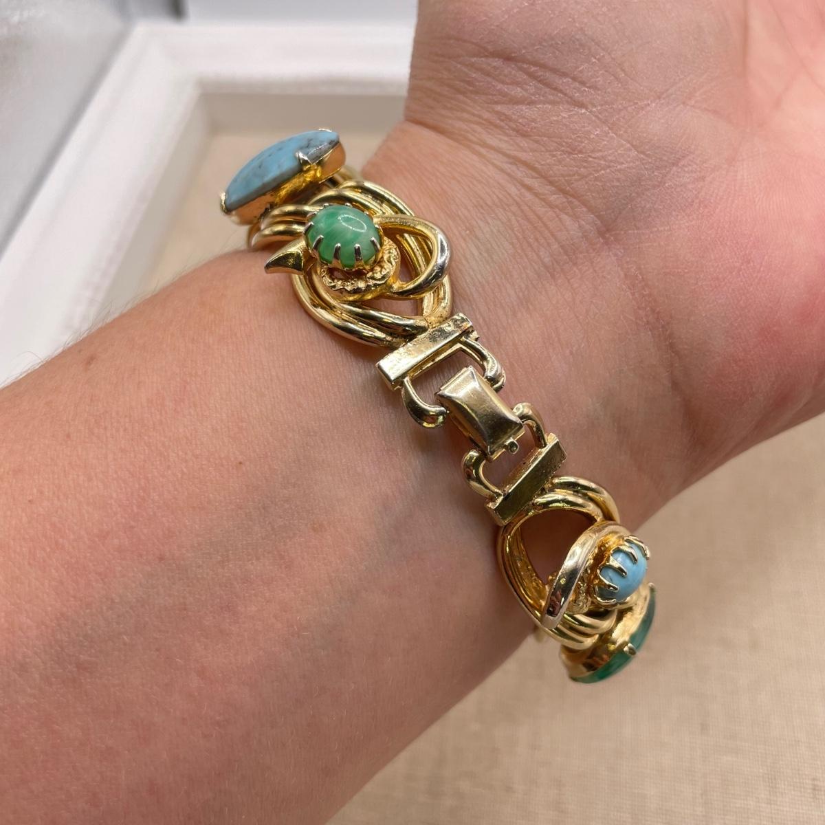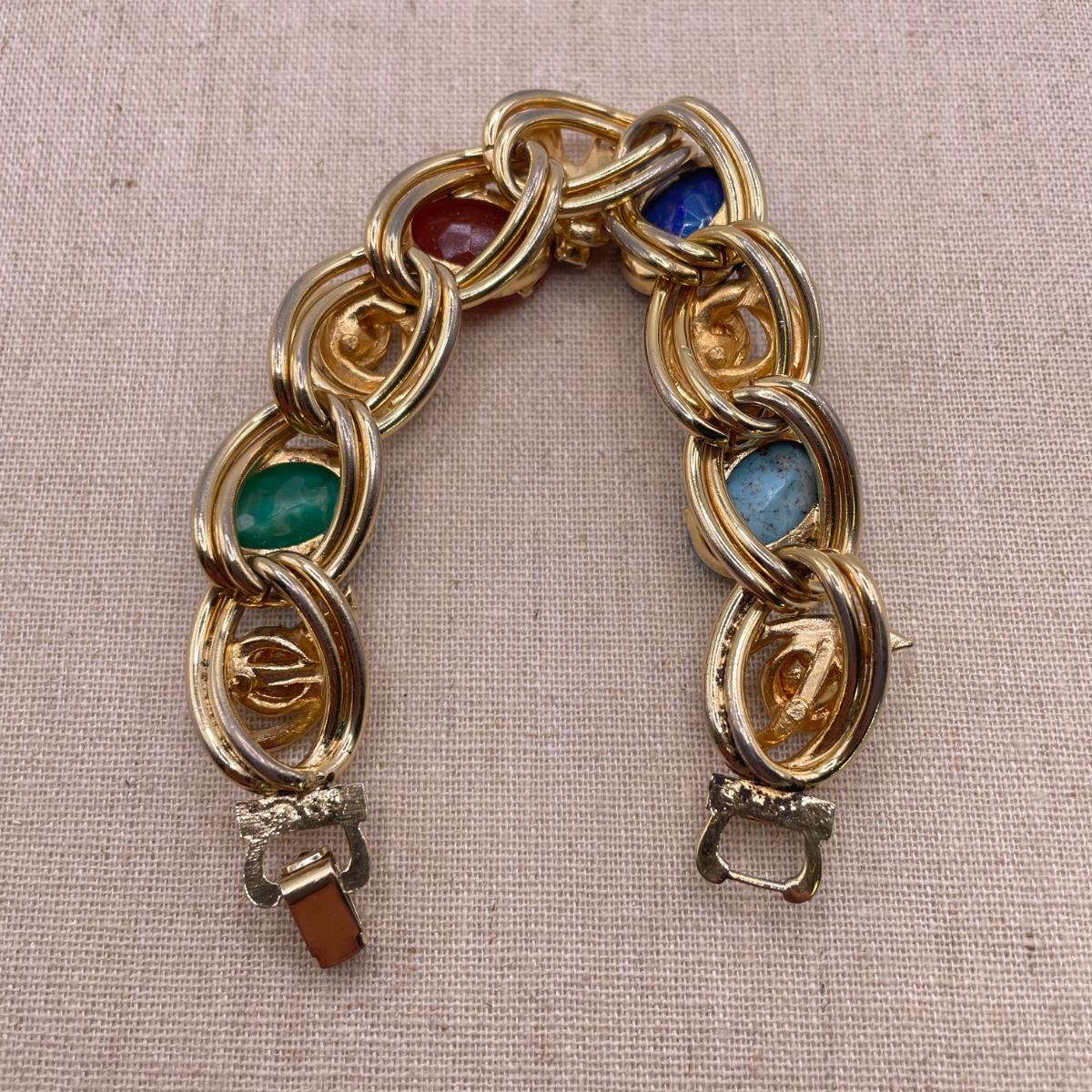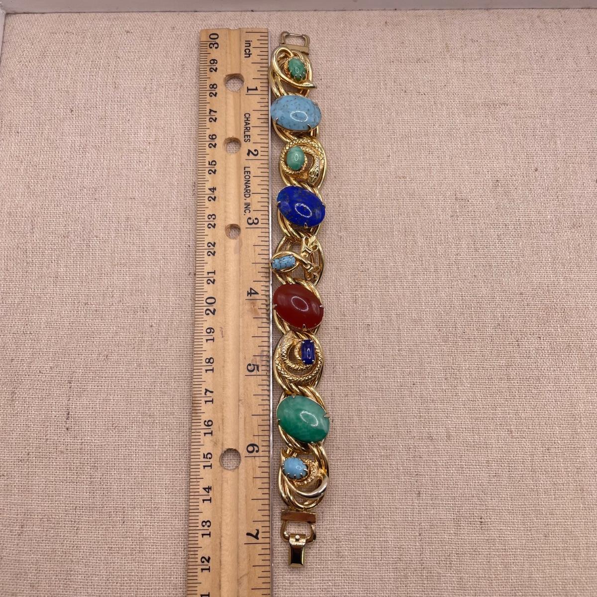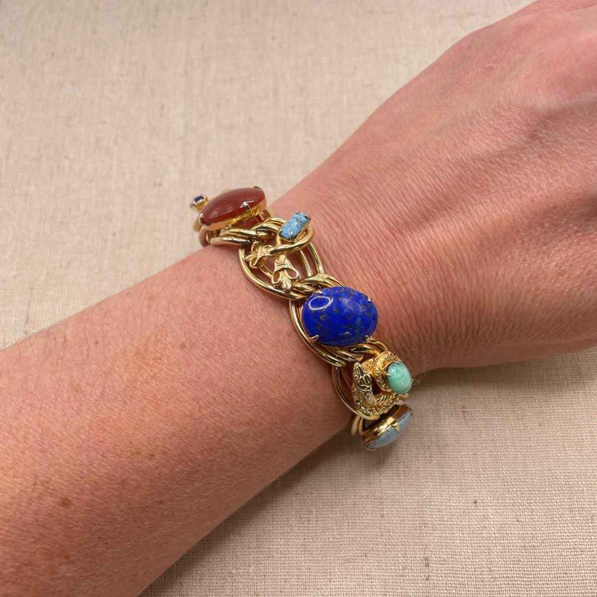 Heavy gold colored bracelet with a variety of nine stones, two have coiled snake settings. Stones appear to be natural and not man-made. Make an appoint to preview in person! See images. We cannot guarantee the authenticity of any gemstone. All sales are final. No returns or refunds. Please bid accordingly.