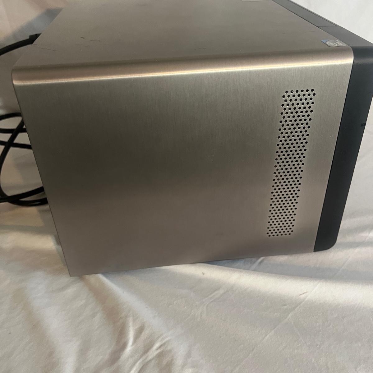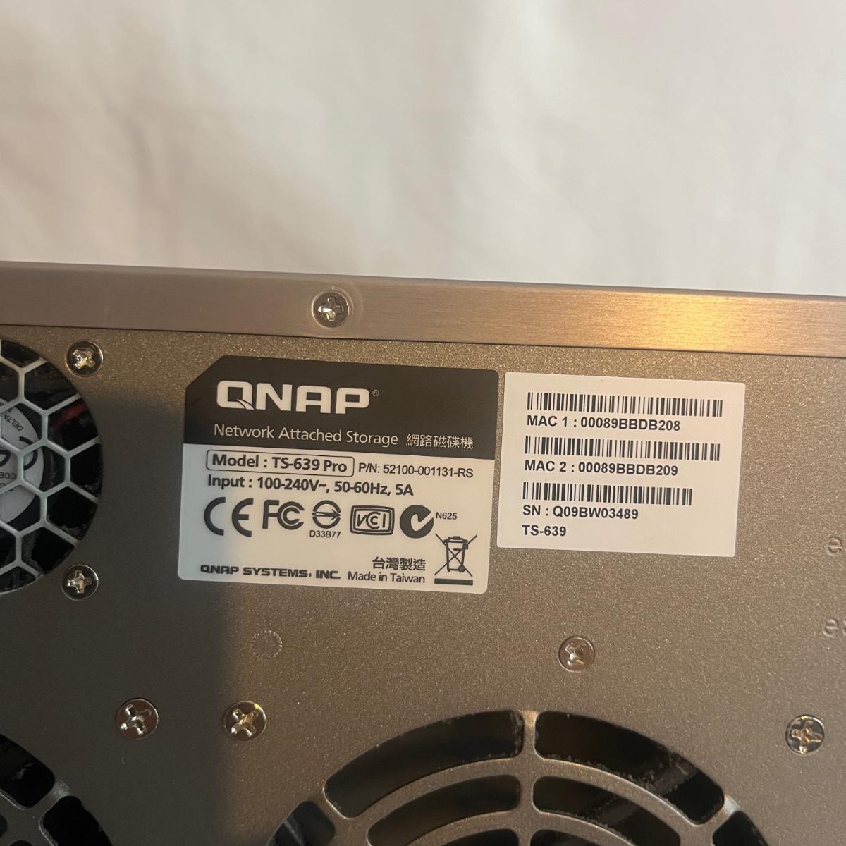 This Qnap network attached storage unit powered on when tested and measures 10.5" x 9.5" x 7.5"H. Comes with two keys. Also includes three unopened Hitachi 2TB hard drives that are still sealed in their original packaging.
