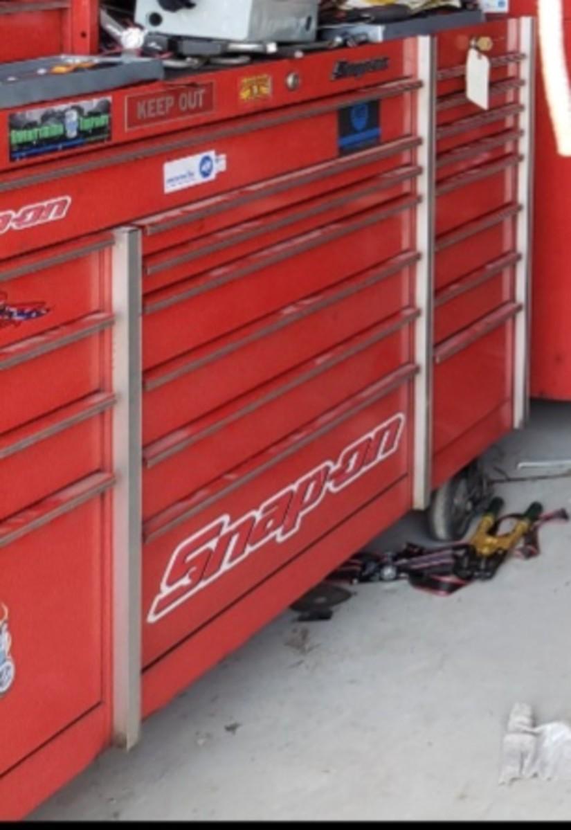 Large Snap On rolling tool box. No contents included. Currently Lot #3 & #4 are sitting on the top of this cabinet.