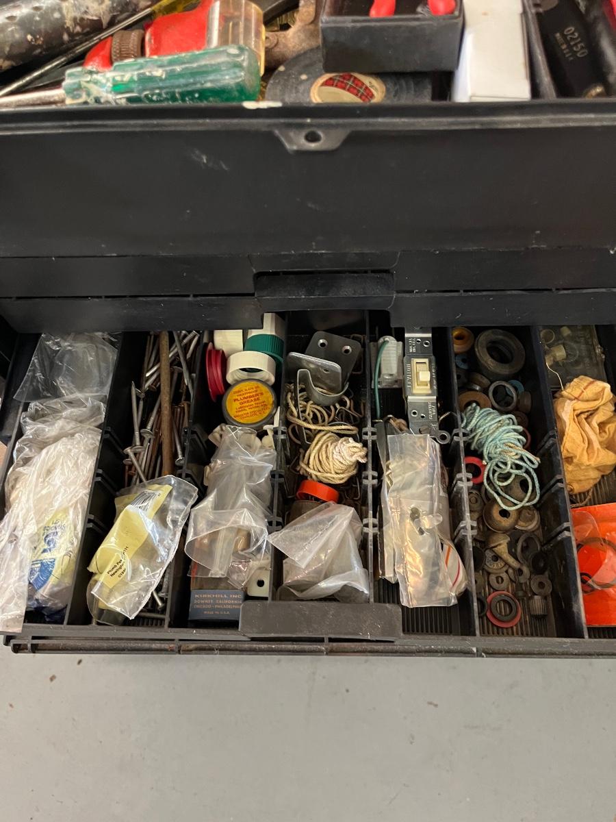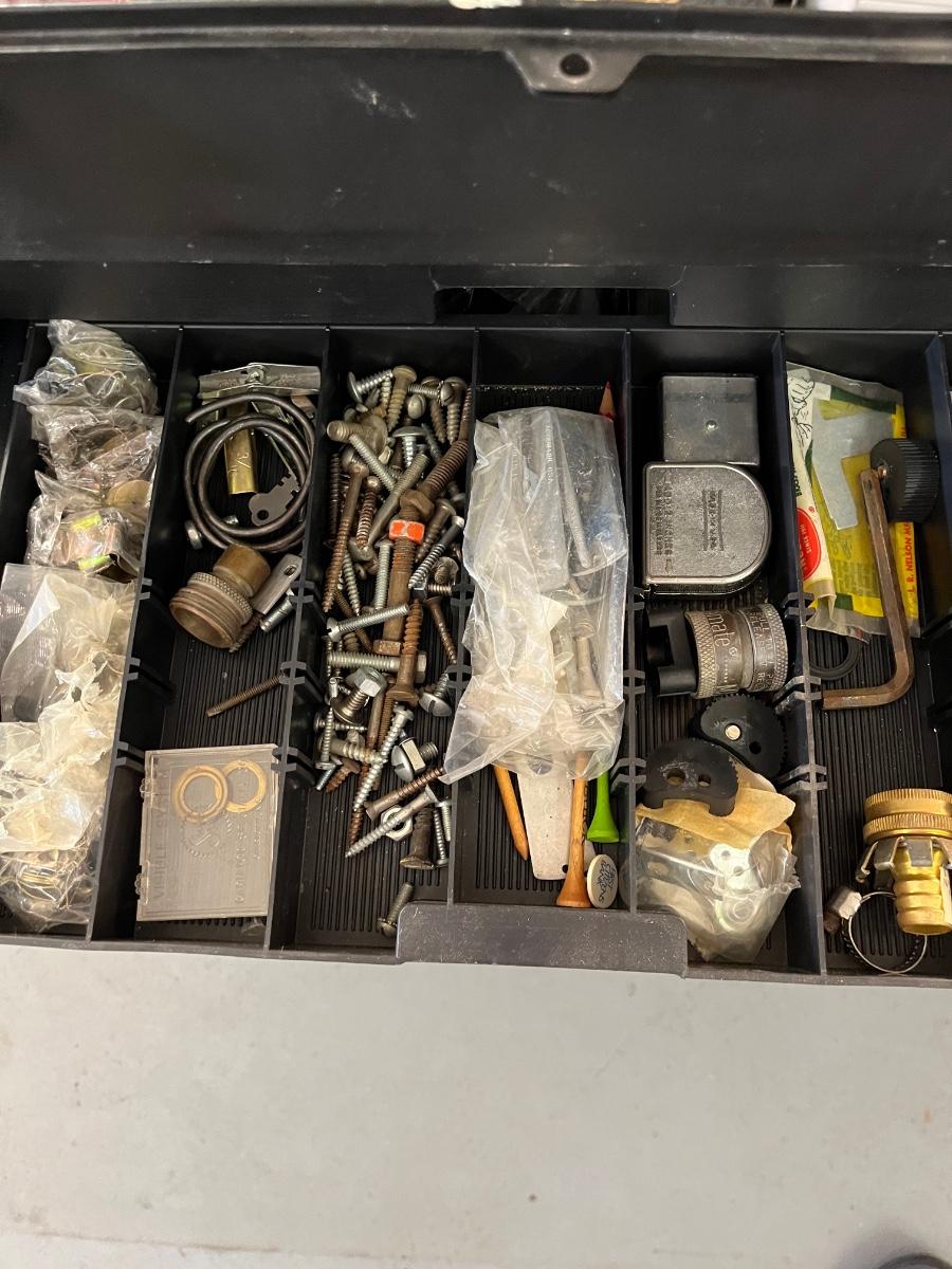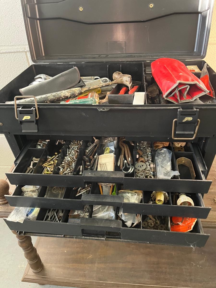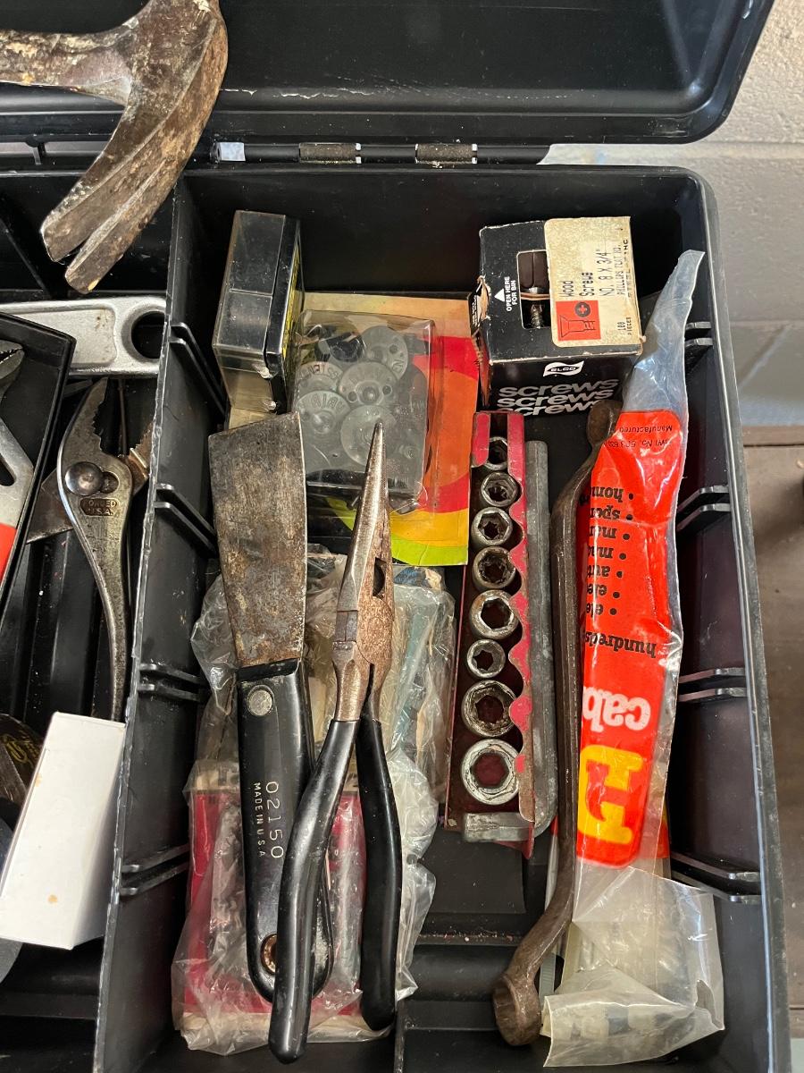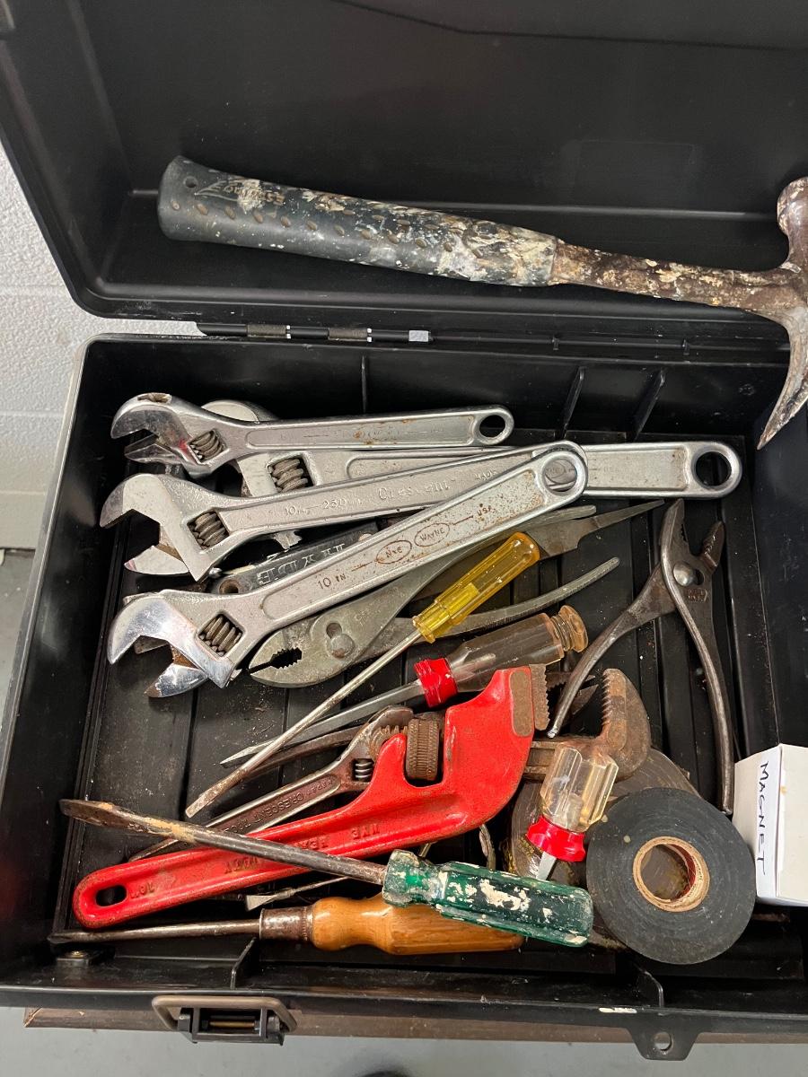 Lot includes a set of nine Snap On wrenches, Plano plastic tool box with an assortment of hand tools and hardware. Box measures 21” x 12” x 15”.