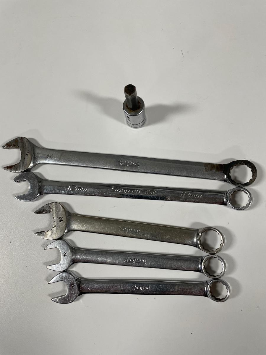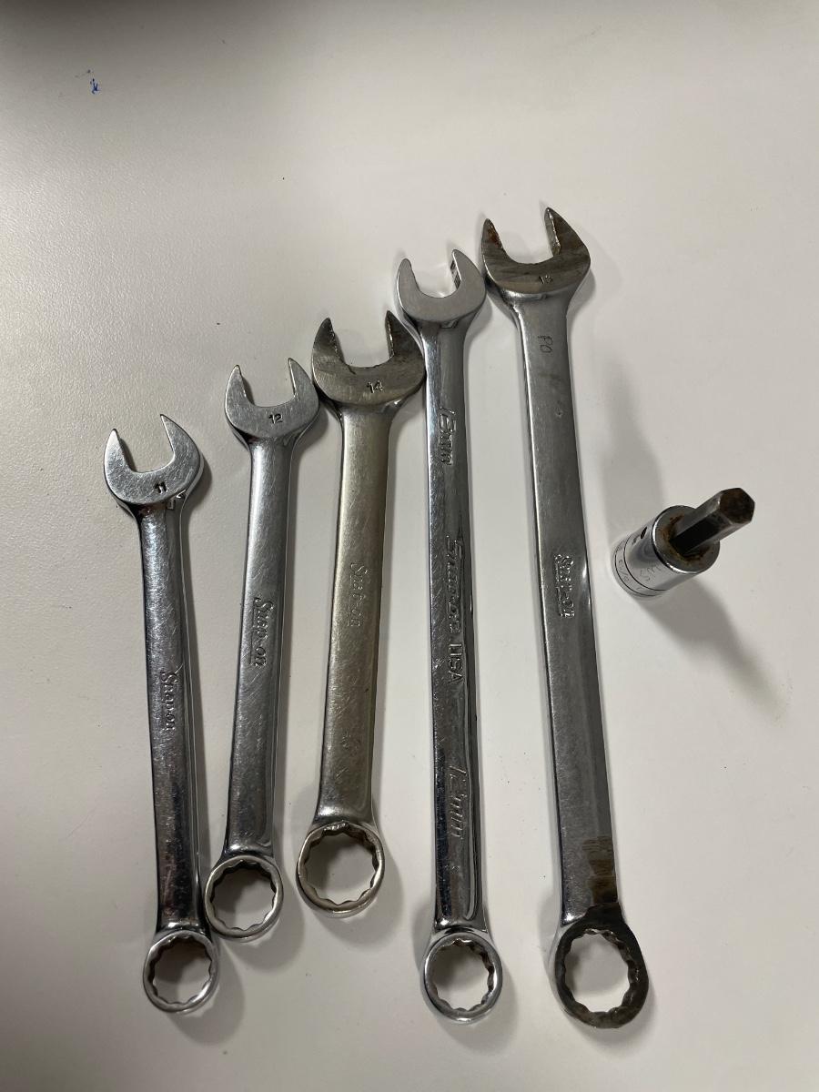 Sizes 11, 12, 14, and 15mm. There are 2 12mm wrenches and a 5/16” socket drive. 6 items all together.