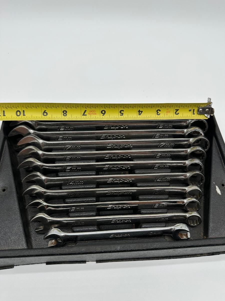 Professional-grade Snap-on non-ratcheting metric combination wrench set in molded drawer tray. Includes 10mm through 19mm wrenches with open end and standard box end (non-ratcheting). Chrome finish with Snap-on Flank Drive design on box ends for improved grip and reduced fastener rounding. Light cosmetic wear consistent with normal shop use. Tray fits standard Snap-on toolbox drawers.