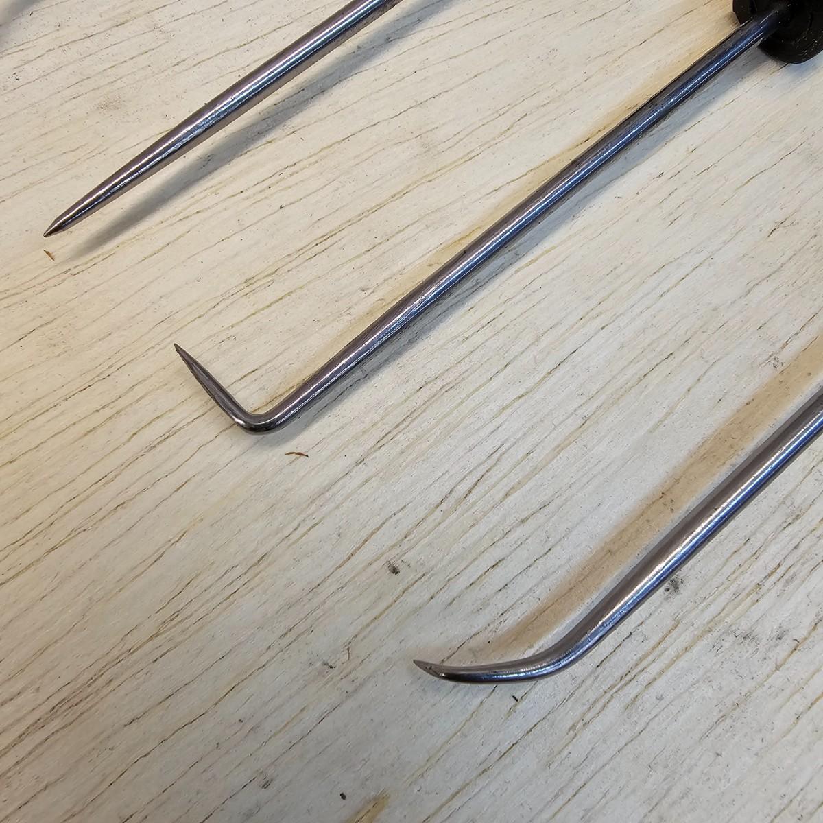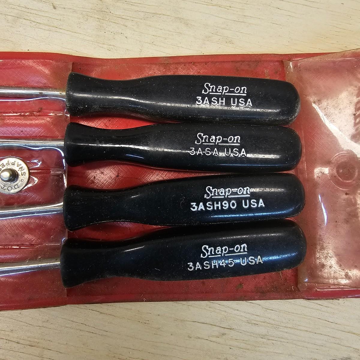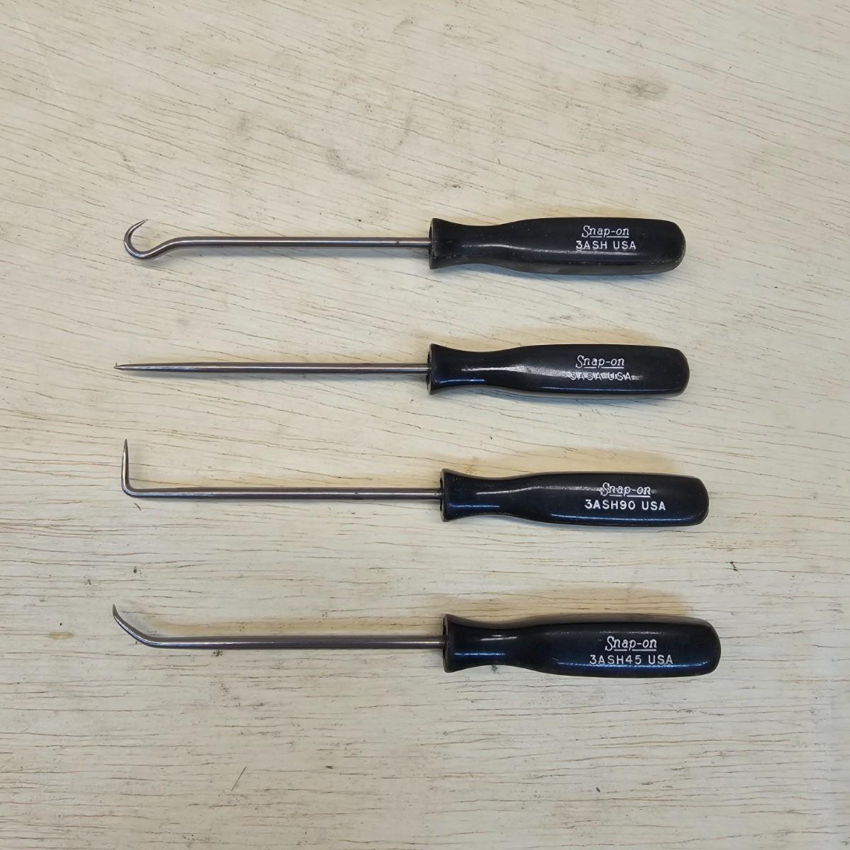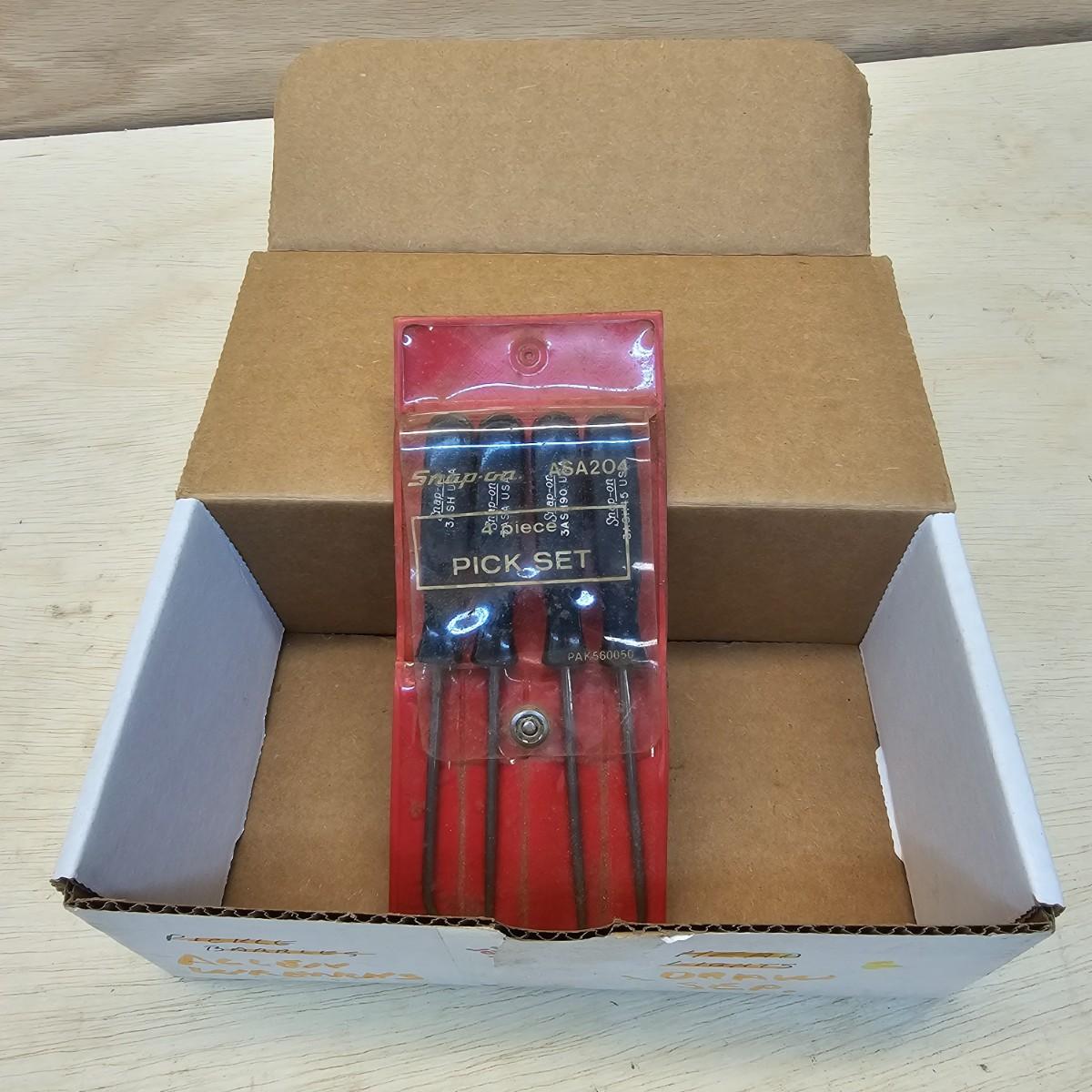 Four individual probes/picks by Snap-On tools. Straight, curved, angled items in plastic storage case. Picks are 6" long. See photos for details. Shipping available.