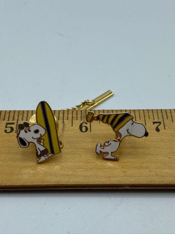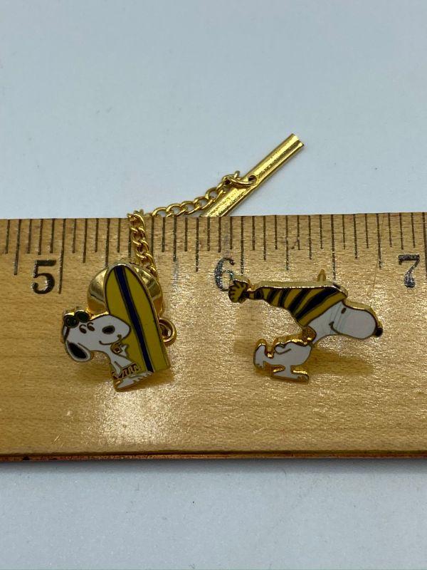 Pair of Snoopy tie tack pins. Surfer Snoopy and Winter Snoopy. Enamel on the winter one has some cracks.