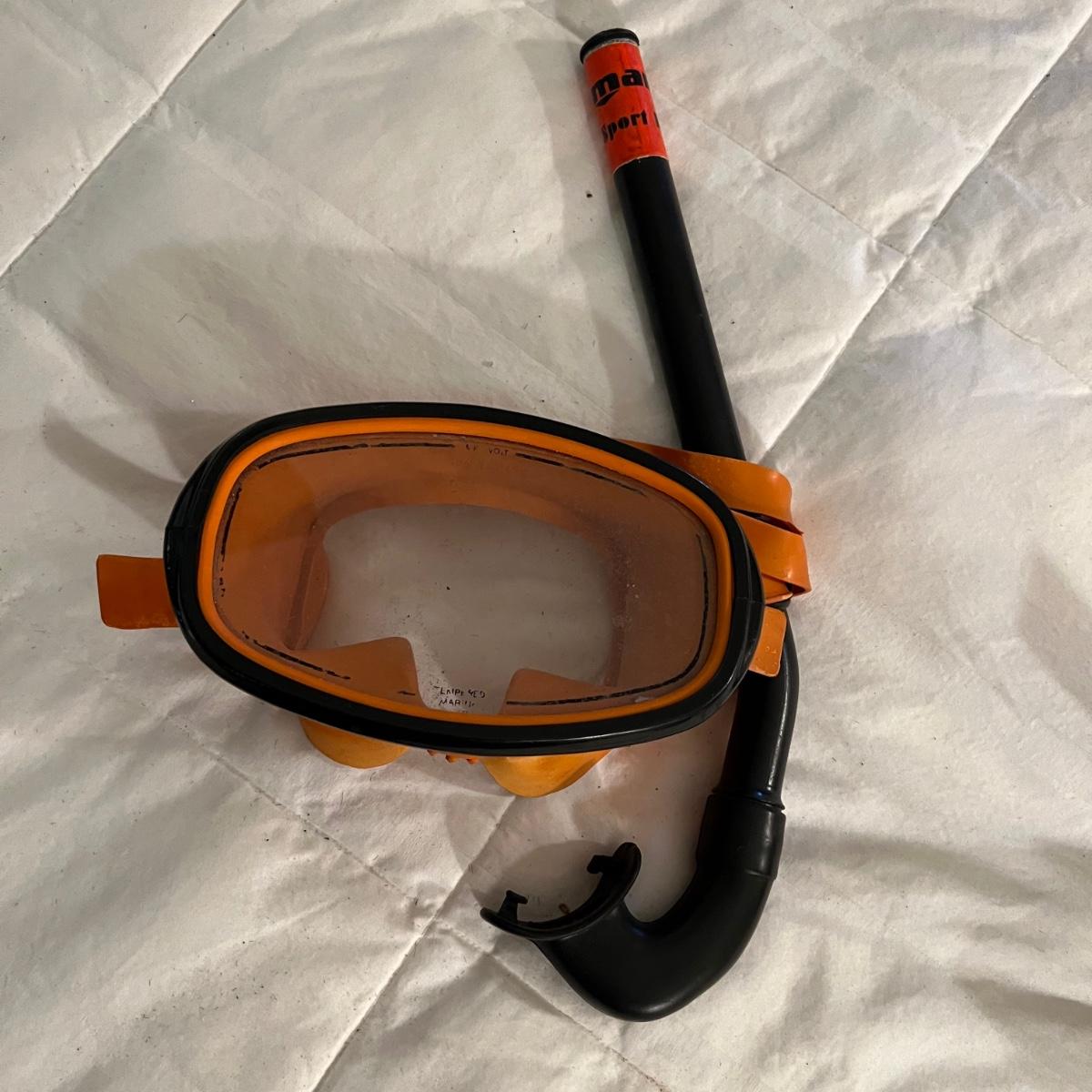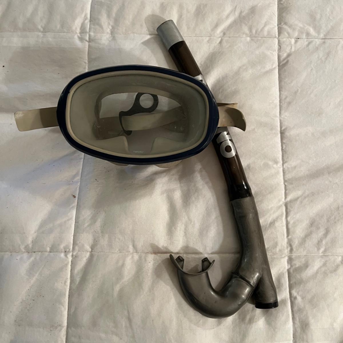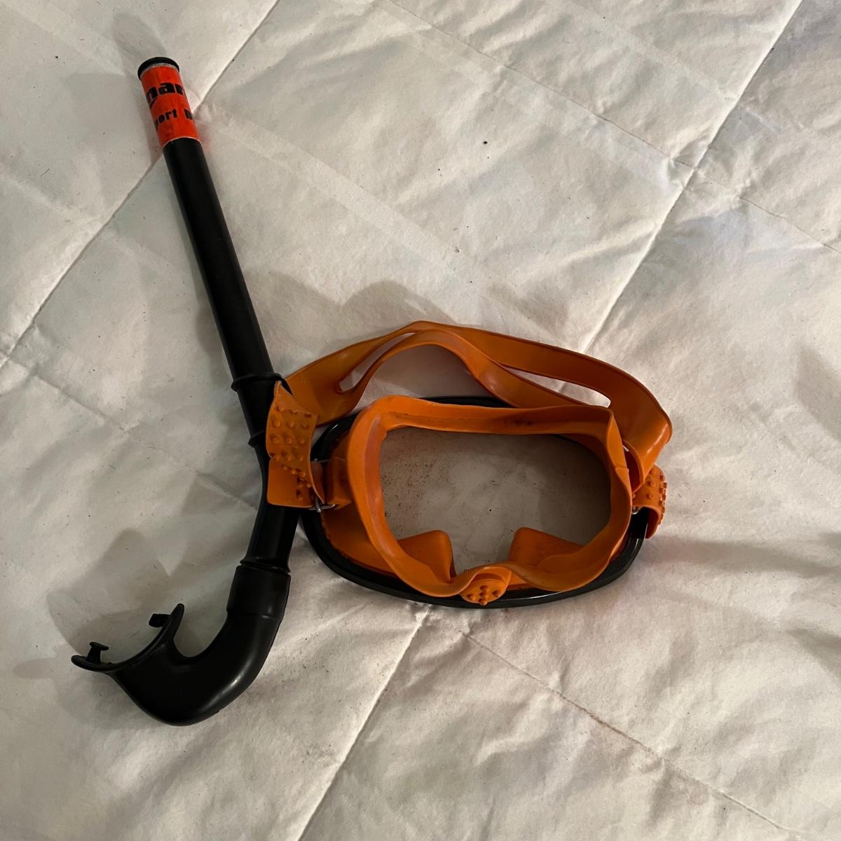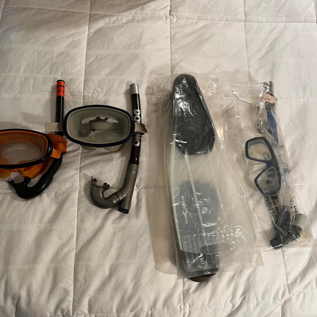 Three sets of snorkeling masks and snorkels. One set is branded Impulse U.S. Divers Aqua-Lung, one is Dolfine and the orange are is AMF Voit. Also, one pair of medium size Scuba Quest fins.
