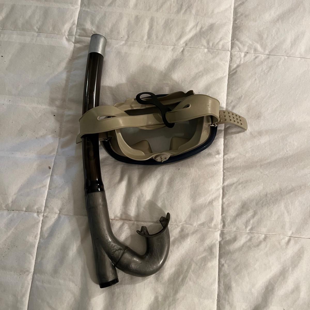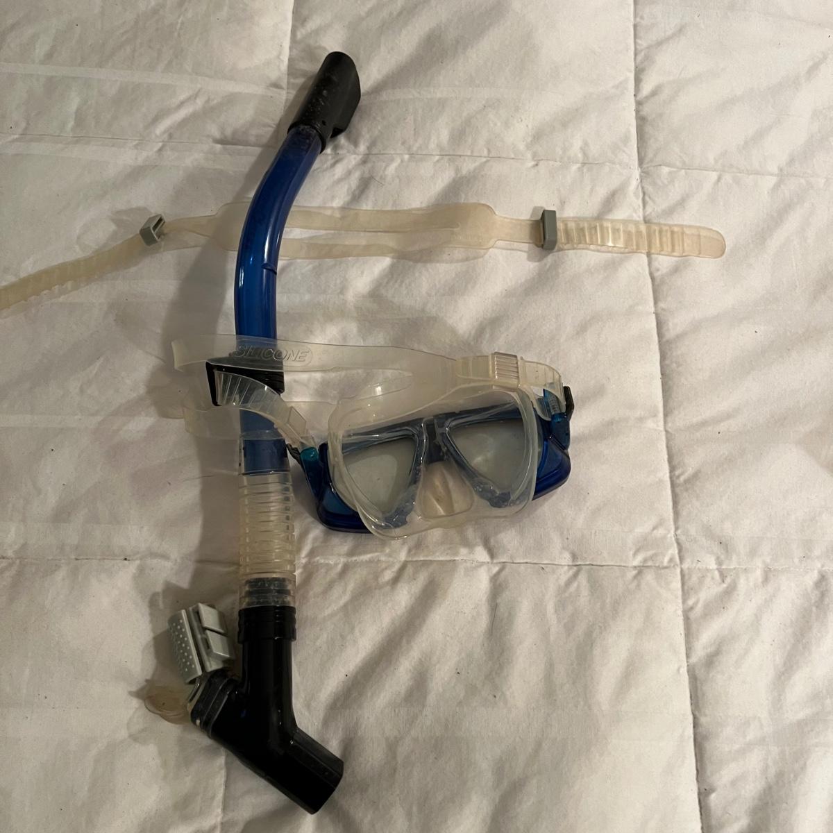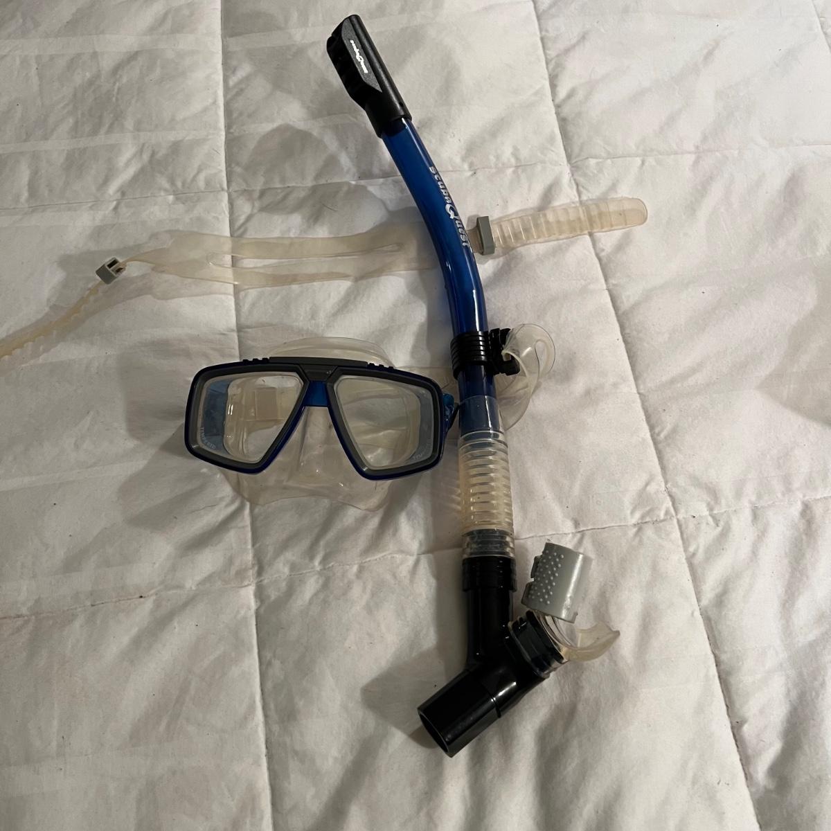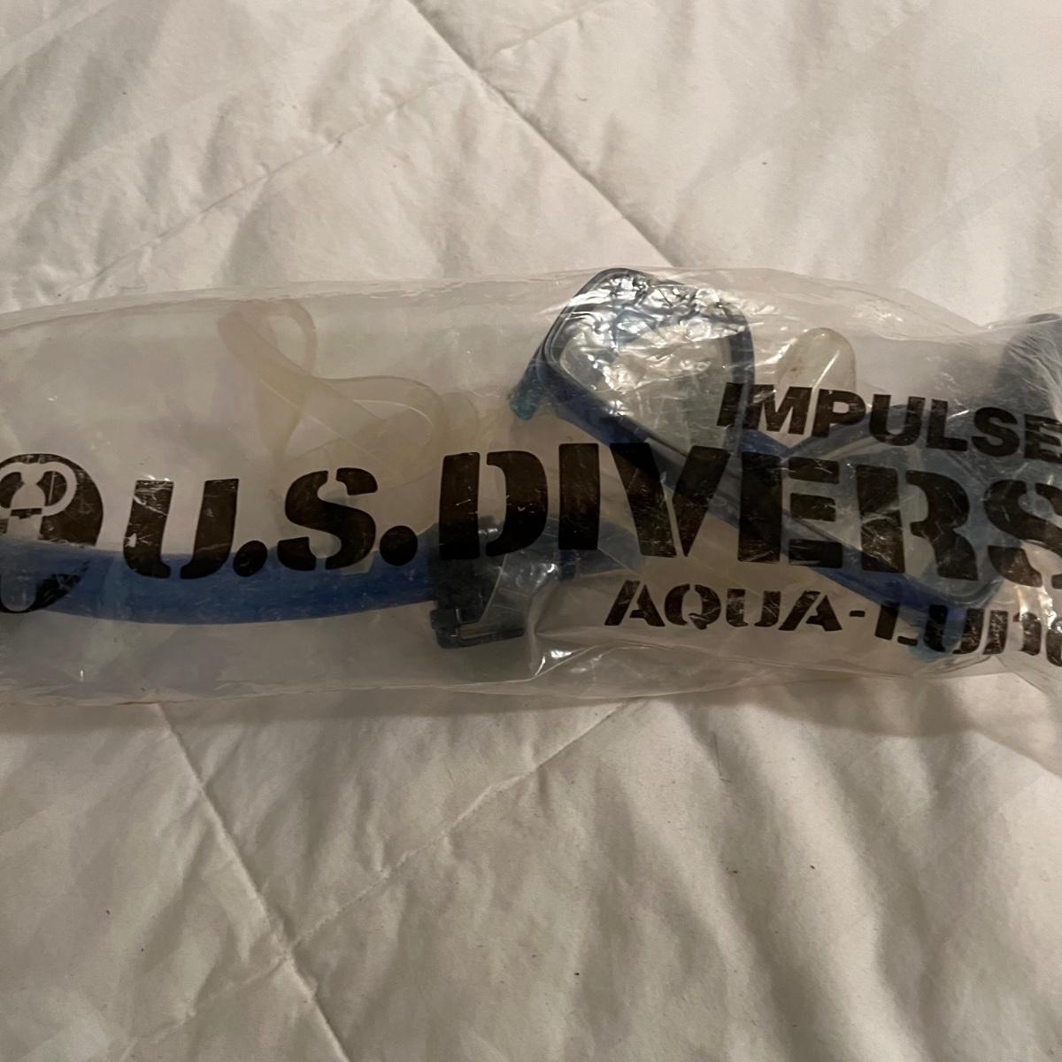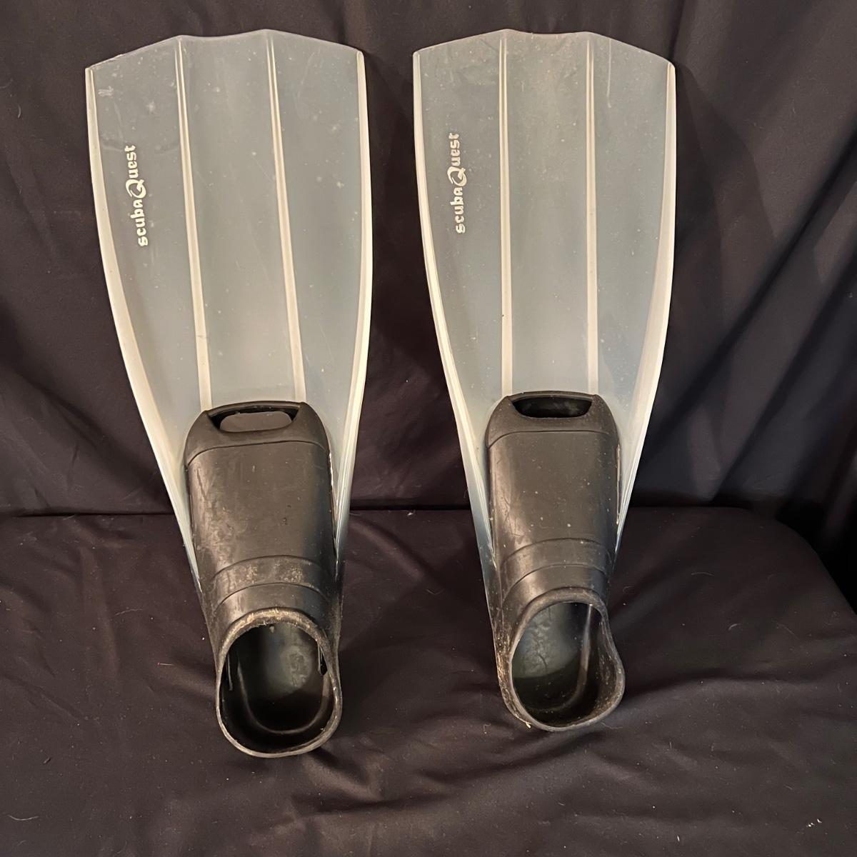Three sets of snorkeling masks and snorkels. One set is branded Impulse U.S. Divers Aqua-Lung, one is Dolfine and the orange are is AMF Voit. Also, one pair of medium size Scuba Quest fins.