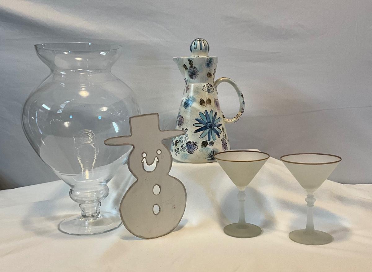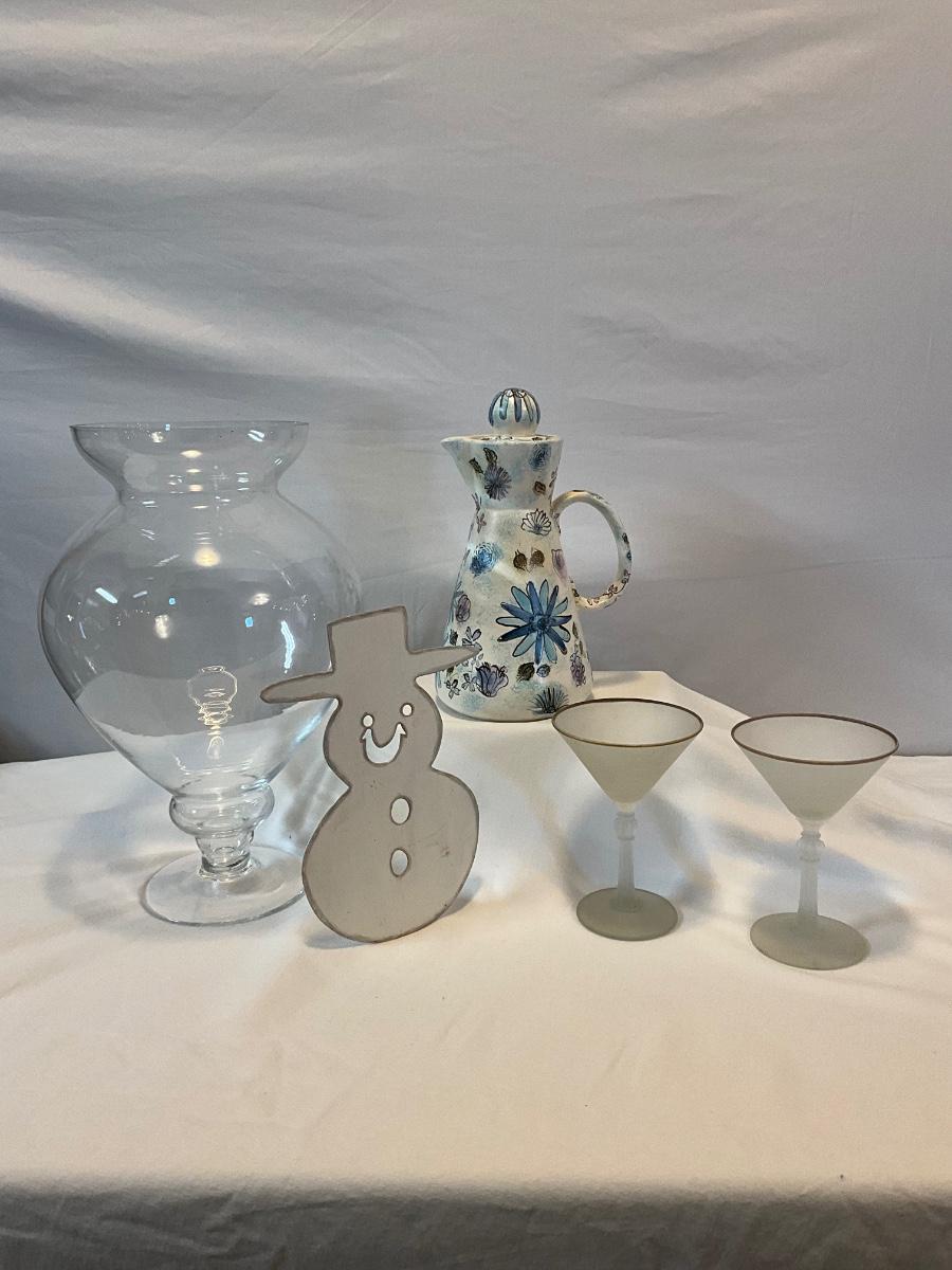 Metal snowman, 2 frosted martini glasses with gold rims, handmade pitcher with flowers, and large glass vase