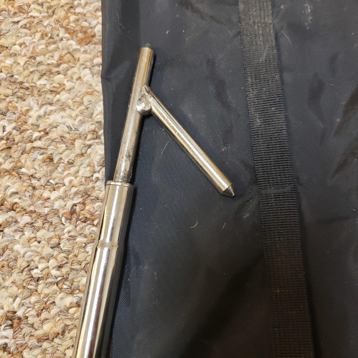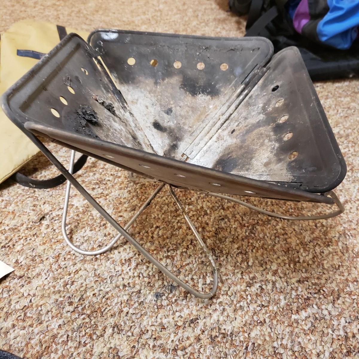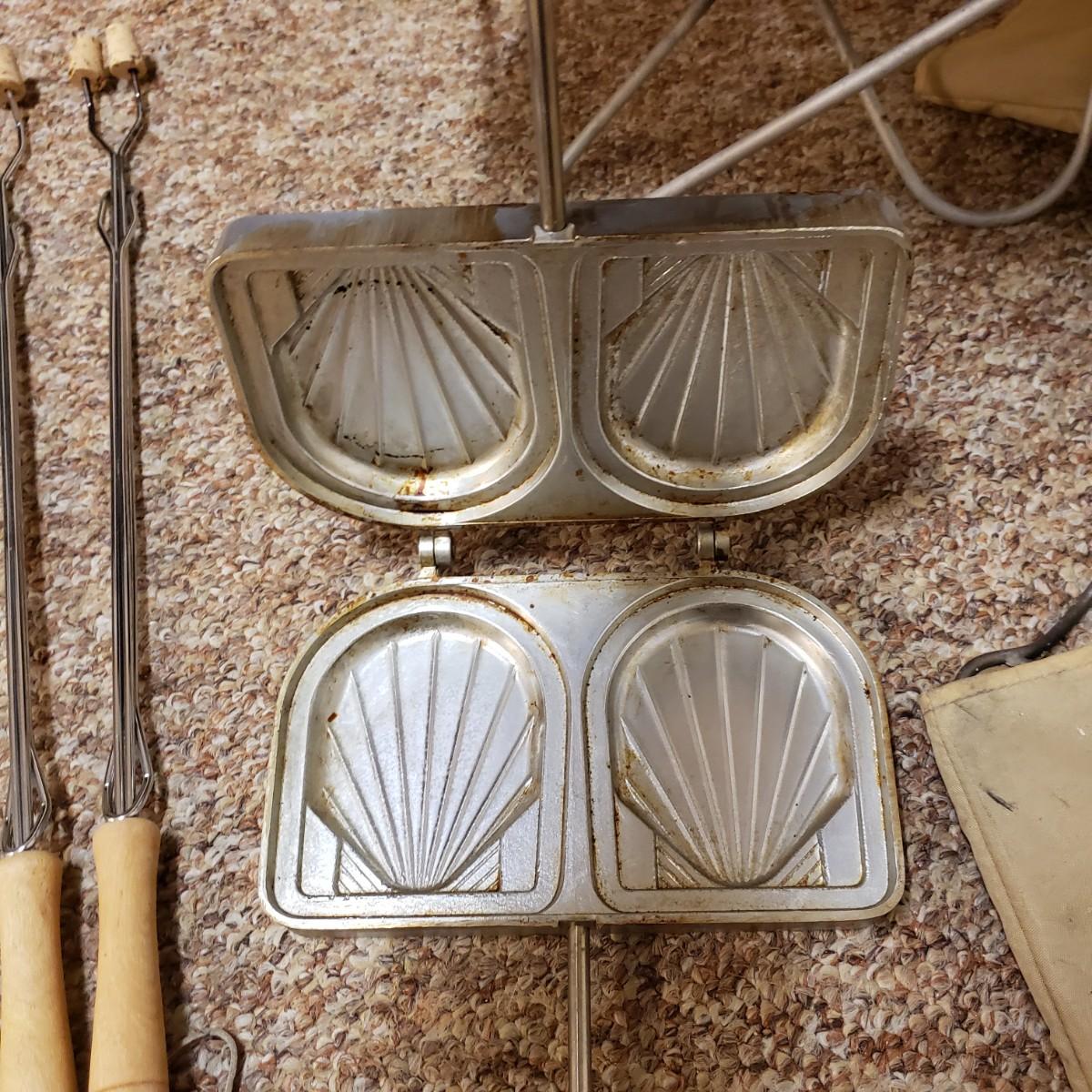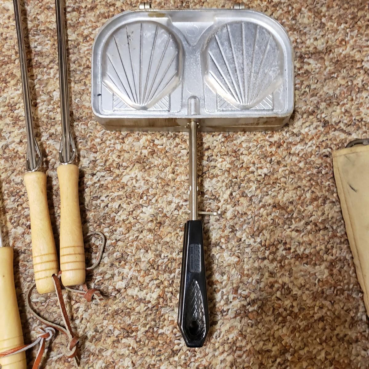 This lot has two different sized Snow Peak Collapsible fireplaces in a carry case. The largest grill unfolded measures 14" x 14" x 10"H. Folded it measures 17" x 14". The S.E.F.A.M.A. double pie maker is made in France and has a hard plastic handle.. There are four marshmallow adjustable sticks with wooden handles and leather rope. The adjustable fire poker comes in a Granite Gear bag.