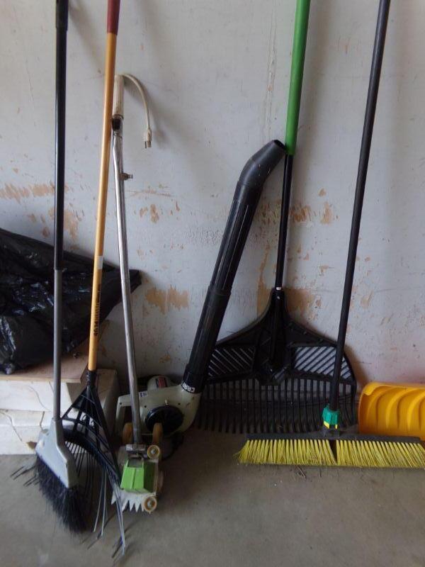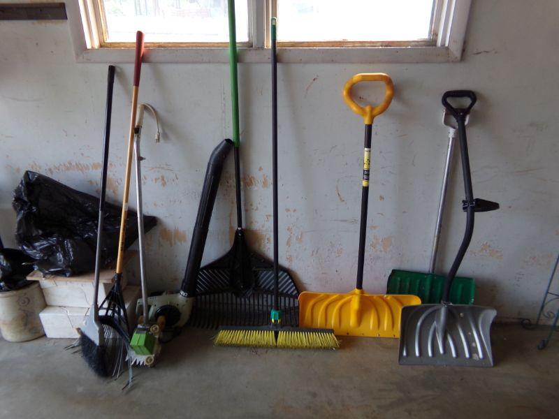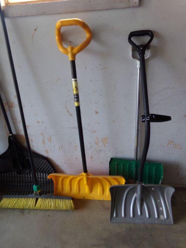 3 SNOW SHOVELS, PUSH BROOM, RAKES, AND BLOWER.