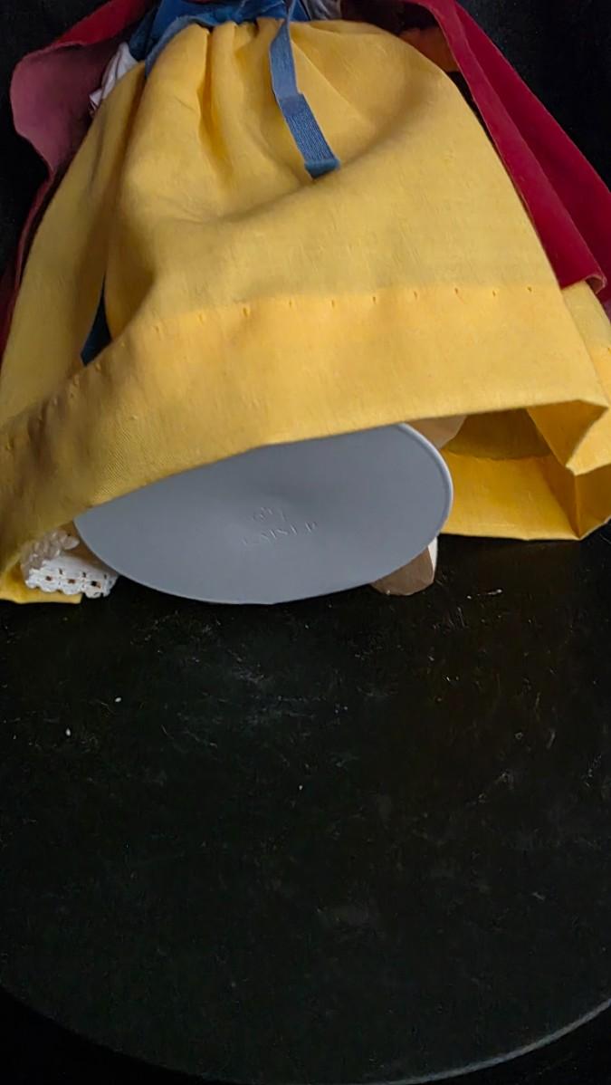 Standing approximately 11 inches tall, this vinyl doll features striking sleepy blue eyes that open and close, delicate painted lashes, and softly blushed cheeks that evoke the innocence of the classic tale. Her dark brown rooted hair, styled in the timeless Snow White bob, perfectly complements her iconic costume: a yellow satin skirt, royal blue velvet-style bodice with ribbon ties, and a deep red felt cape with white collar — true to the beloved animated design.