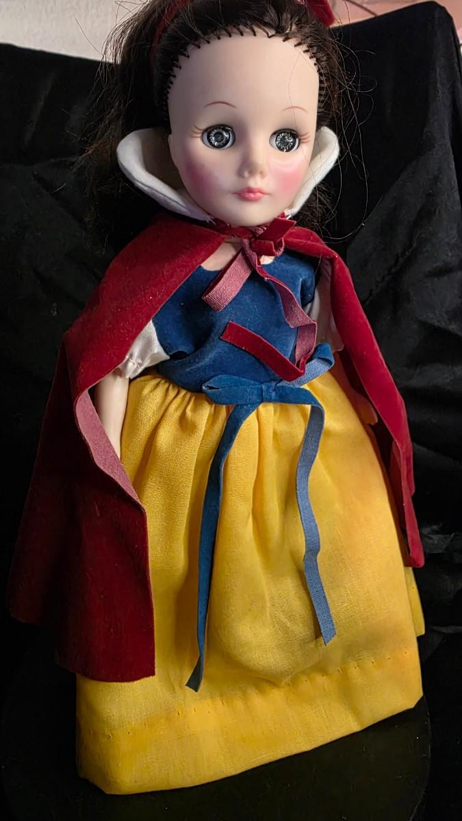 Standing approximately 11 inches tall, this vinyl doll features striking sleepy blue eyes that open and close, delicate painted lashes, and softly blushed cheeks that evoke the innocence of the classic tale. Her dark brown rooted hair, styled in the timeless Snow White bob, perfectly complements her iconic costume: a yellow satin skirt, royal blue velvet-style bodice with ribbon ties, and a deep red felt cape with white collar — true to the beloved animated design.