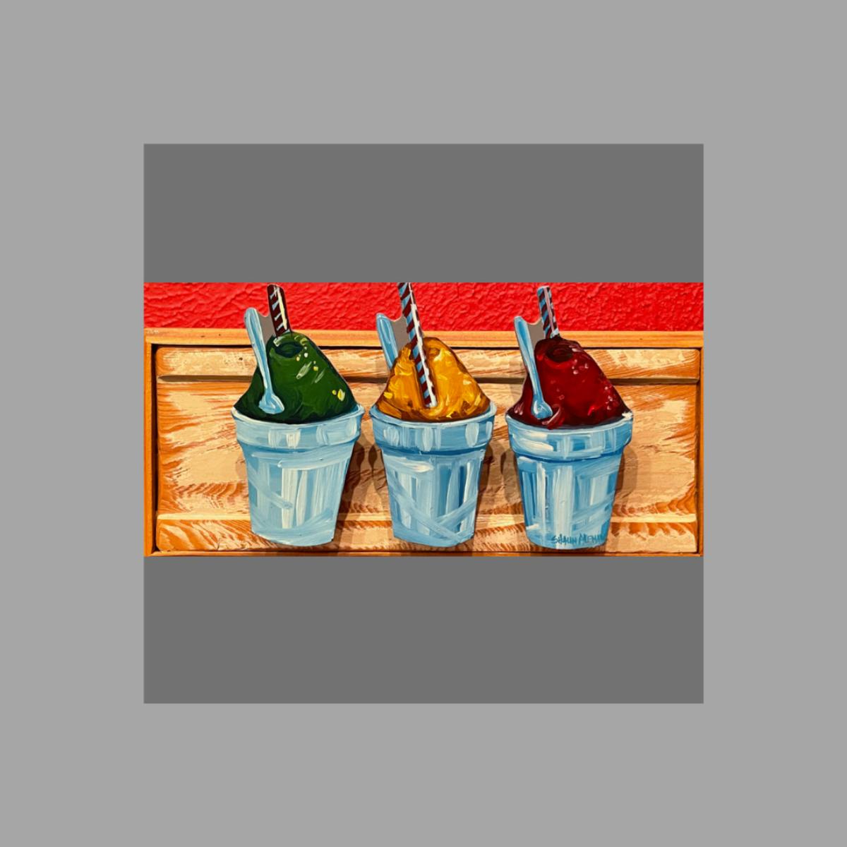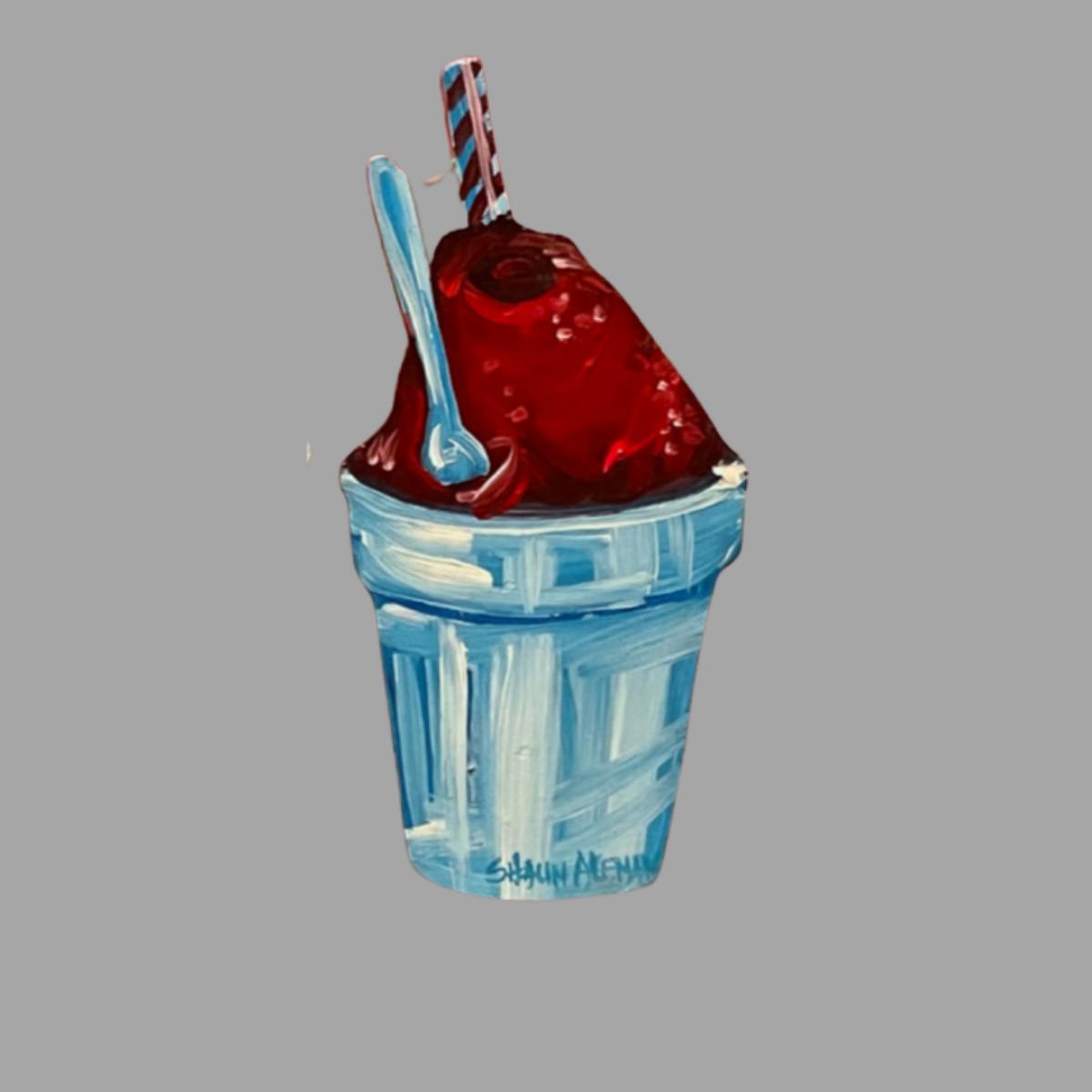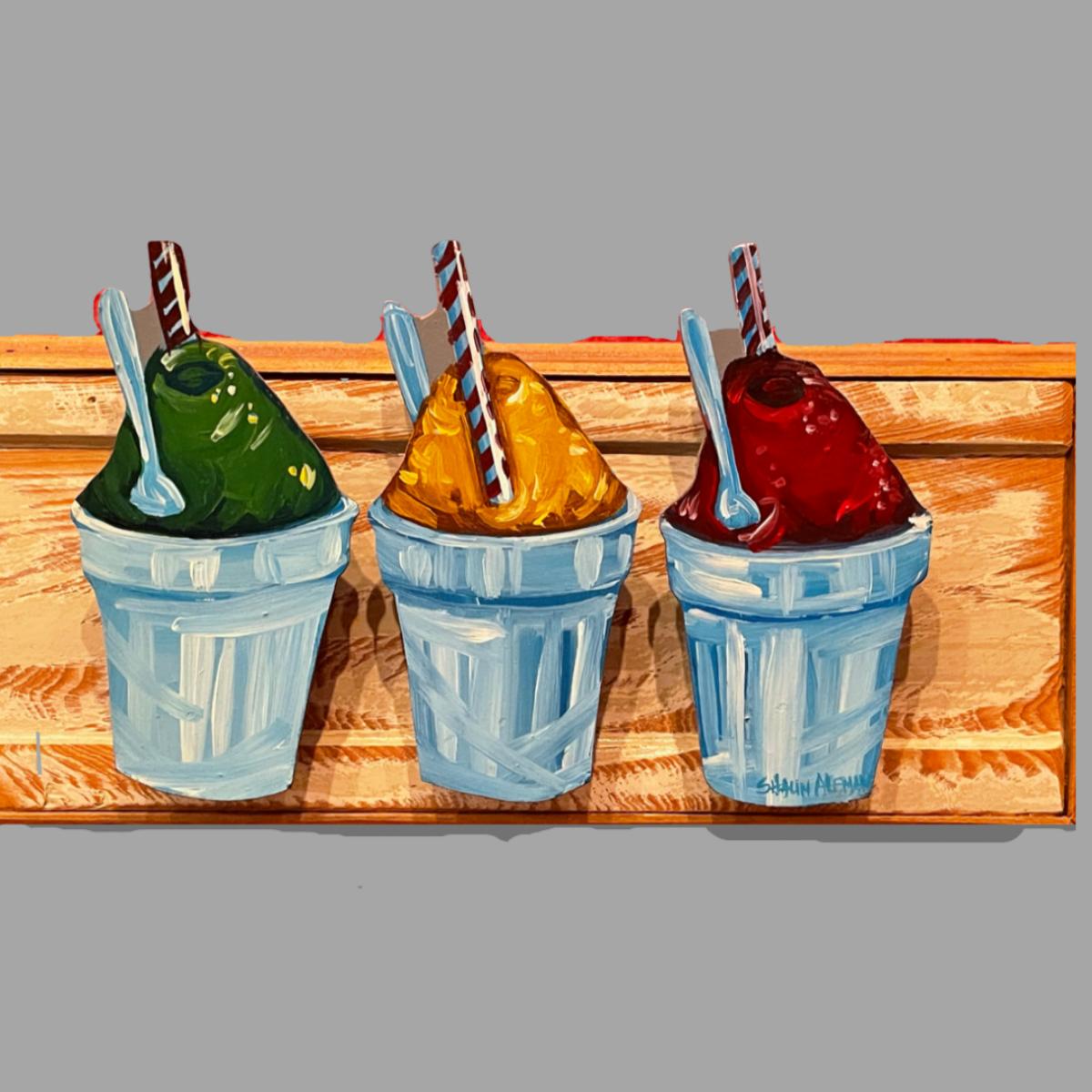 Lifelong resident of South Louisiana Shaun Aleman creates images that reflect the uniqueness and culture of the region. The food, music, local festivals and even the catch phrases of the area lend themselves to his paintings and drawings. The back of the wood is signed as well as the red snowball.