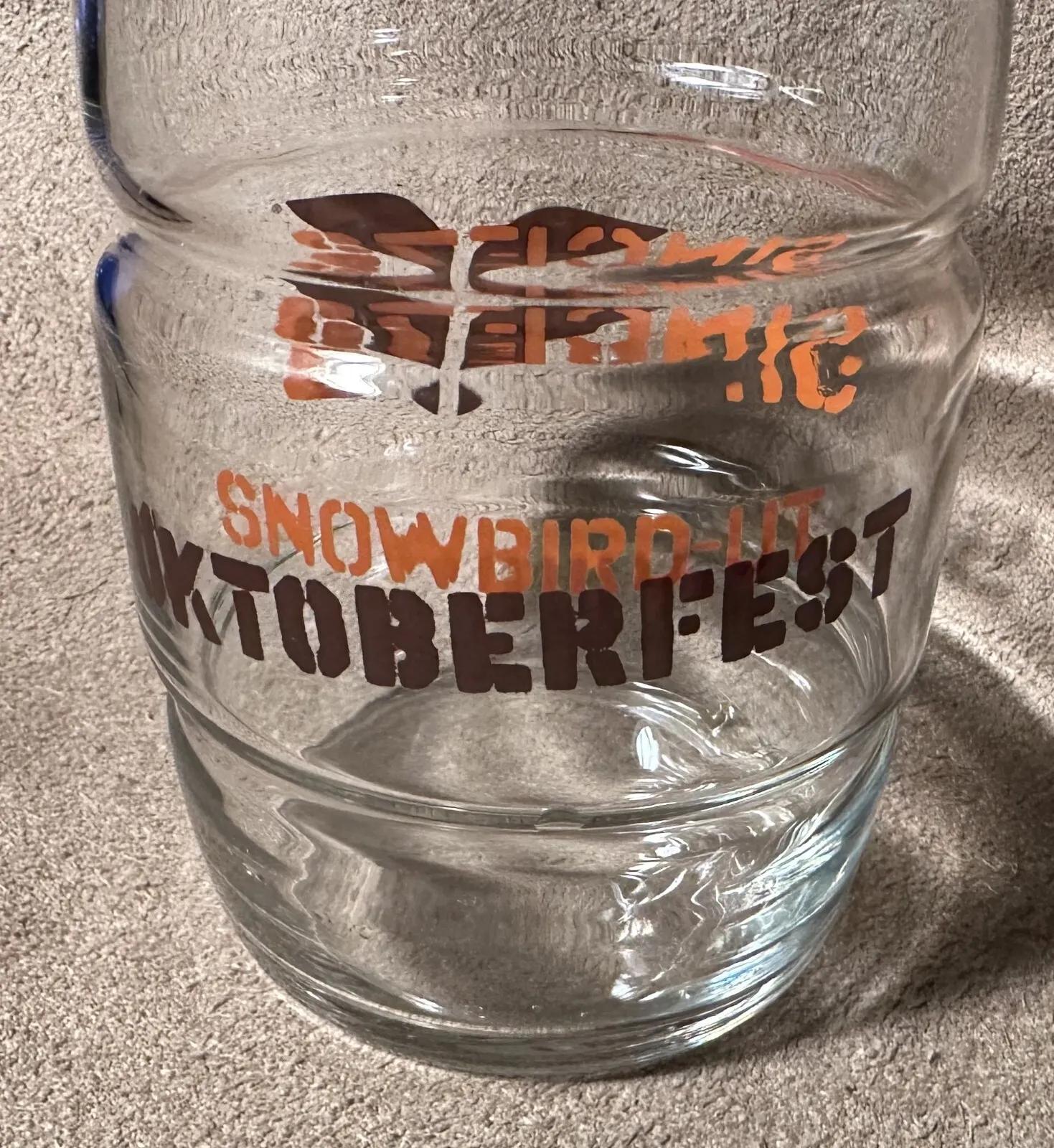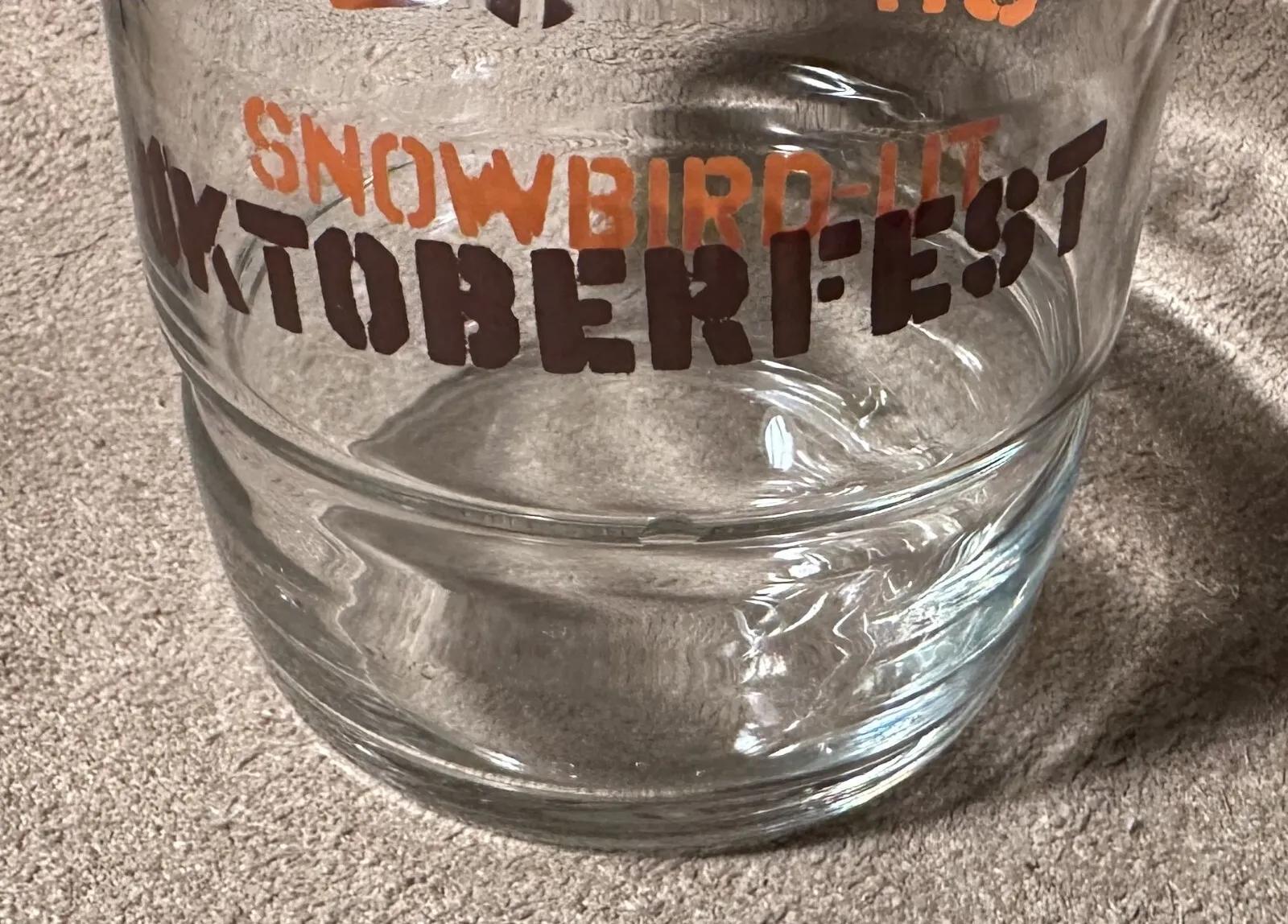 Excellent condition on this 14oz glass from a past Oktoberfest at Snowbird Ski Resort in Utah...Going on every fall since 1972...This glass stands 4 5/8"...No wear on transfers.