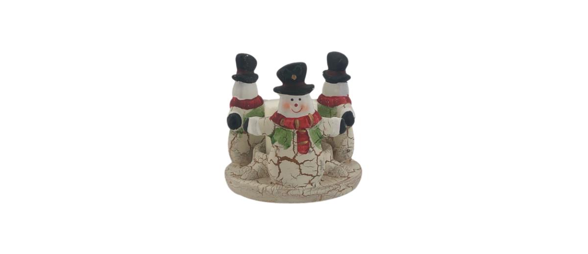 Adorable snowmen holding hands candle holder that fits votive or tea sized candles. Made to look like cracking paint, a few paint chips here and there, overall super cute decor piece! 3.75” x 3.5”. Candle not included.