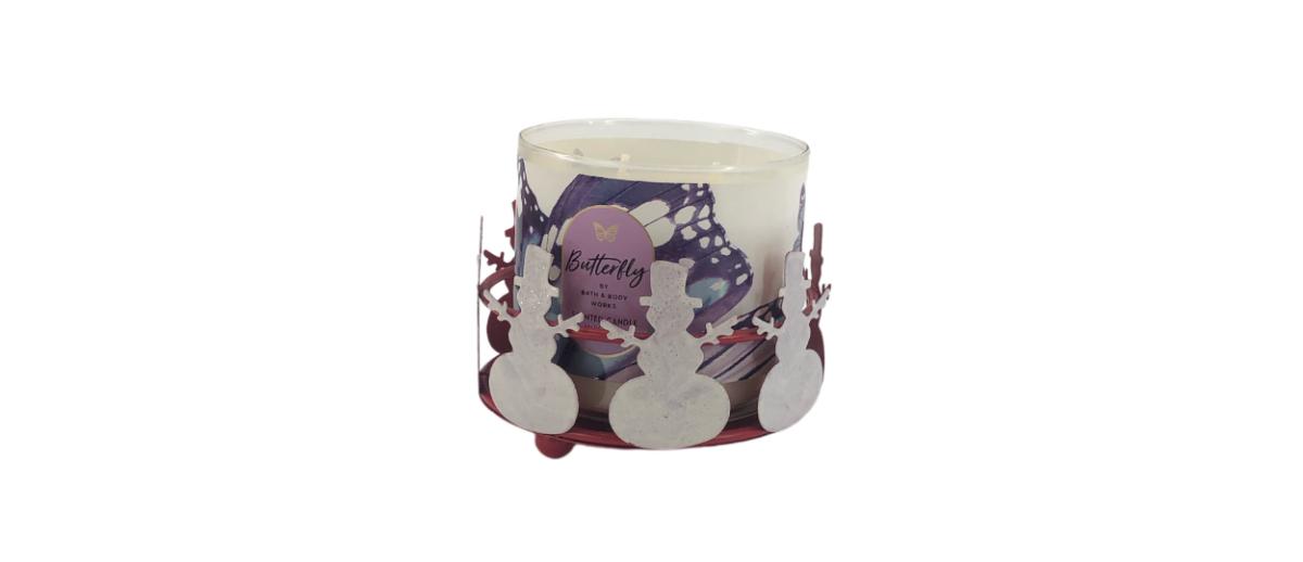 Red and white snowman candle holder. Fits Bath & Body Works 3-wick candles or similar sizes. Measures 4.5” inside diameter and 3” in height. Unbranded, candle not included.