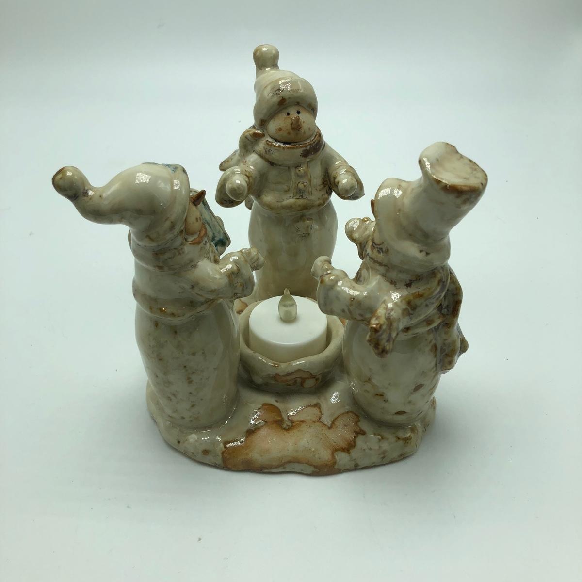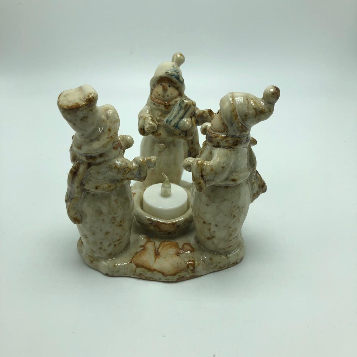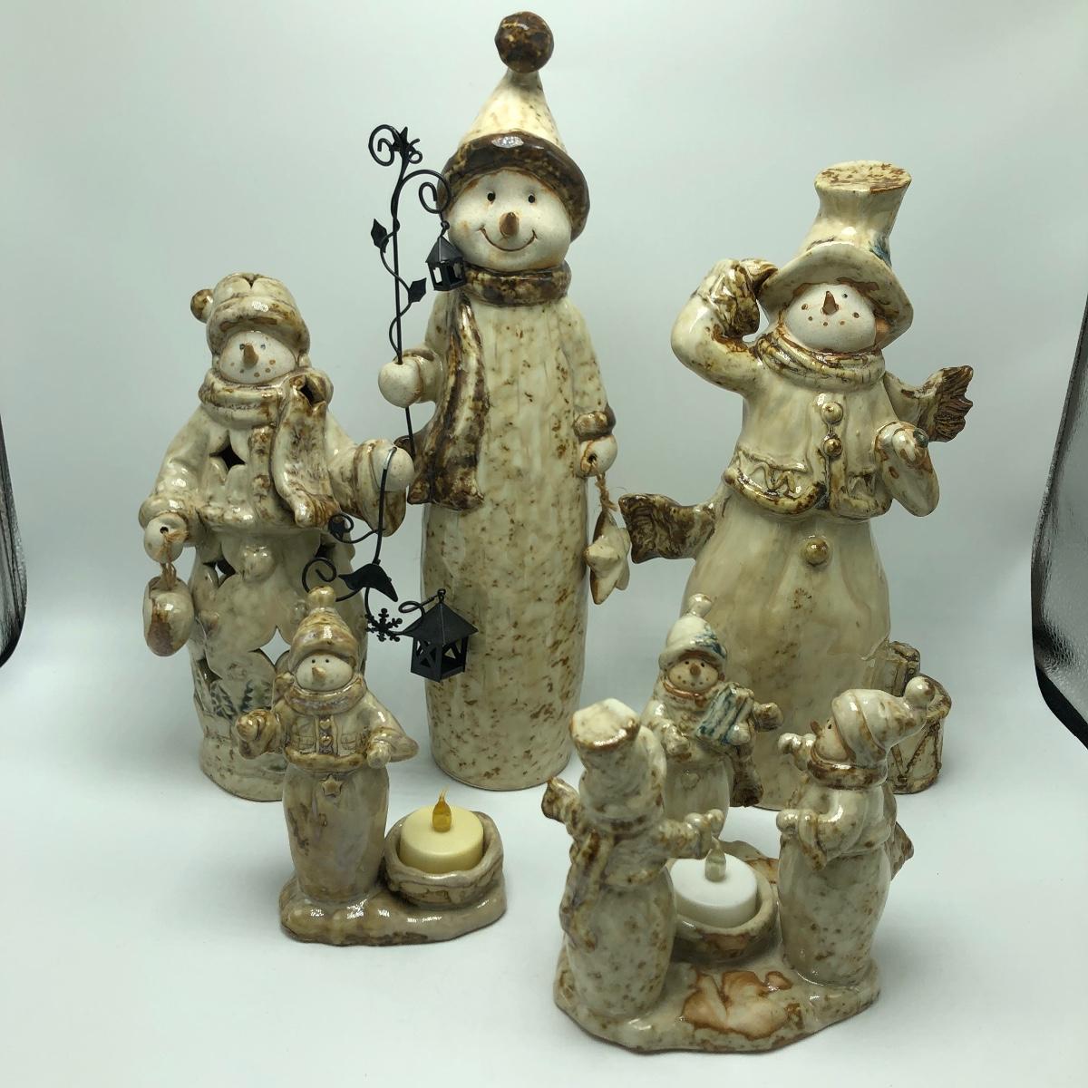 Lot includes a collection of five ceramic snowmen with three having a place for tea lights.