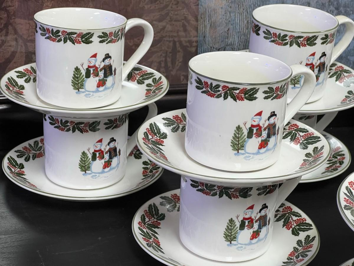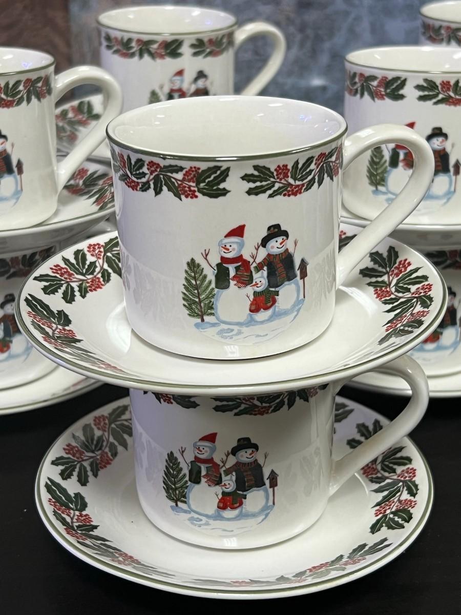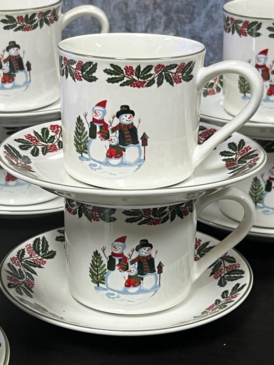 Snowman Family & Holly Christmas Holiday Cups and Saucers. GEI Design