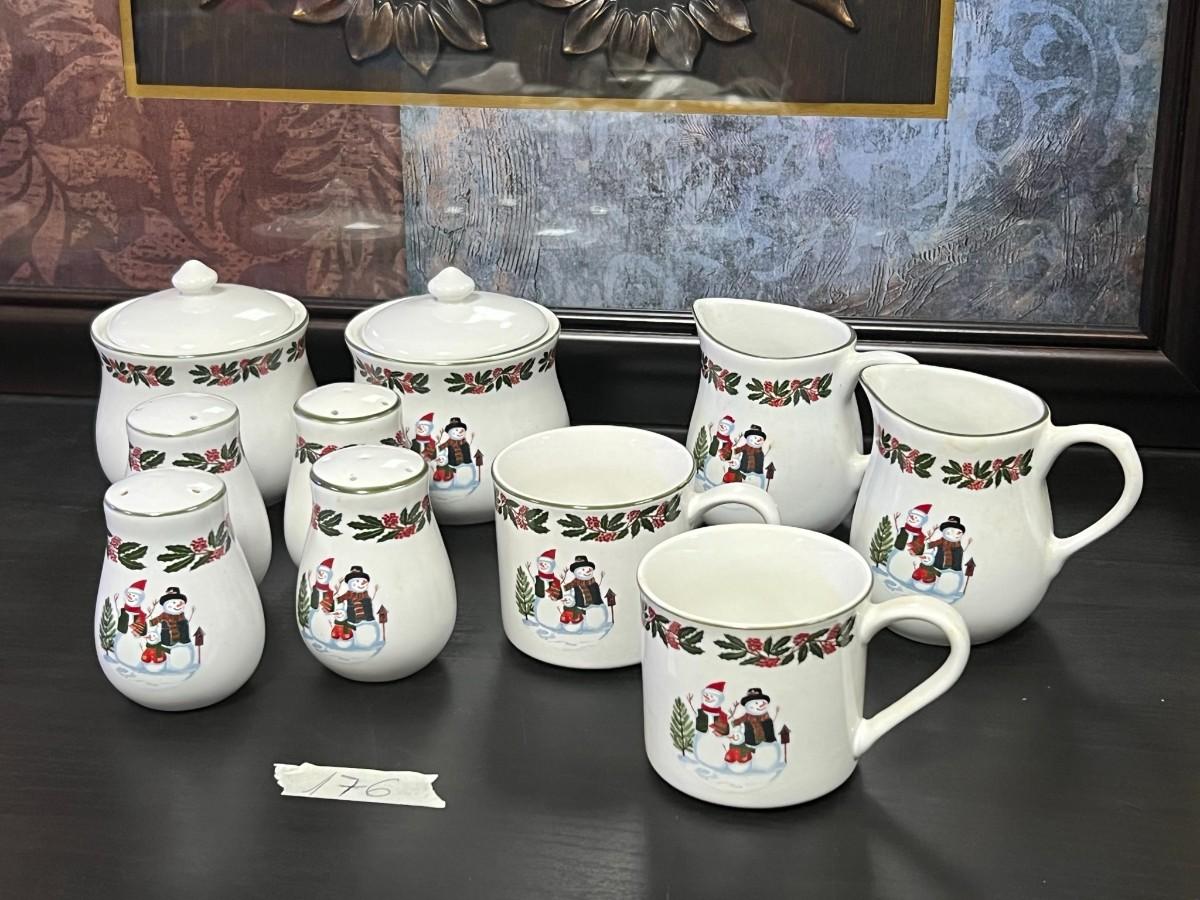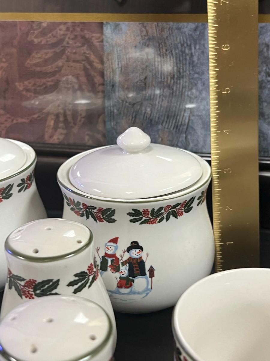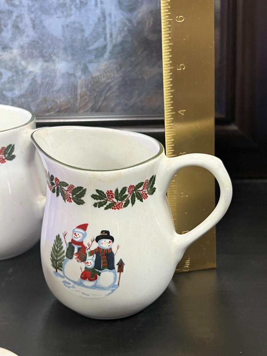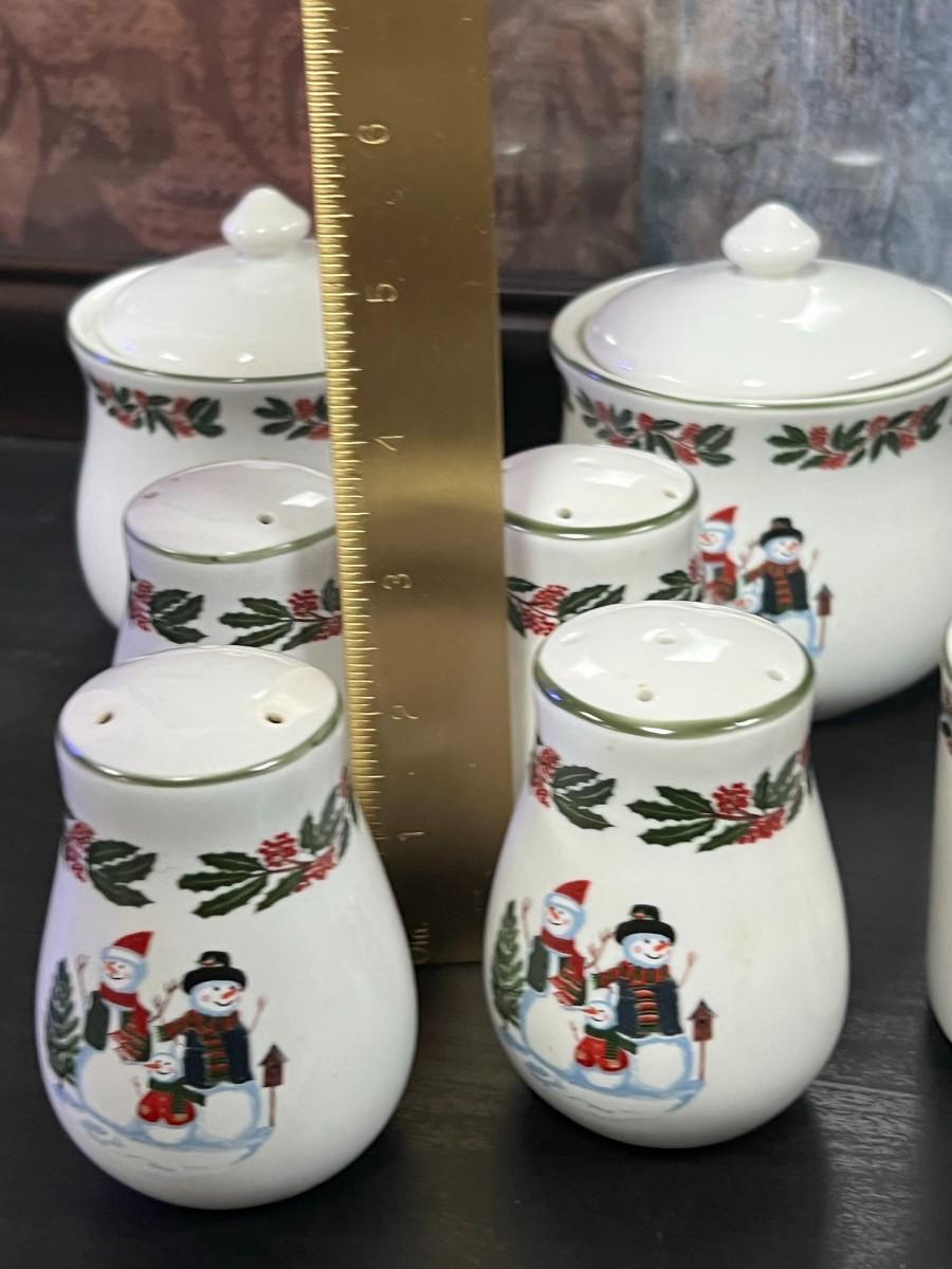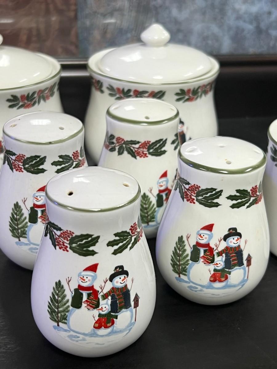 Snowman Family & Holly Christmas Holiday. Creamers, Sugar pots, Pepper And Salt and Mugs.