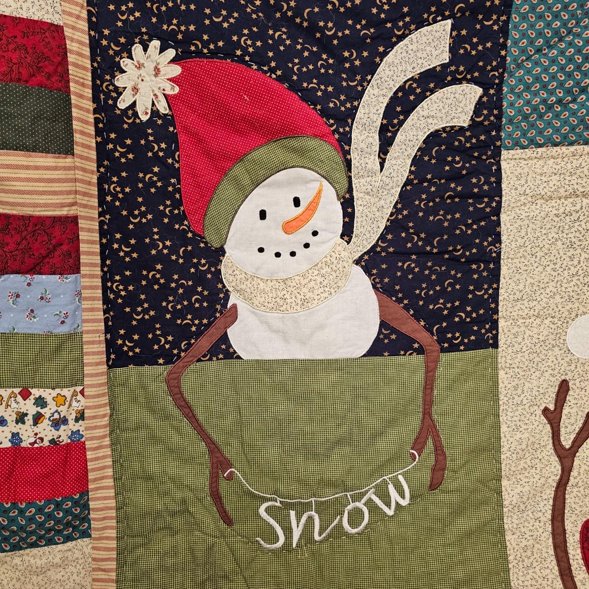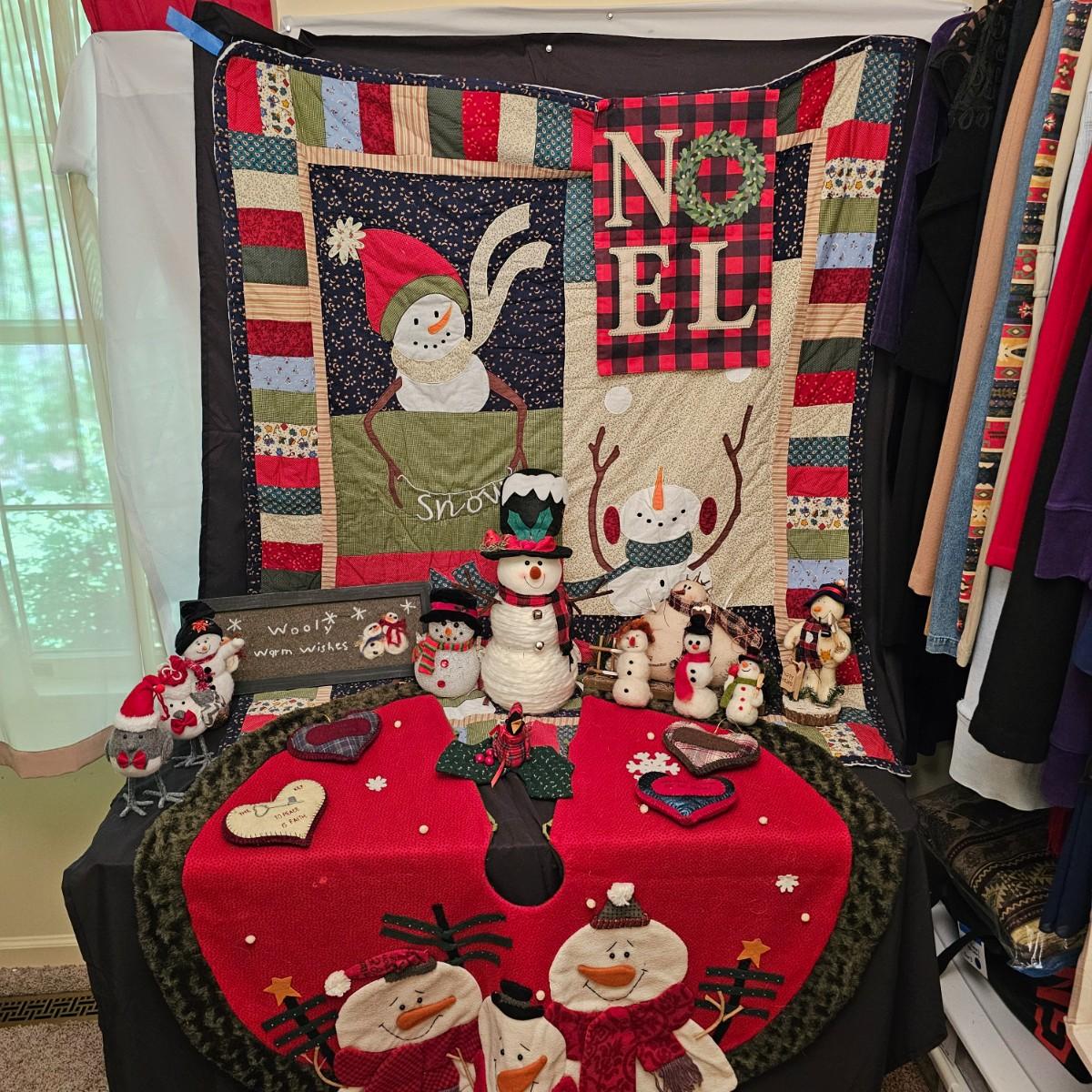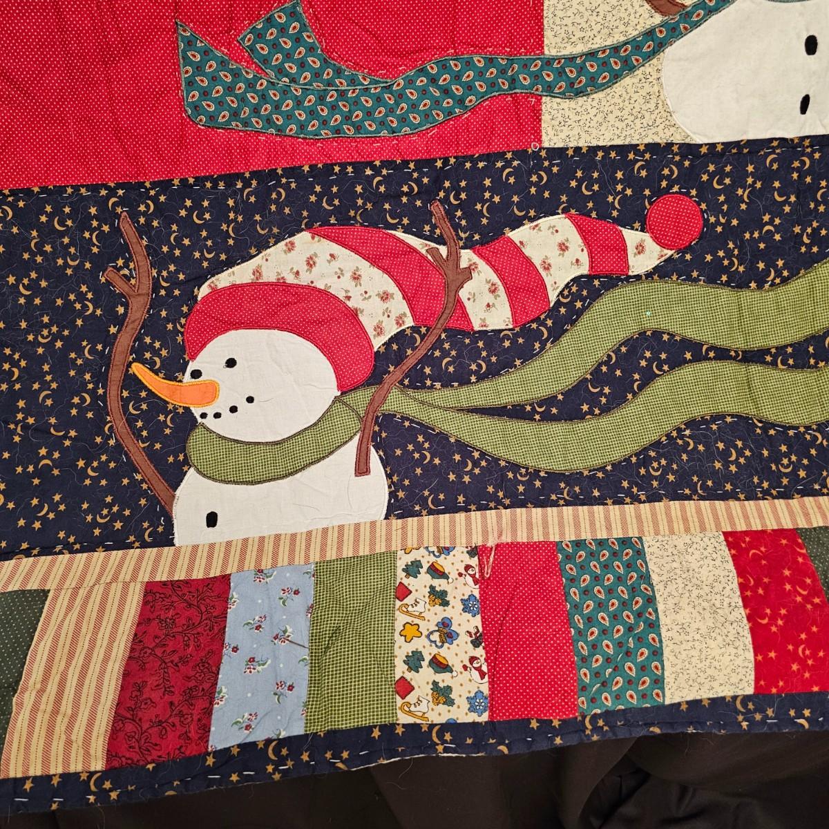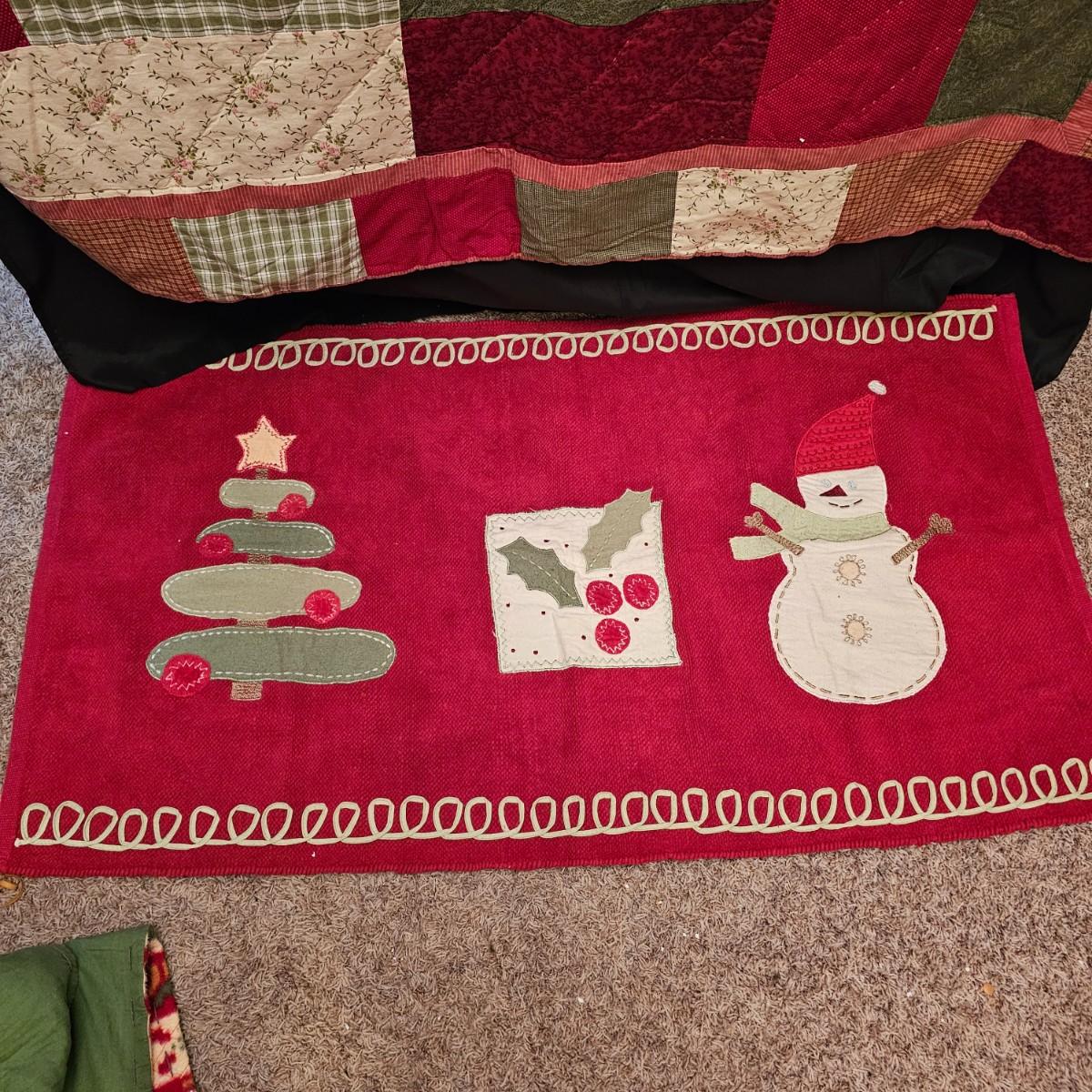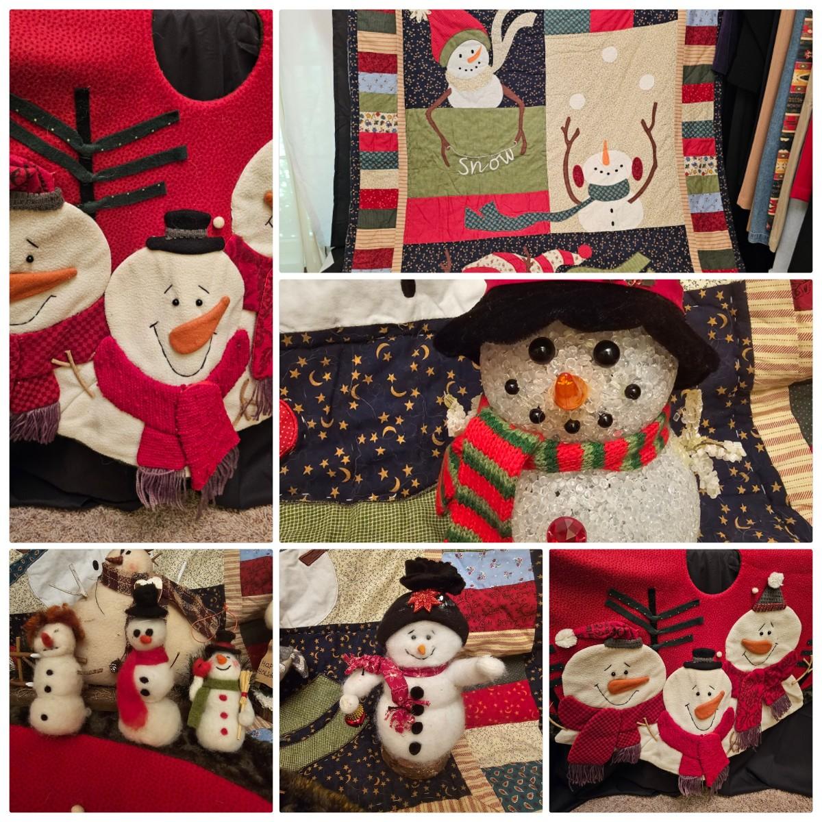 Cheerful, happy friendly snowmen and more abound in this collection.there are stationary figures, birds, a banner, tree skirt quilts. Most all items are soft plush or fabric. Tree skirt is 42"D, Noel hanger is 12" x 17" and has a pocket at top. Framed piece is 18" x 7"H. A few small spots on the tree skirt and also some pet hair throughout. Redbird quilt is 62" x 80", snowman rug is 52" x 29", Santa quilt is 40" x 56" and table runner is 12" x 70". See photos for details. Shipping available.