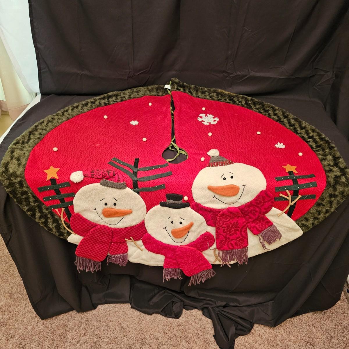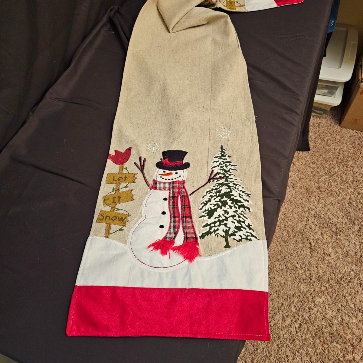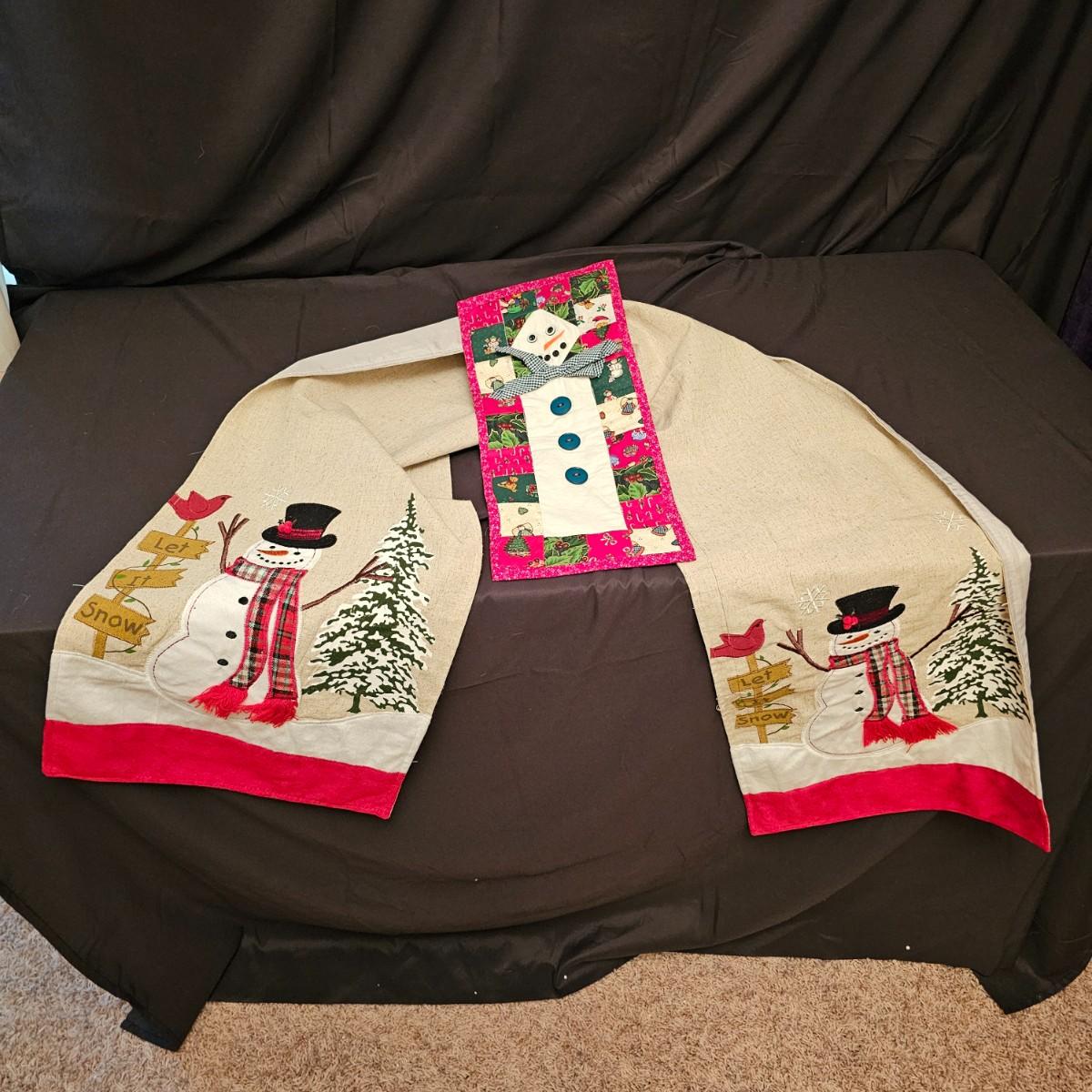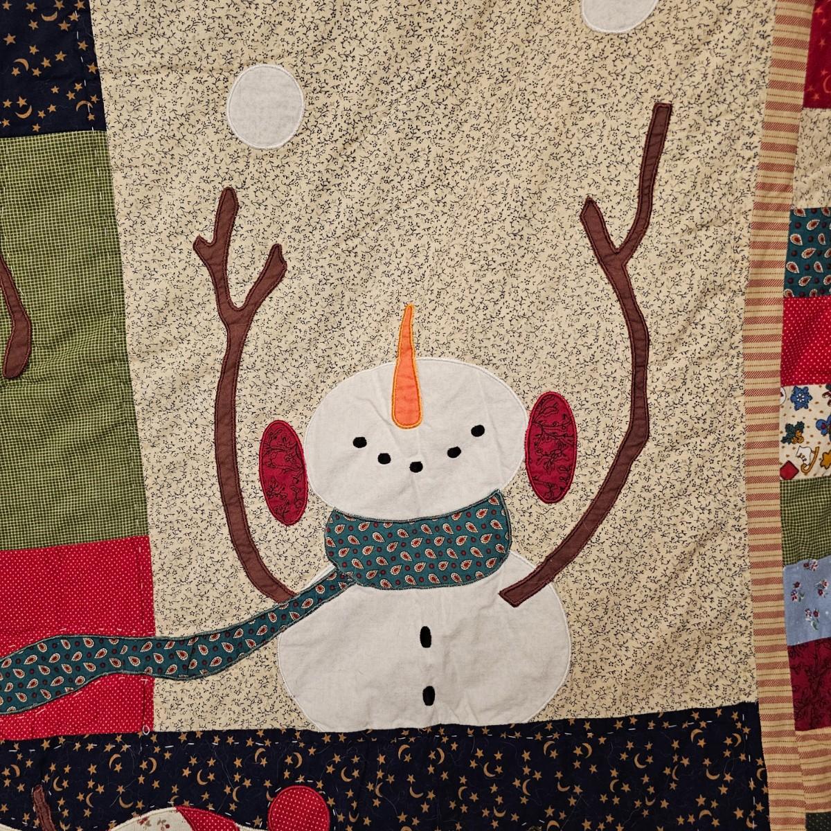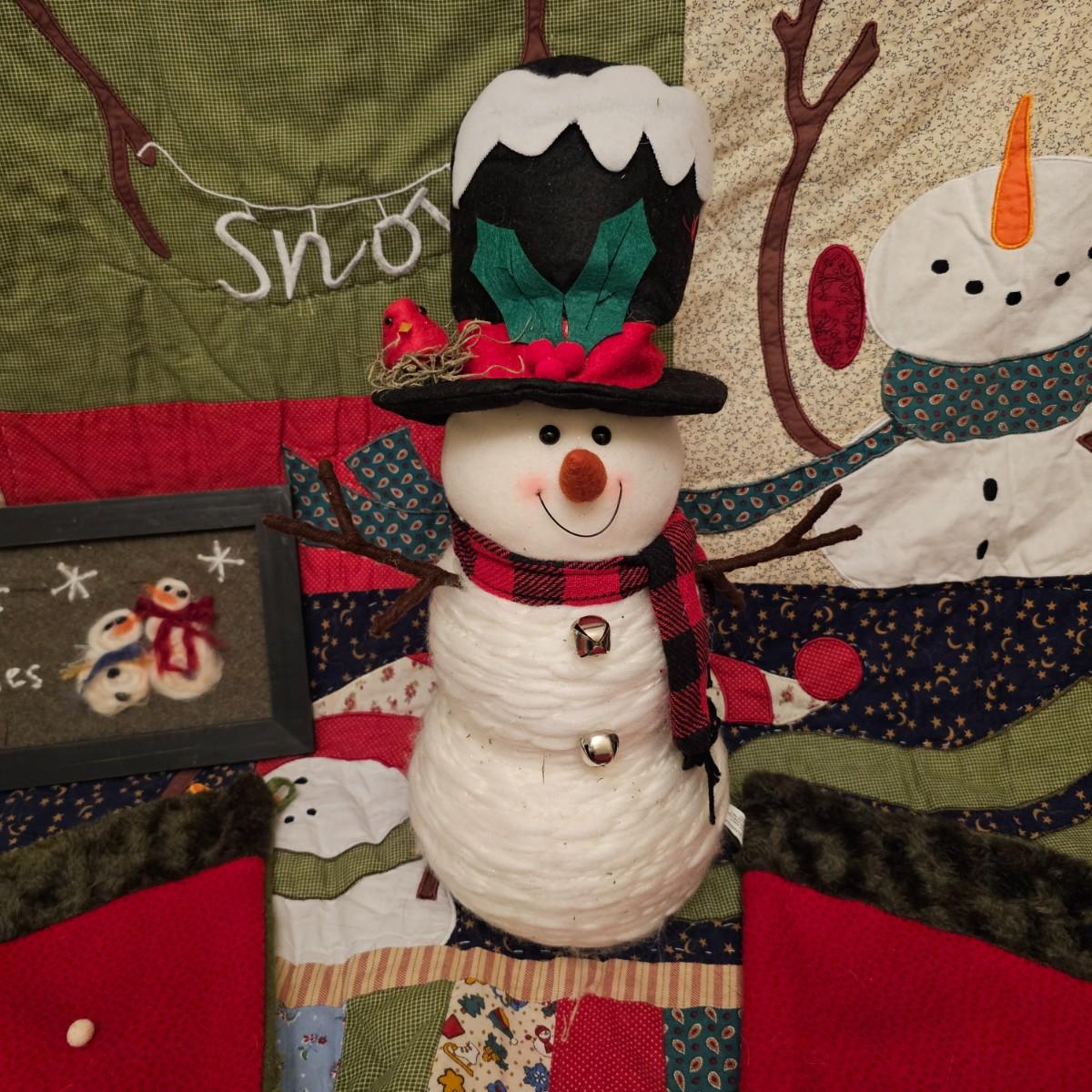 Cheerful, happy friendly snowmen and more abound in this collection.there are stationary figures, birds, a banner, tree skirt quilts. Most all items are soft plush or fabric. Tree skirt is 42"D, Noel hanger is 12" x 17" and has a pocket at top. Framed piece is 18" x 7"H. A few small spots on the tree skirt and also some pet hair throughout. Redbird quilt is 62" x 80", snowman rug is 52" x 29", Santa quilt is 40" x 56" and table runner is 12" x 70". See photos for details. Shipping available.